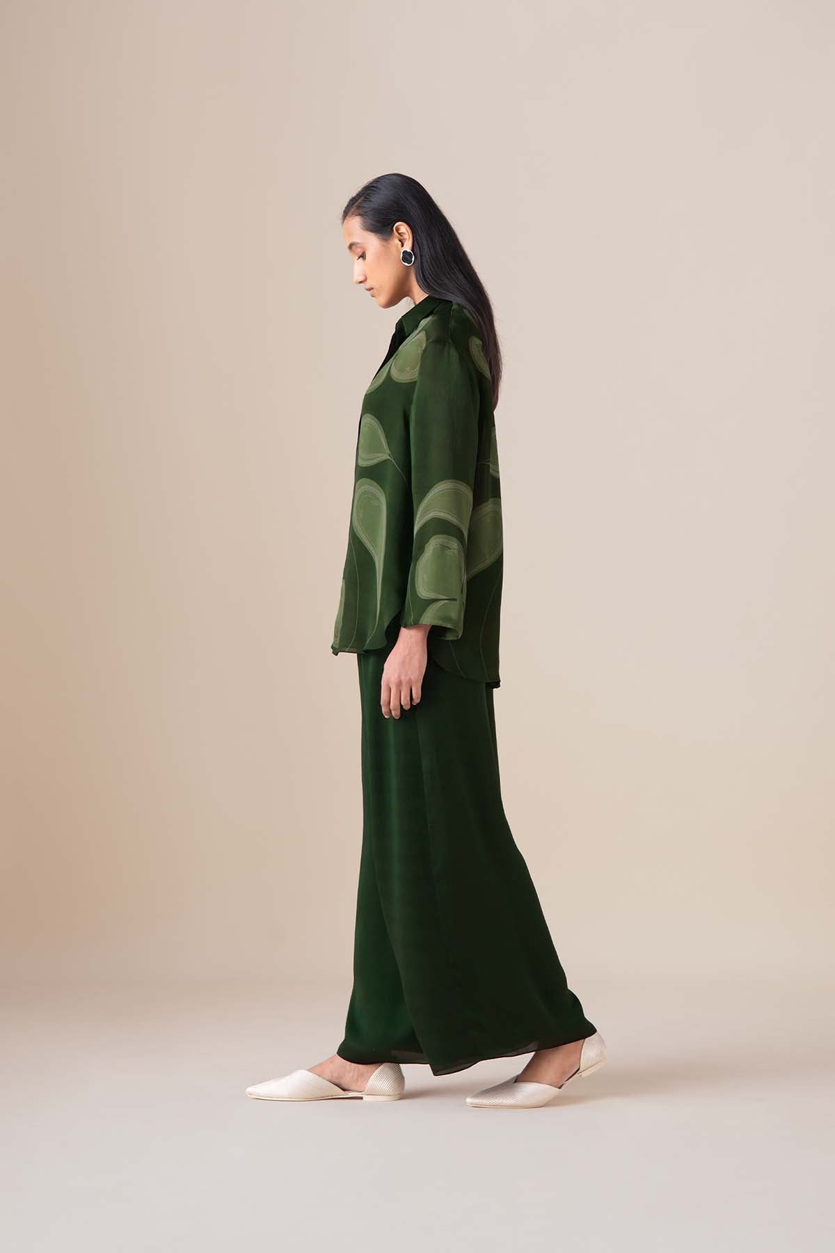 Forest green satin organza falls in relaxed yet graceful lines of the elah shirt. Inspired by the delicate craft of filigree, fine lines unfold across the leaf green motifs of flora and fauna. Finished with a matching inner slip in a dark green hosiery, elah is comfort given fashionable form.