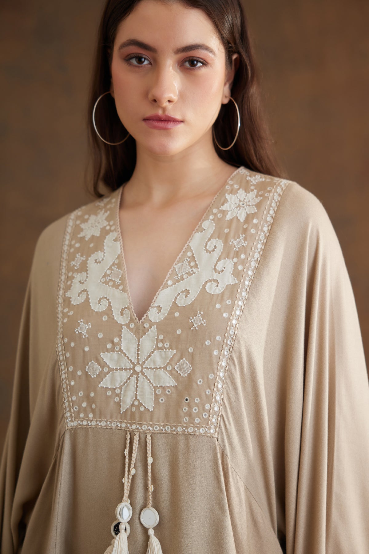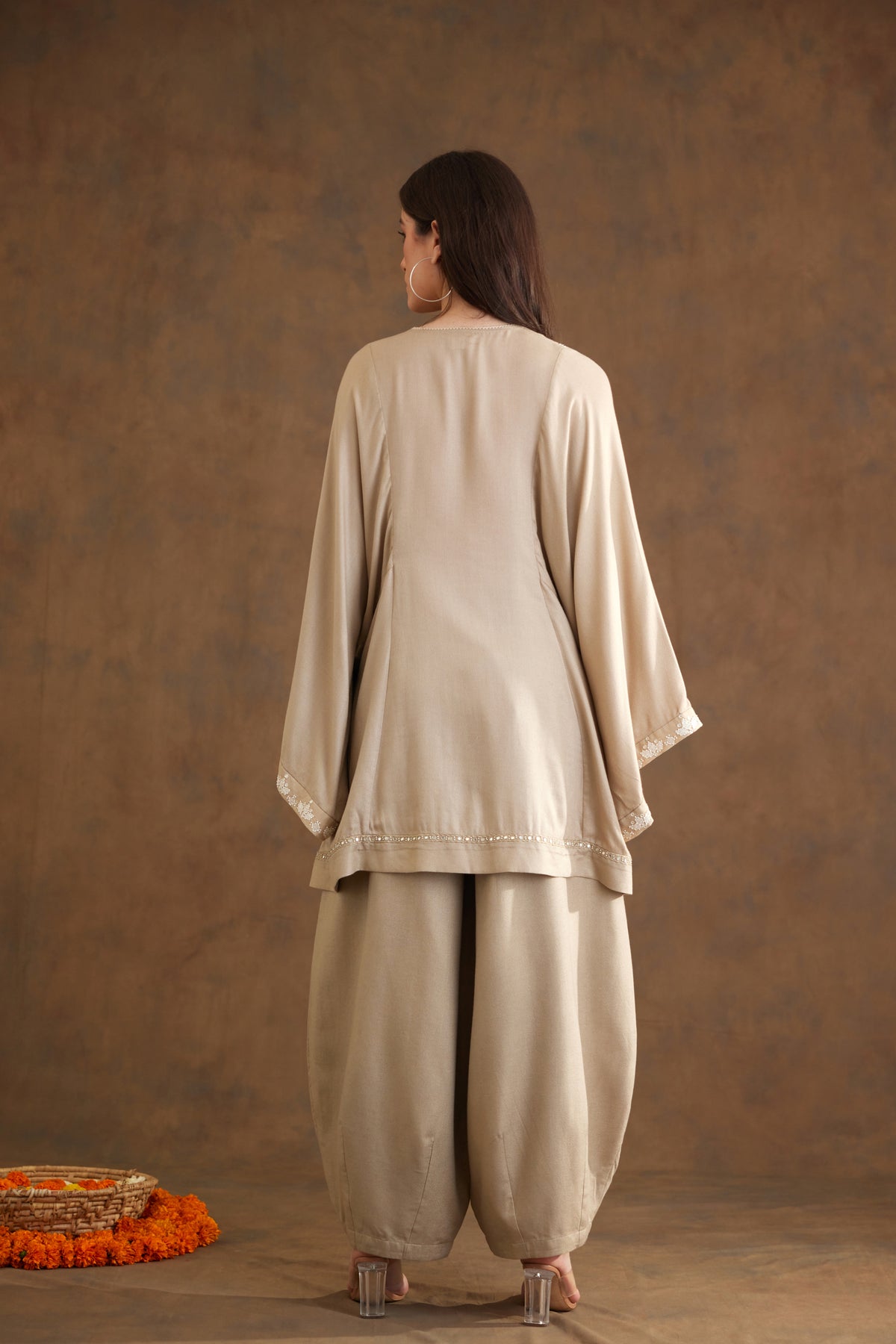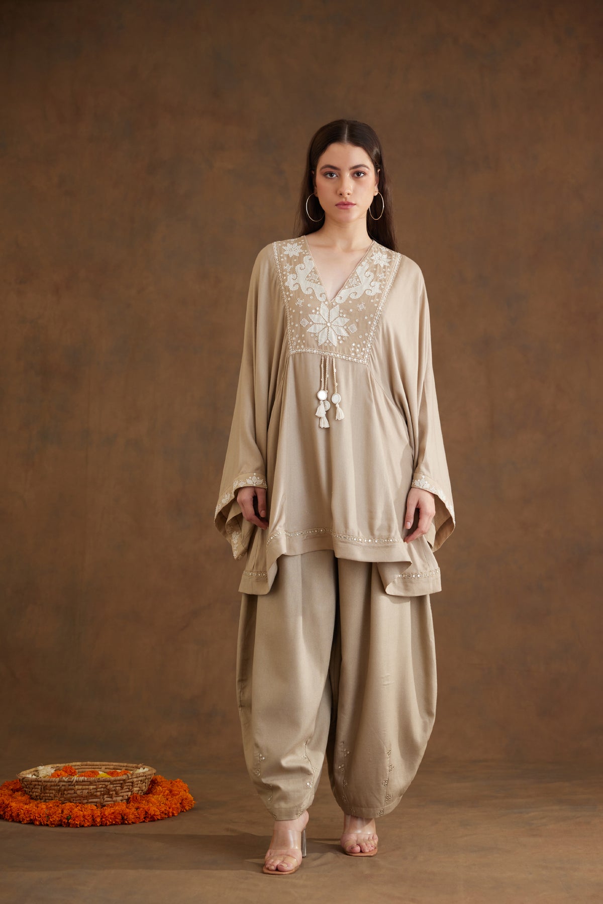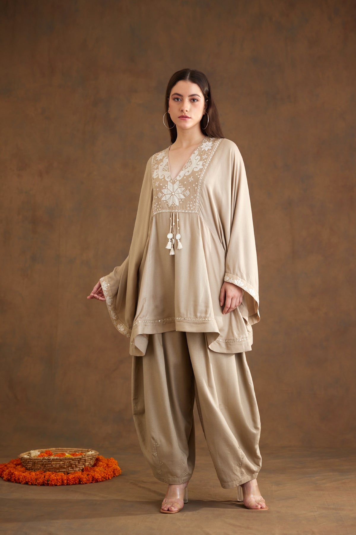Featuring Fawn Kaftan top in Rayon moss with applique embroideries highlighted with beads on the yoke and sleeves. It is paired with a matching baggy pants in rayon moss with mirror embroidery detailing.