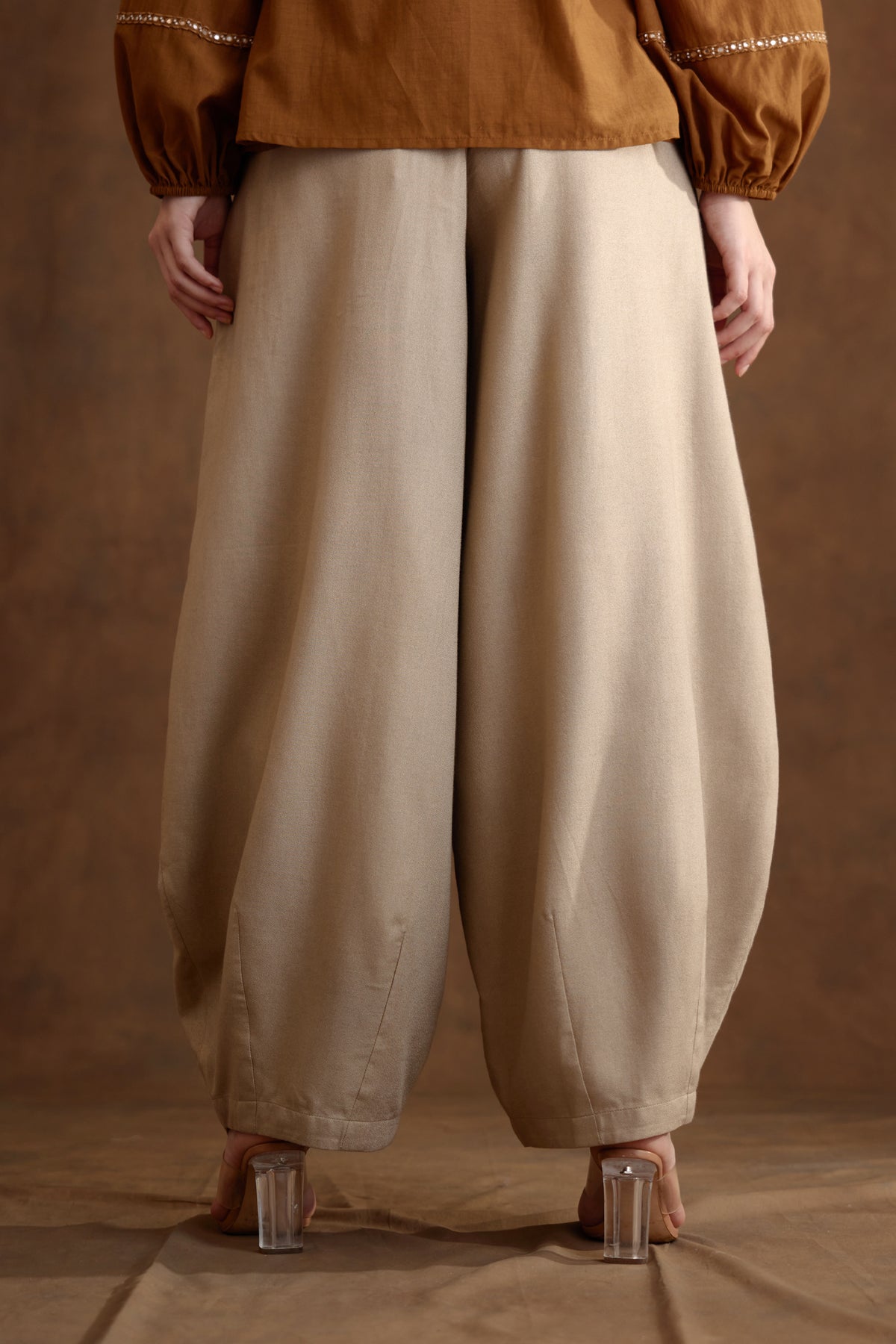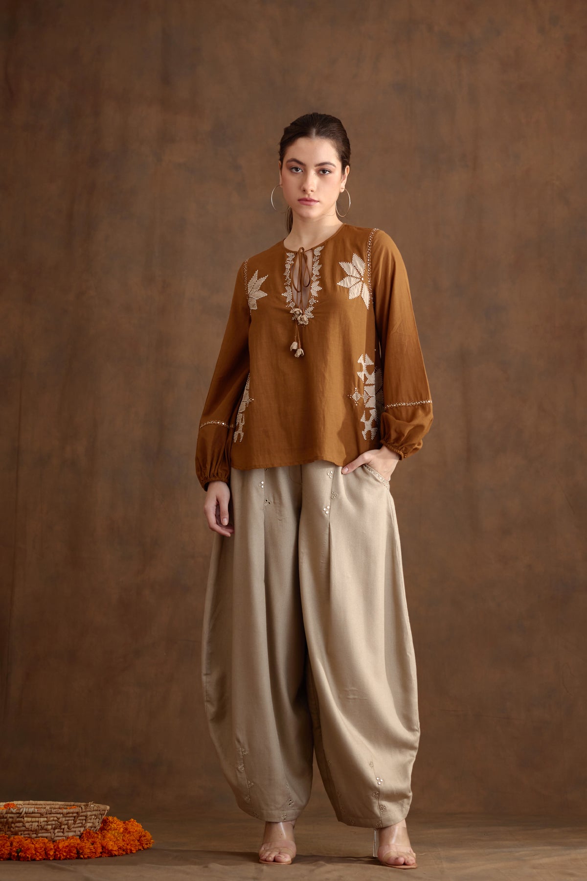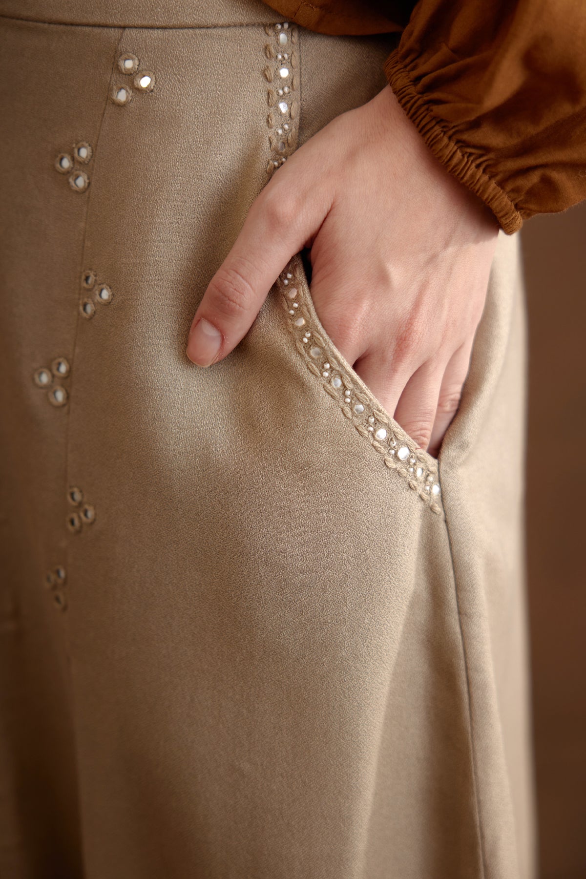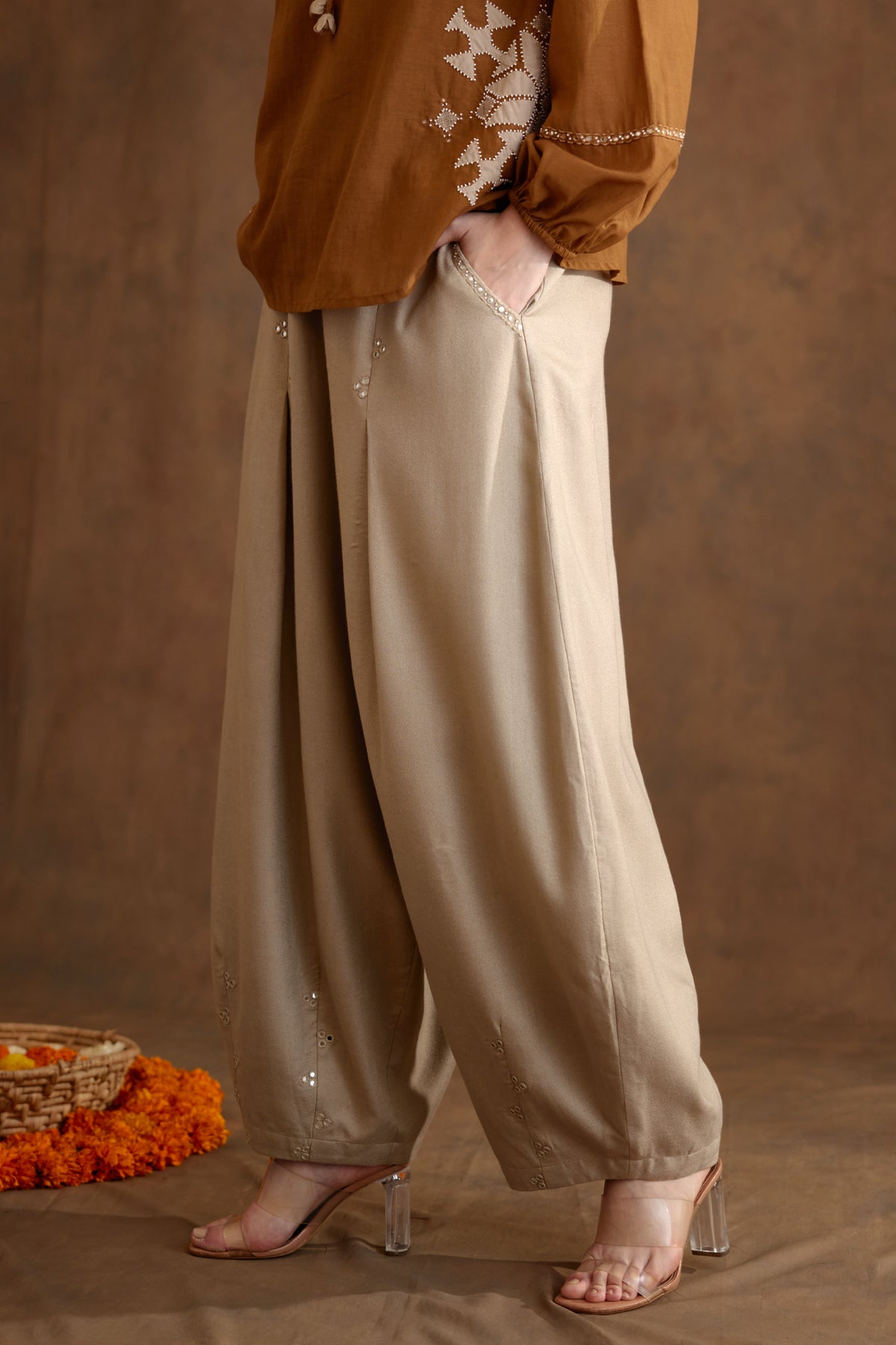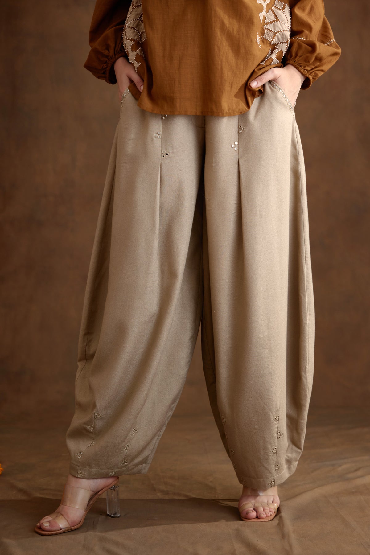 Featuring Fawn baggy pants in rayon moss with mirror embroidery detailing at the bottom and pockets.