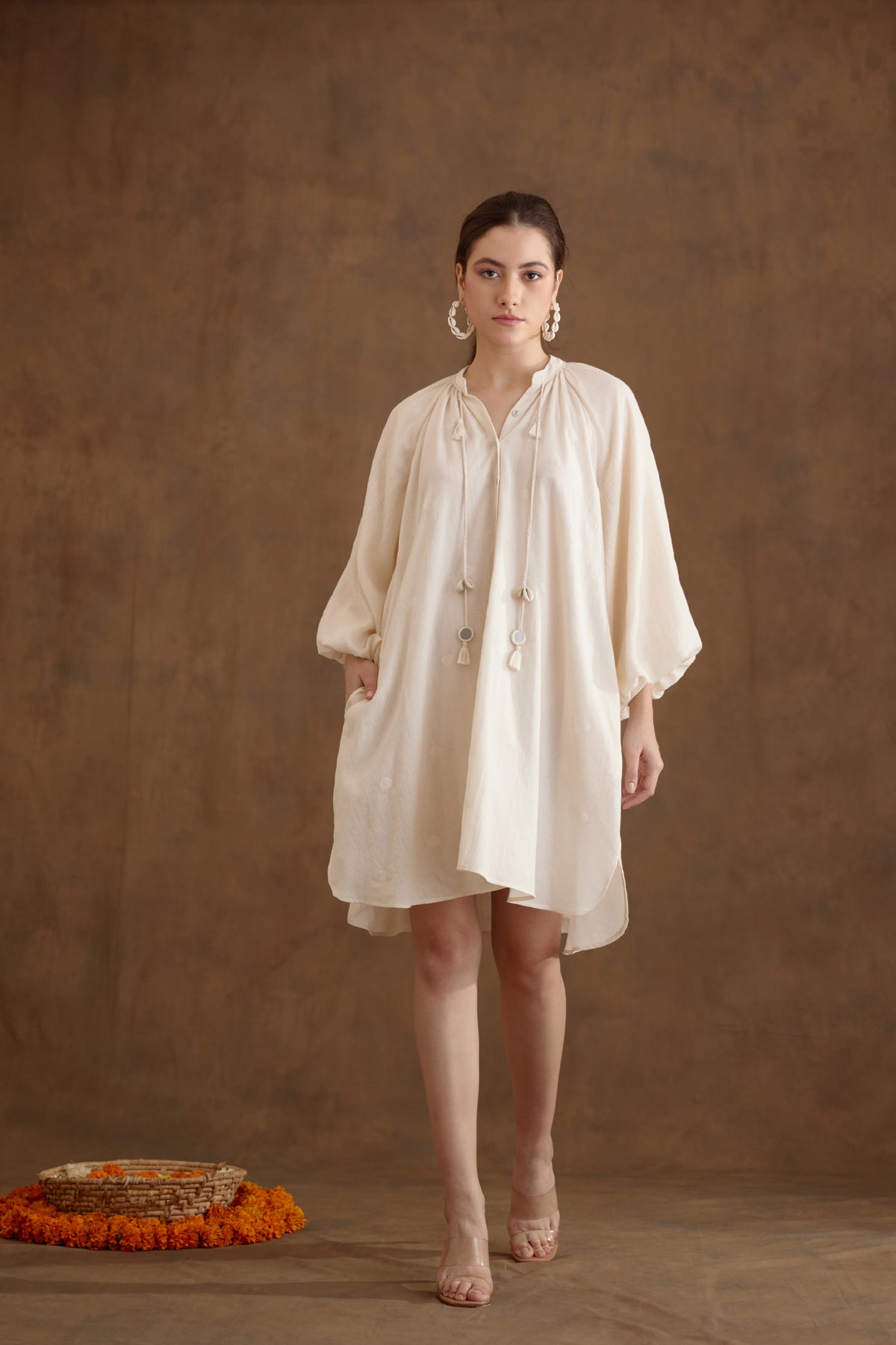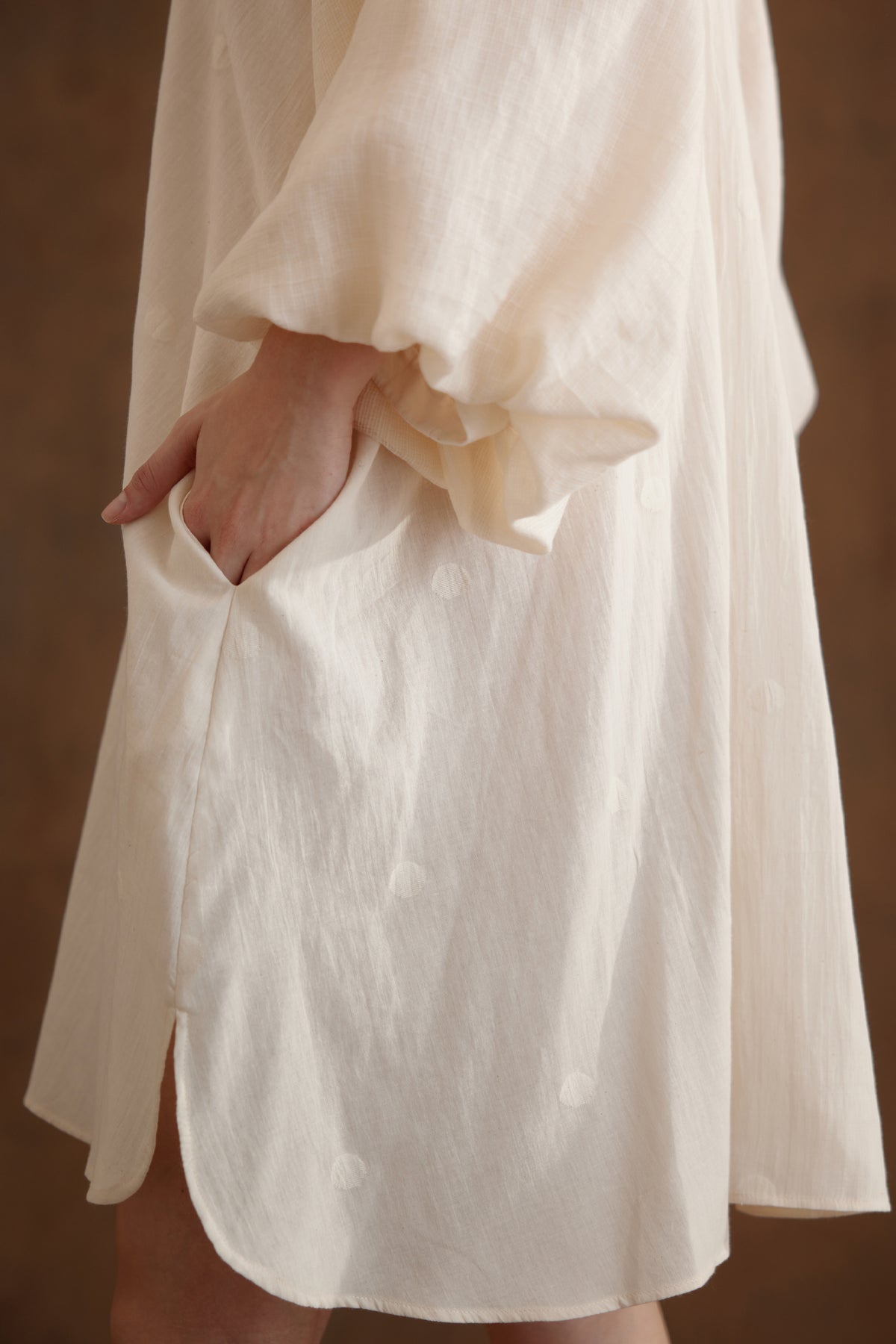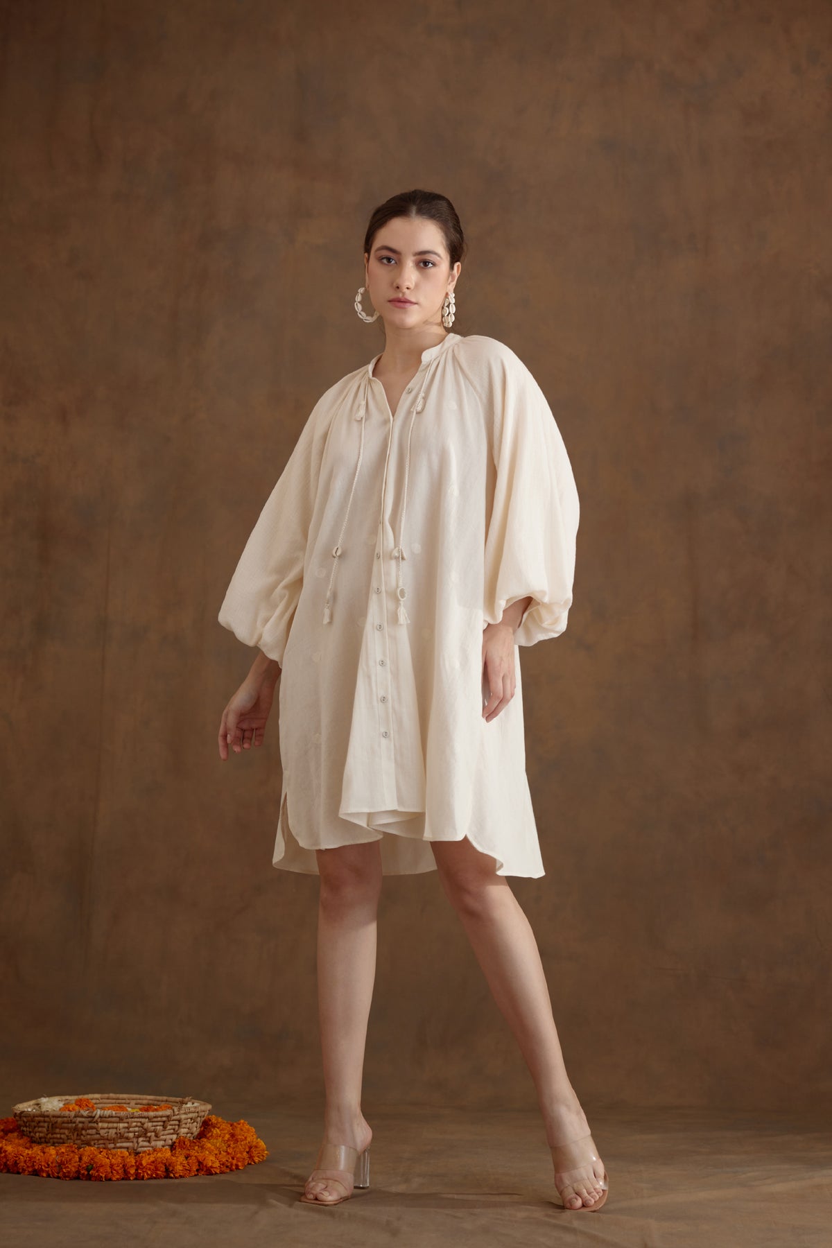 Featuring Cream handwoven polka dot jamdani shirt dress with hand-braided tassels details around the neckline.