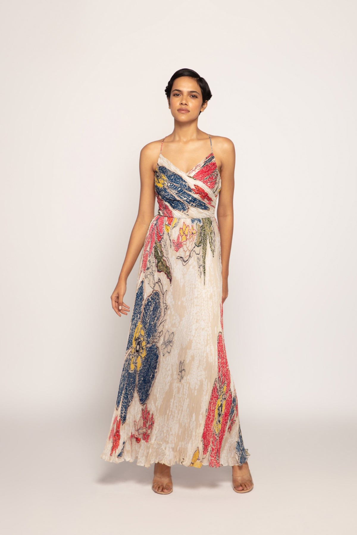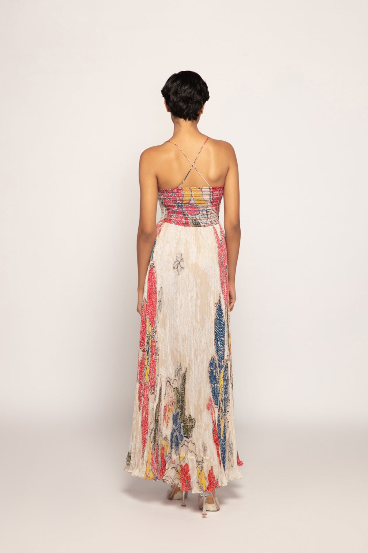 Periwinkle bandhani print, hand micro pleated cross over bustier maxi dress with adjustable straps