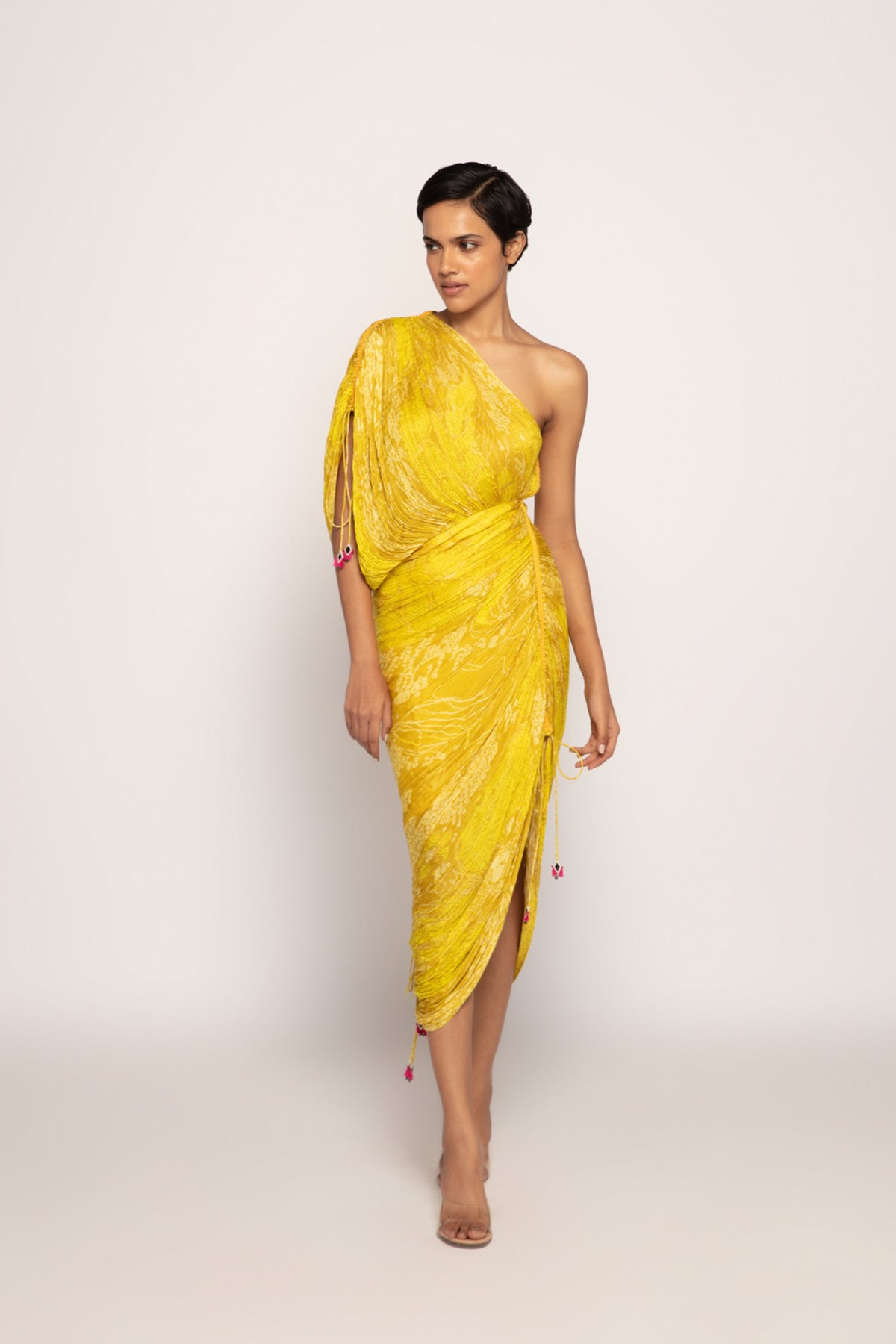 Perinwinkle bandhani print, hand micro pleated sari style dress with adjustable sleeve and length