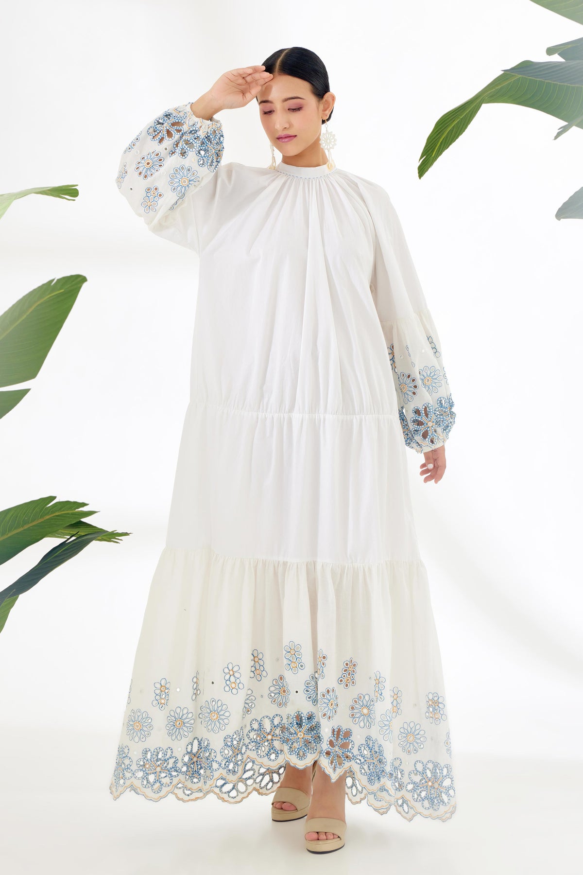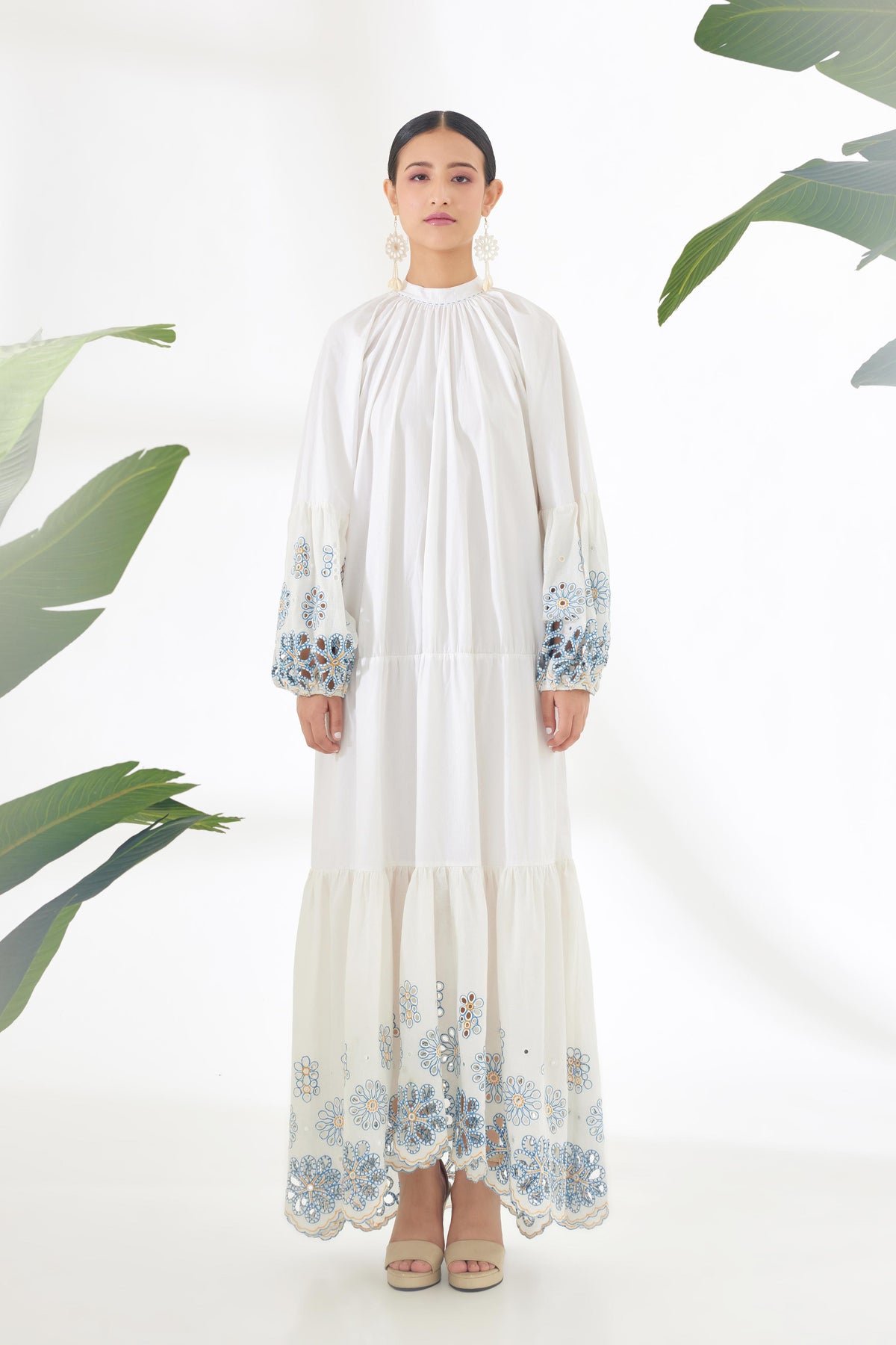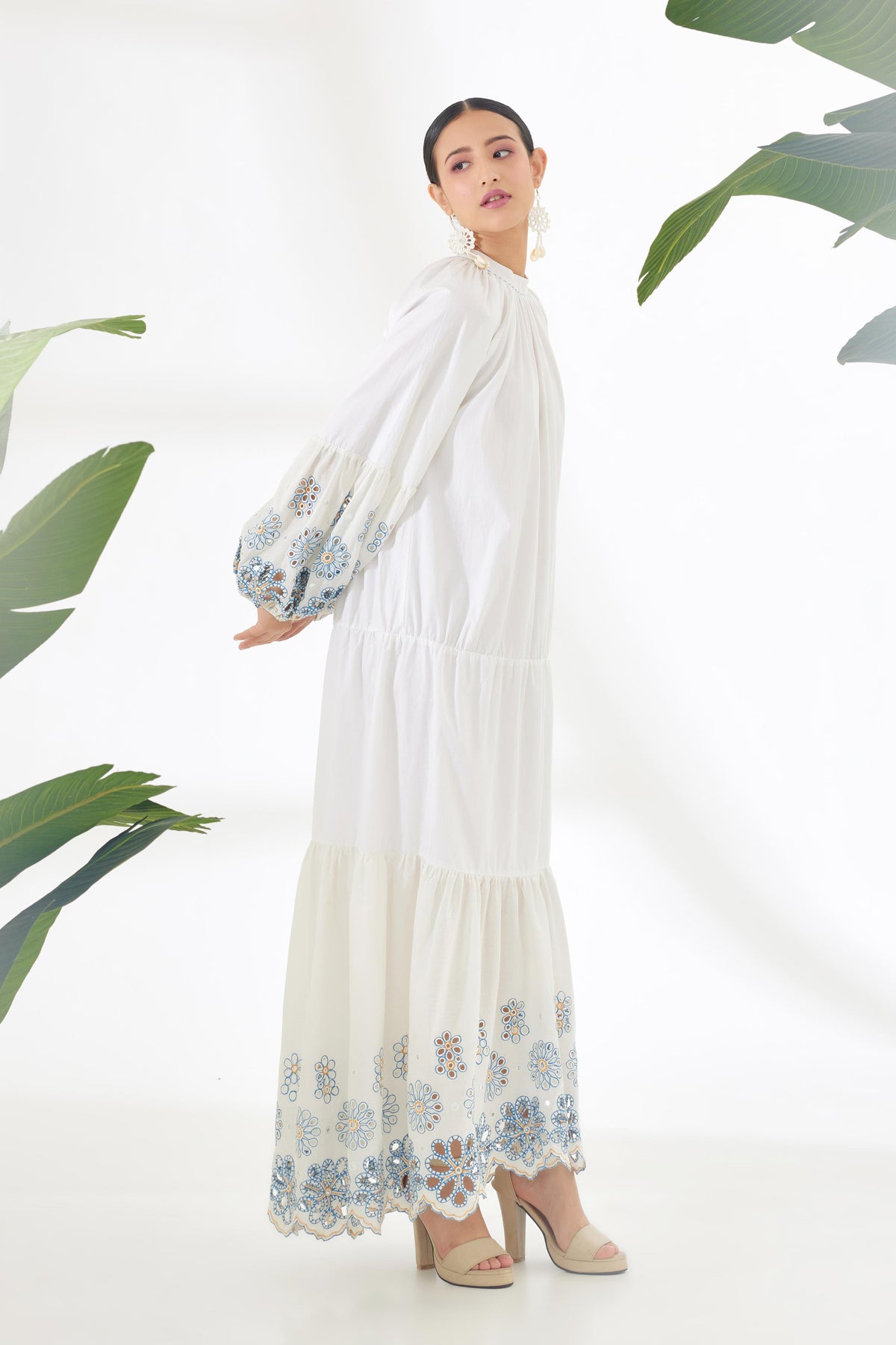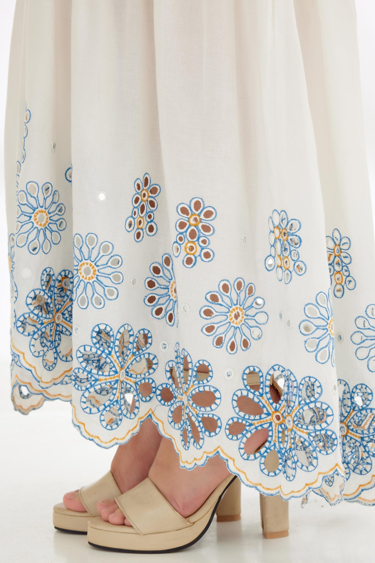 Ivory hand embroidered mirror work schiffli tier dress with cutwork in the hemline in 100% cotton poplin.