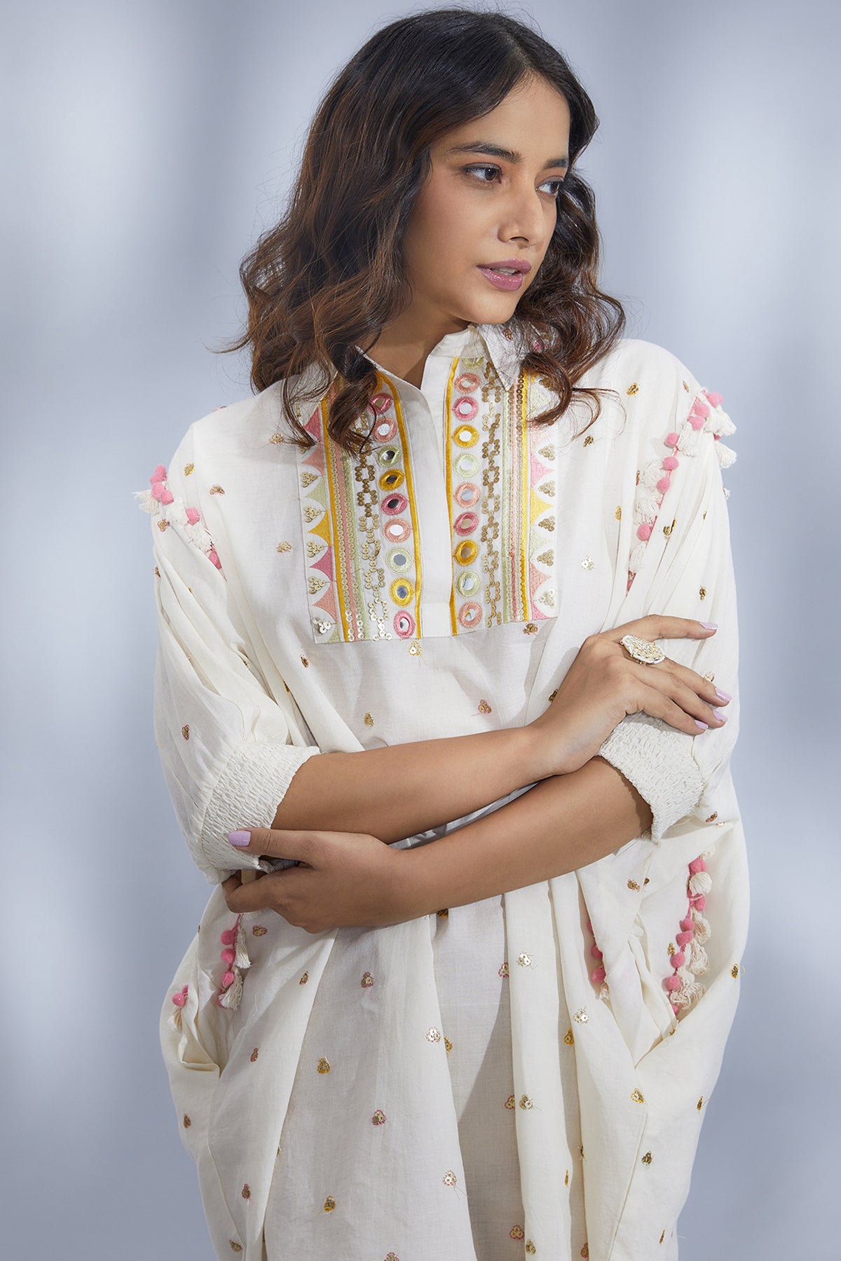 Our mehr ballooned shirt dress combines effortless style with a touch of elegance. The minimal thread and mirror work add a subtle yet captivating detail, making it the perfect choice for a casual brunch where comfort and fashion meet in perfect harmony. Get ready to turn heads and embrace the carefree spirit of summer with fiza's chic and relaxed design!