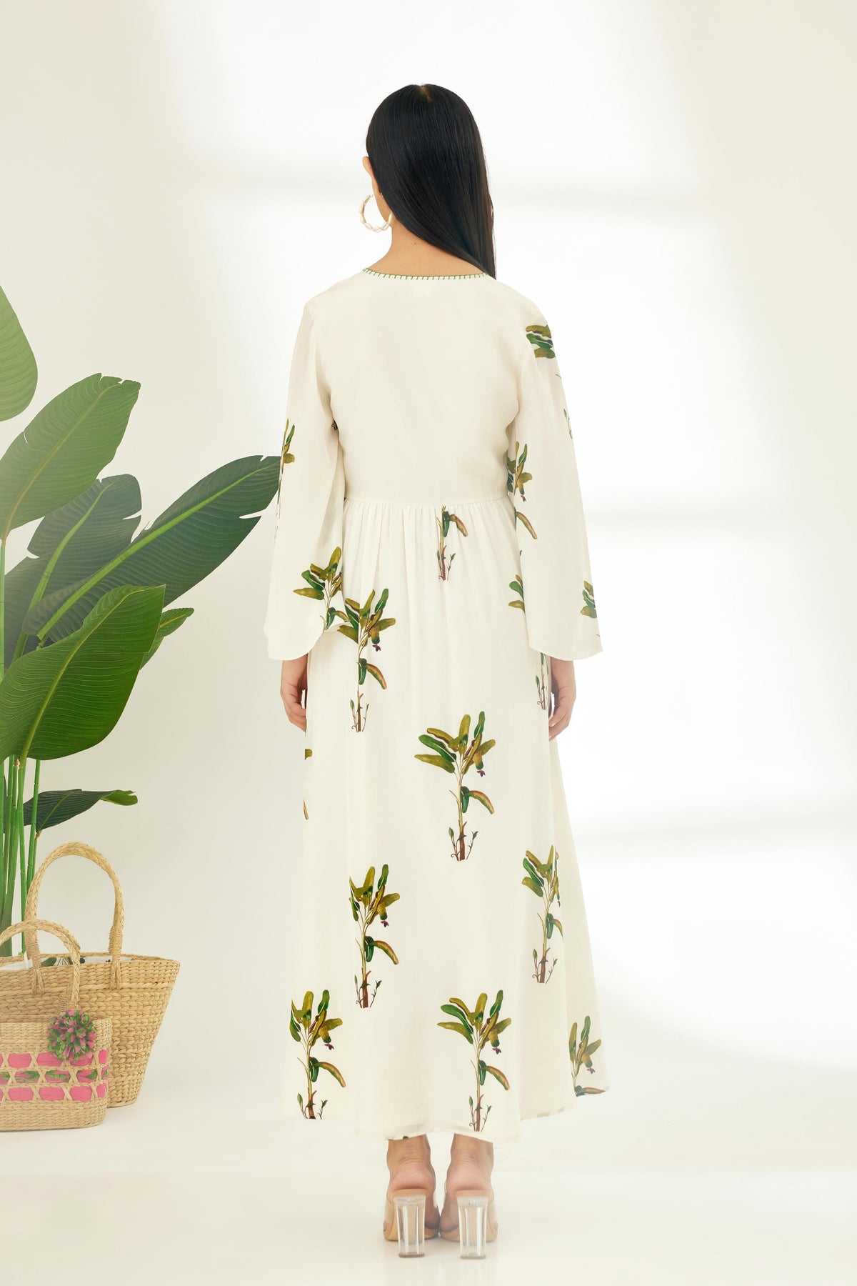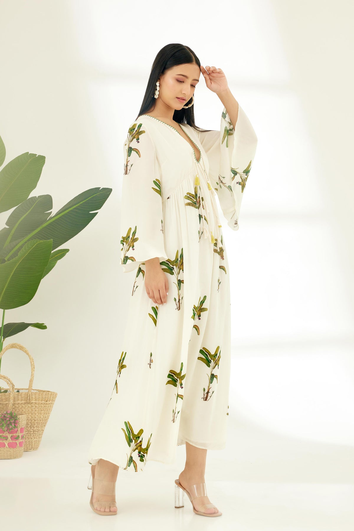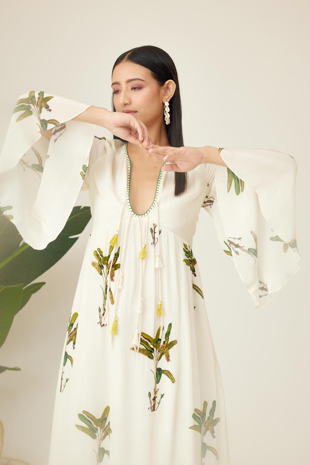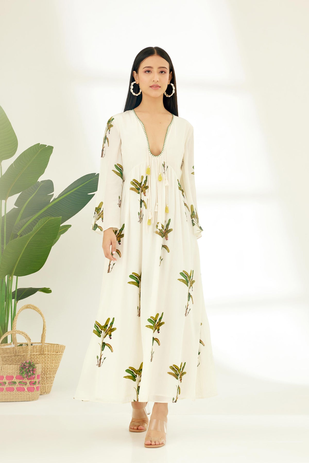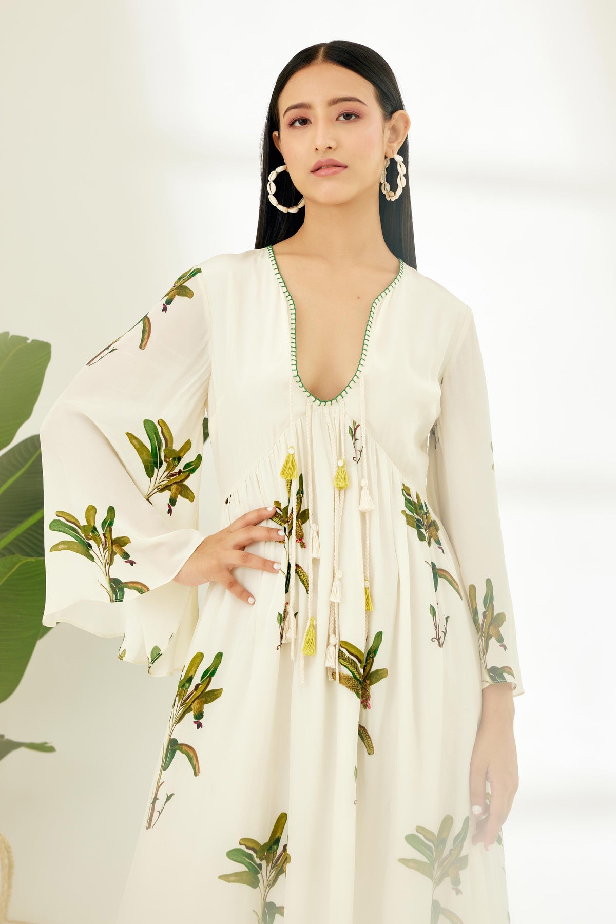 Off-white hand painted banana tree print dress with hand embroidered motif highlighted with sequin and thread, braided tassel detail on the neckline in 100% crepe.