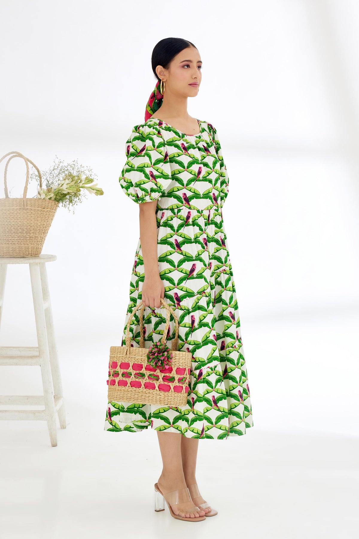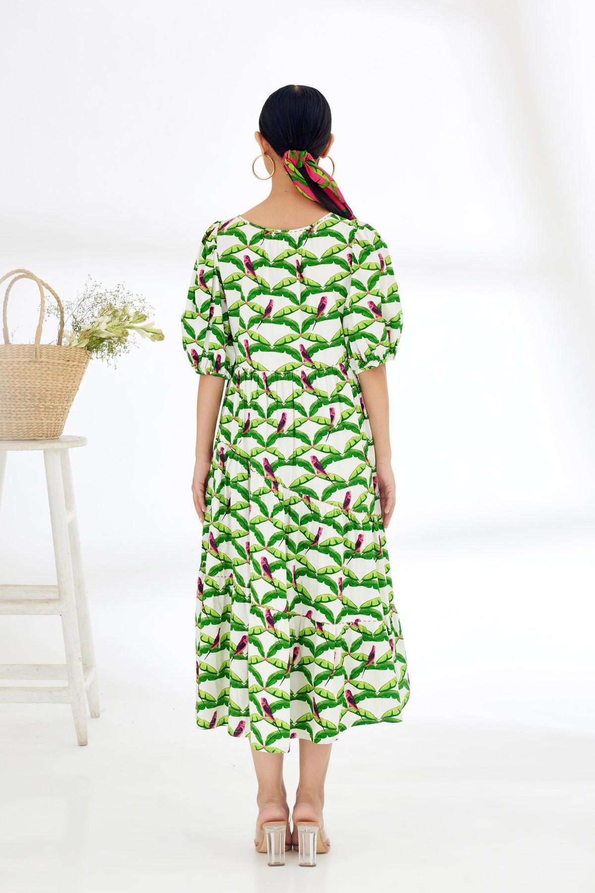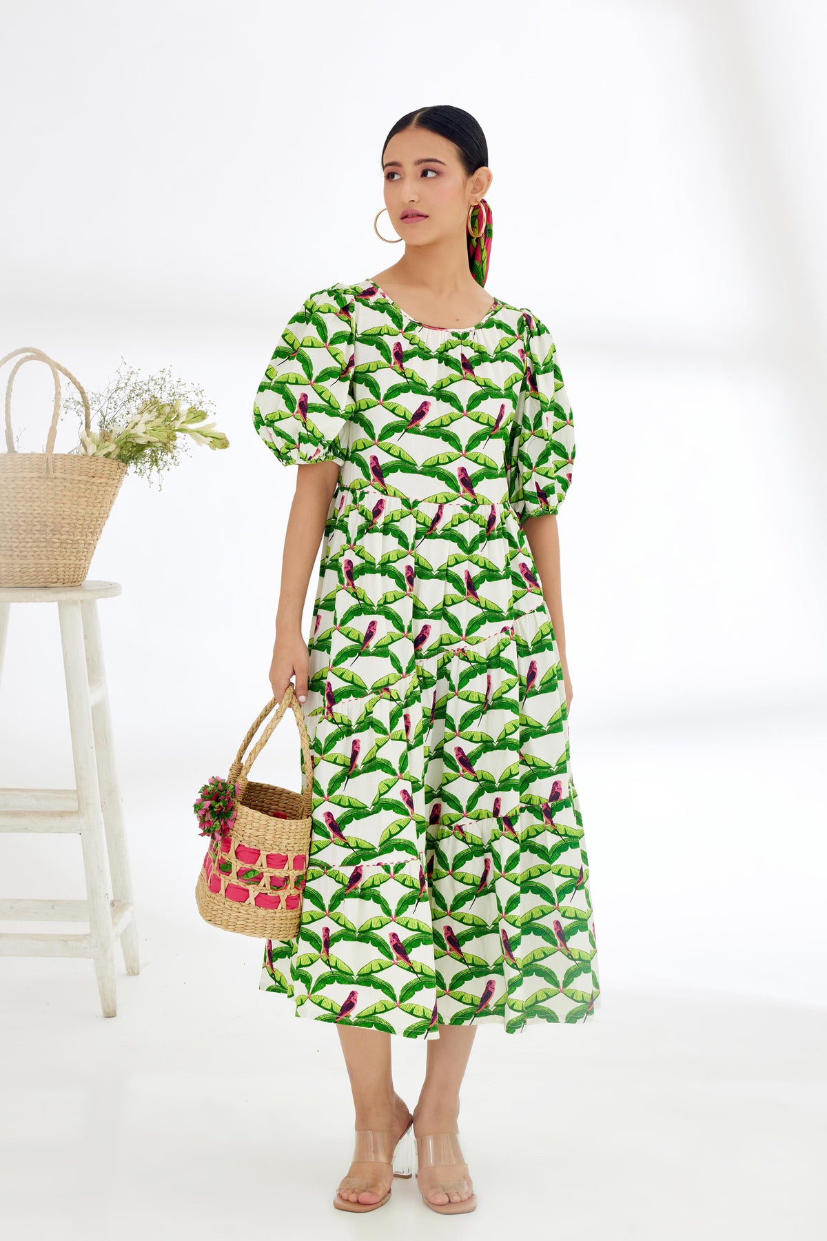 Off-white hand painted parakeet print bubble sleeve tier dress with hand stitch detail in 100% cotton poplin.