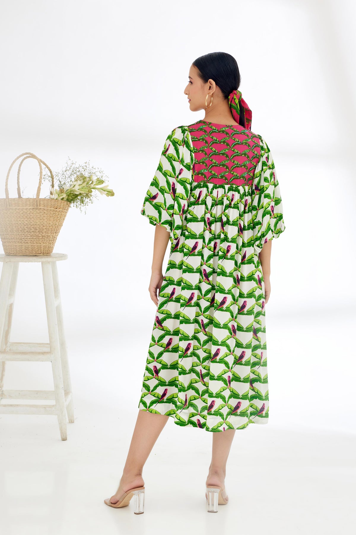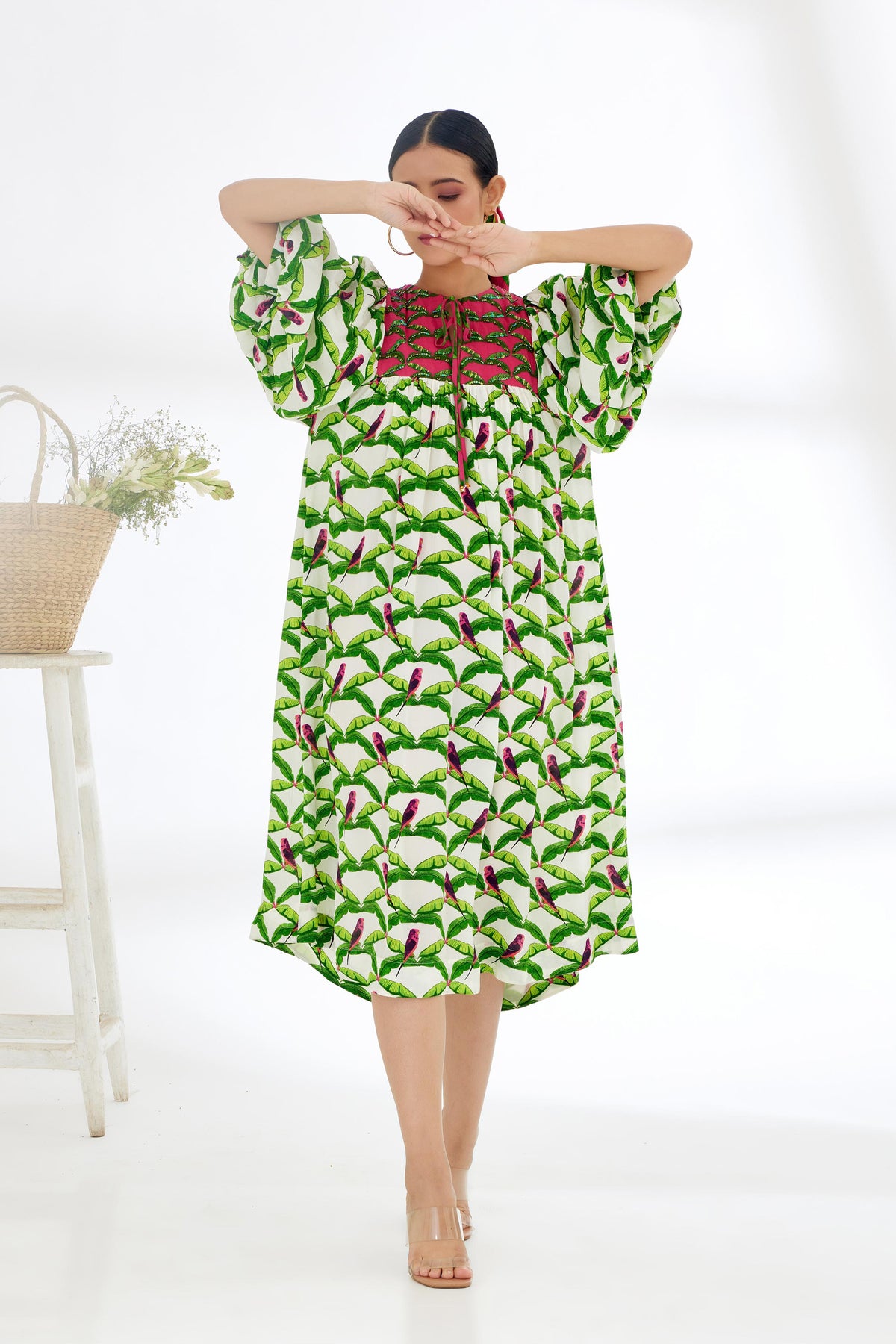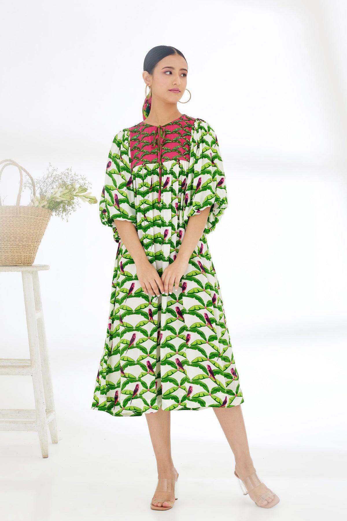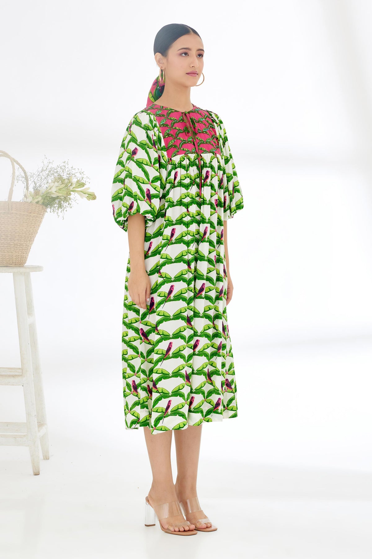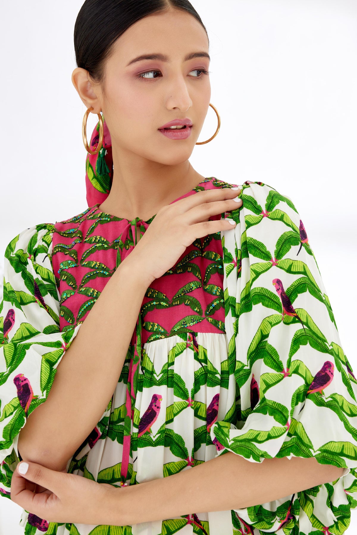 Off-white hand painted parakeet print dress with hand embroidered motif highlighted with sequin and thread on pink parakeet print and keyhole detail in 100% crepe.