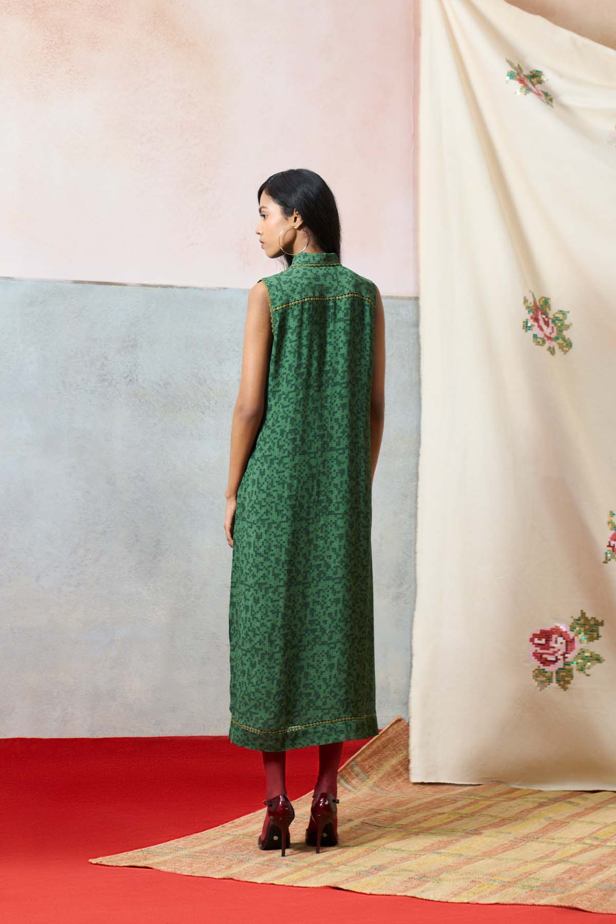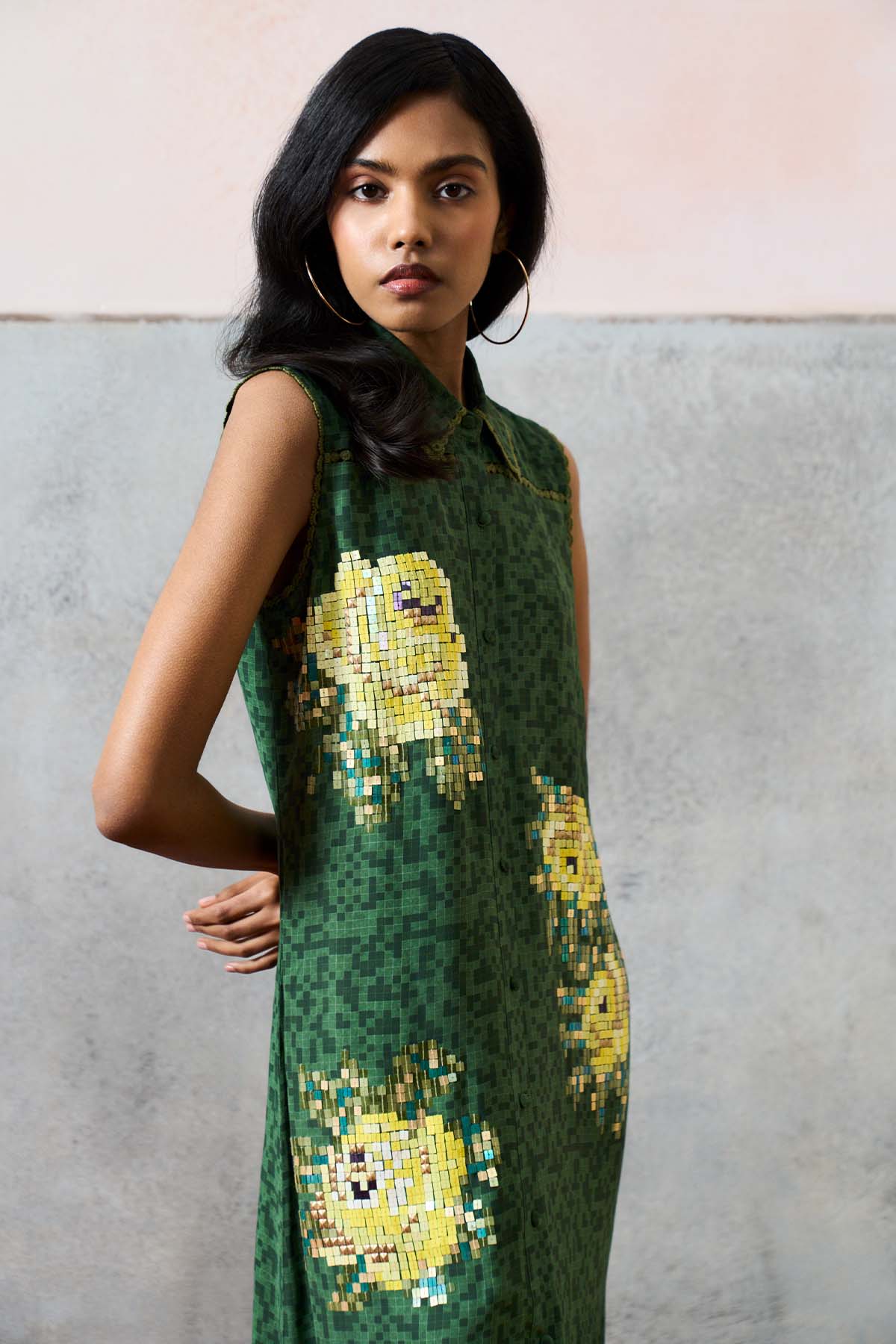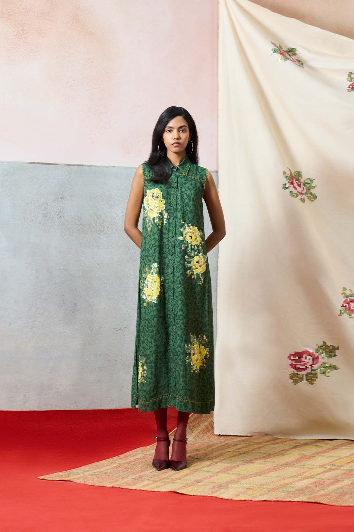 Crafted in double georgette, the ponza maxi dress in green is designed in a fluid, full-length silhouette with a classic collar and button-down front. Sleeveless and effortlessly refined, it features delicate french rose motifs across both front panels, finished with our signature sequin detailing for a soft, luminous touch.