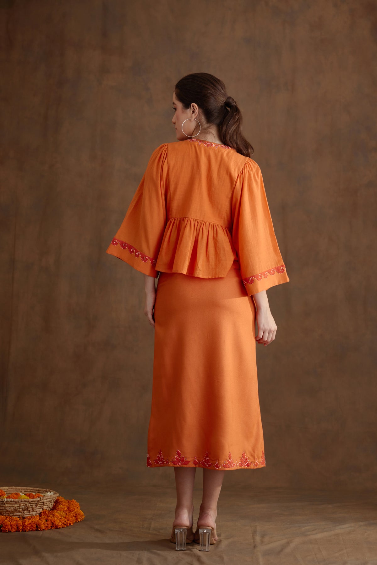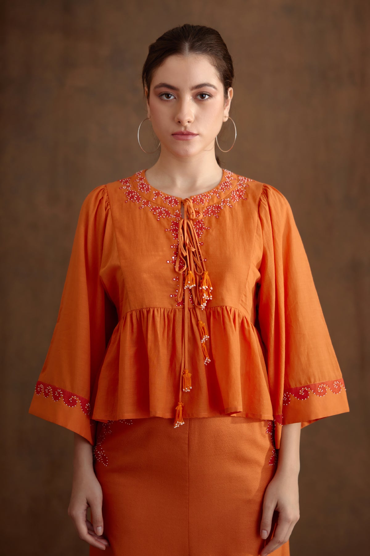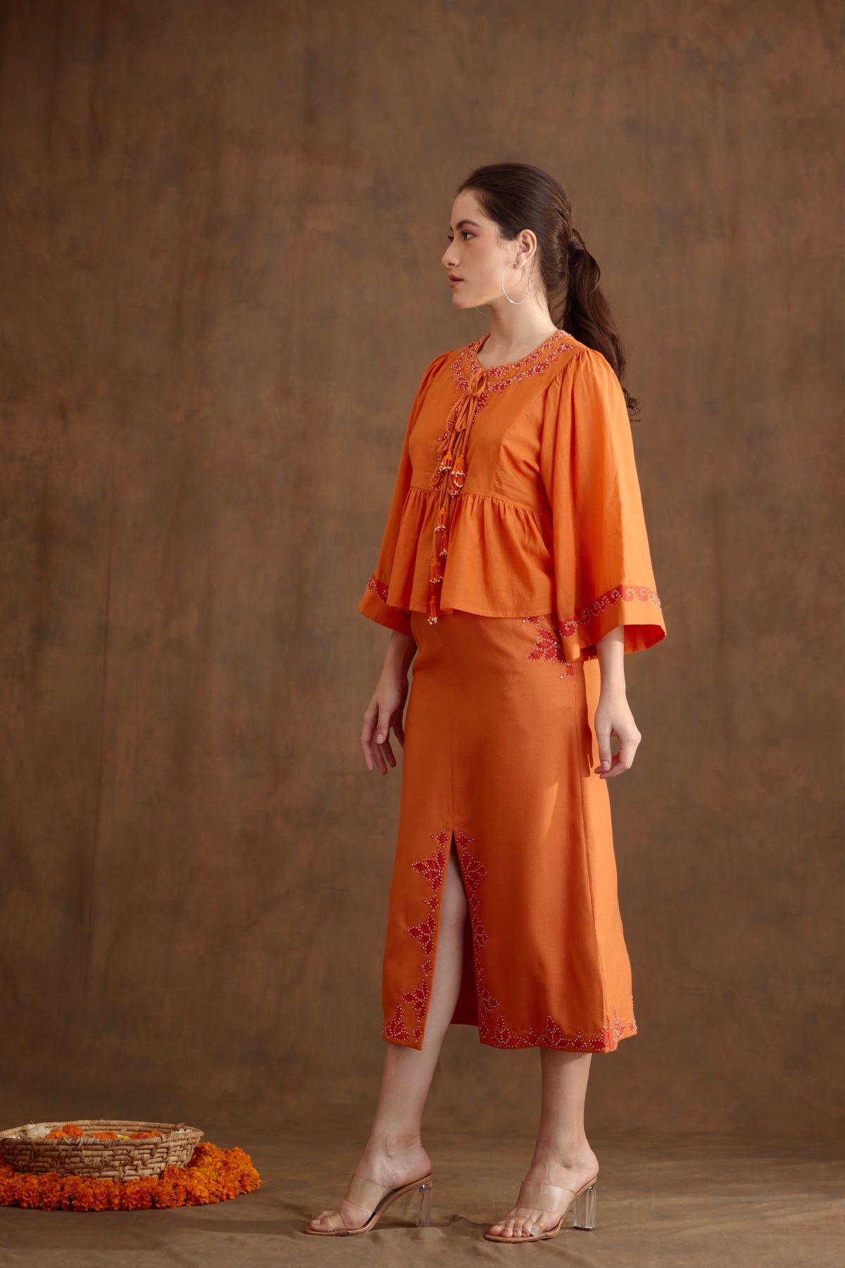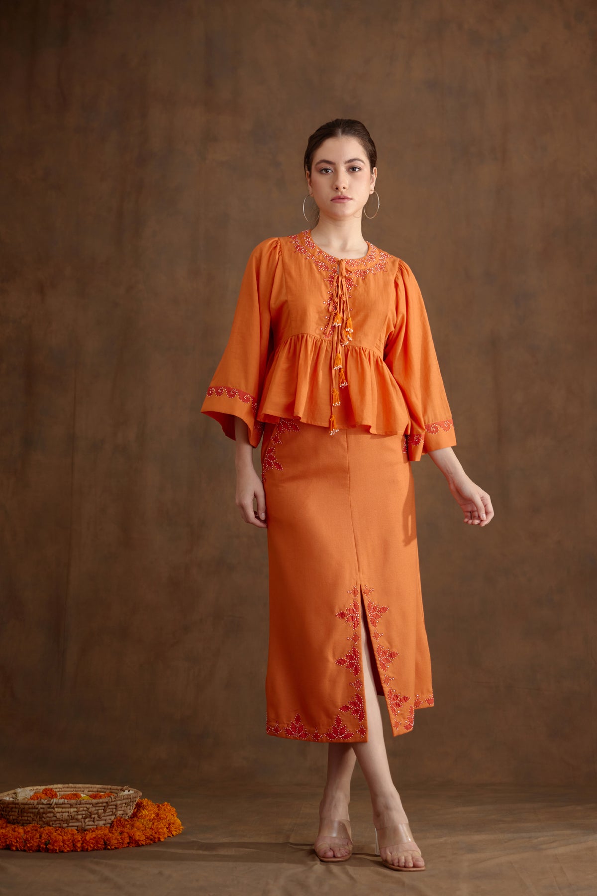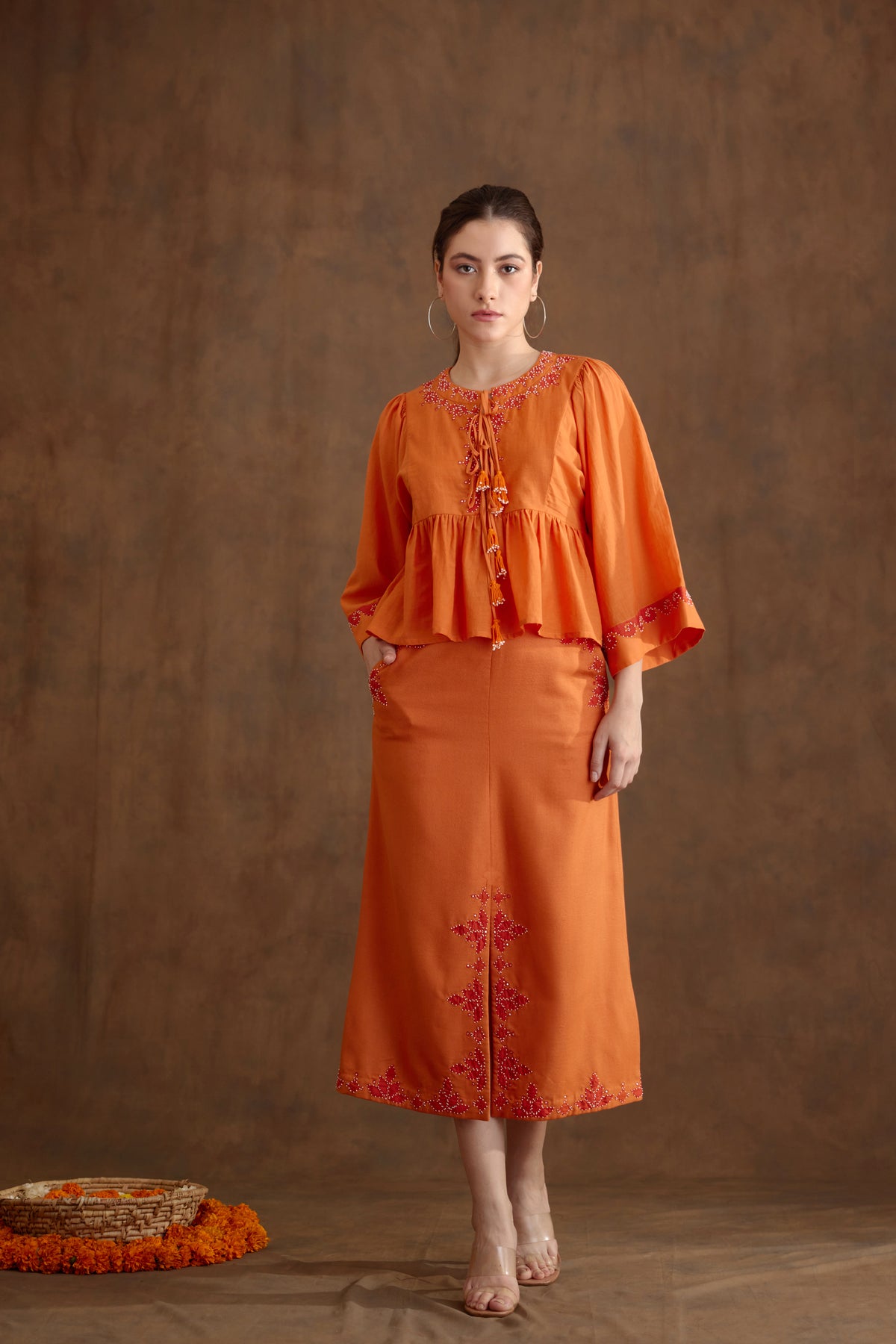 Featuring Saffron top in Cotton silk with applique embroideries highlighted with beads on the yoke and handmade tassels detailing. It is paired with a matching A-line skirt in rayon moss applique embroideries highlighted with beads at the hemline and pockets.