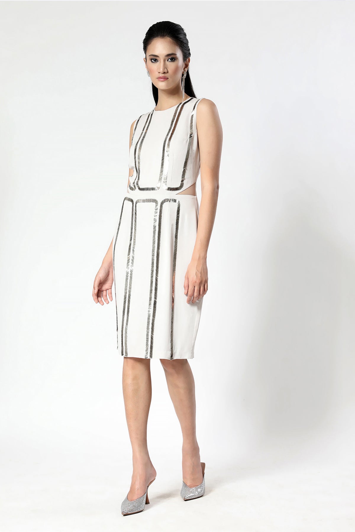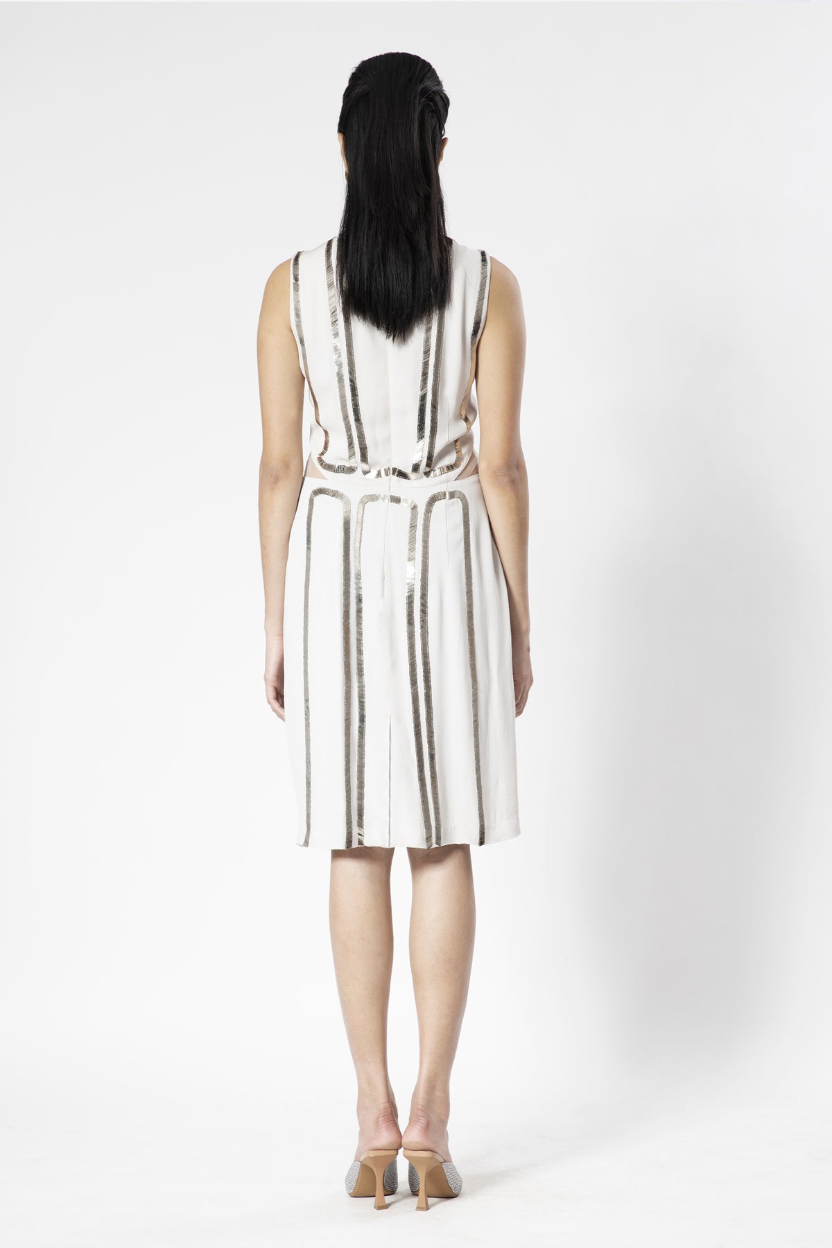 This short dress in silver white color features metallic pipe embroidery in a channeled artwork.