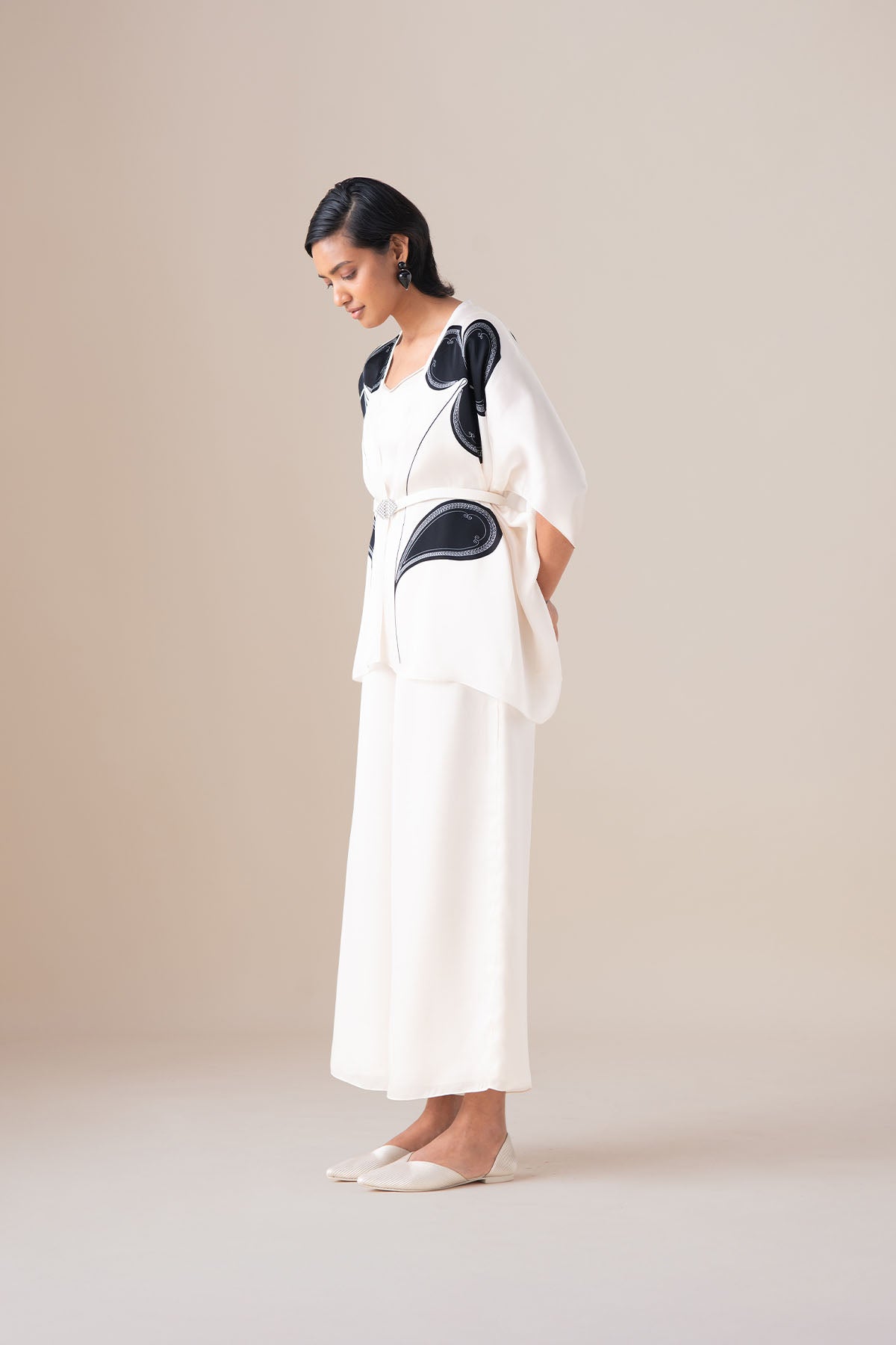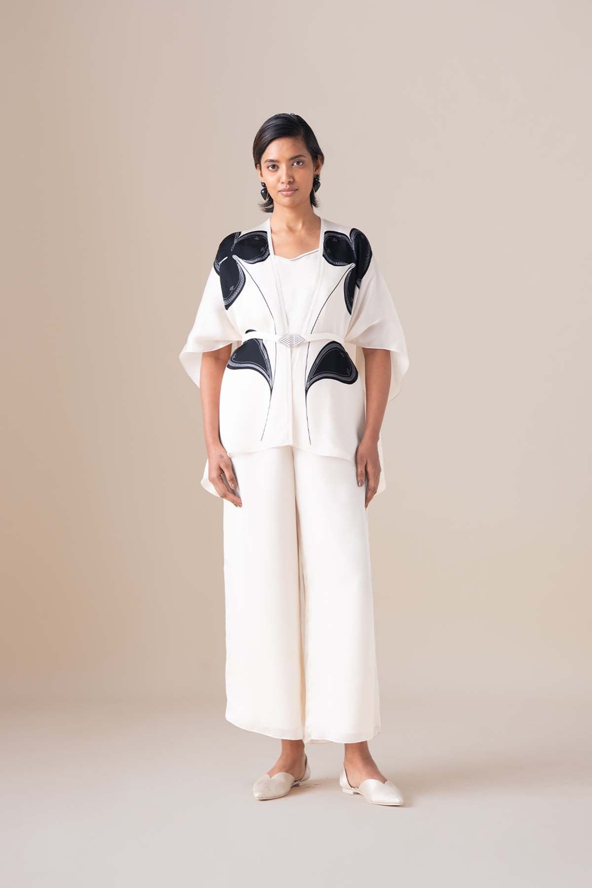 Light as air, the veya cape set in gleaming ivory is a marvel in satin organza. With open half sleeves and a fluid silhouette, held in place by a faux leather belt in the same ivory with an ornate silver and enamel plated buckle, veya is only elevated by the filigree inspired fine lines that swirl around the charcoal black motifs of flora and fauna. Complete with a set of an inner slip and palazzos in the same satin, wear veya with our emira slip-ons and amina clutch.Ā