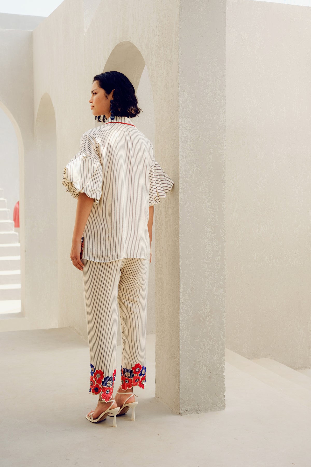 The elise shirt is made of pure crepe with a regular collar and balloon sleeves. It features a striped pattern with delicate floral embroidery and sequins detailing at the hemline.