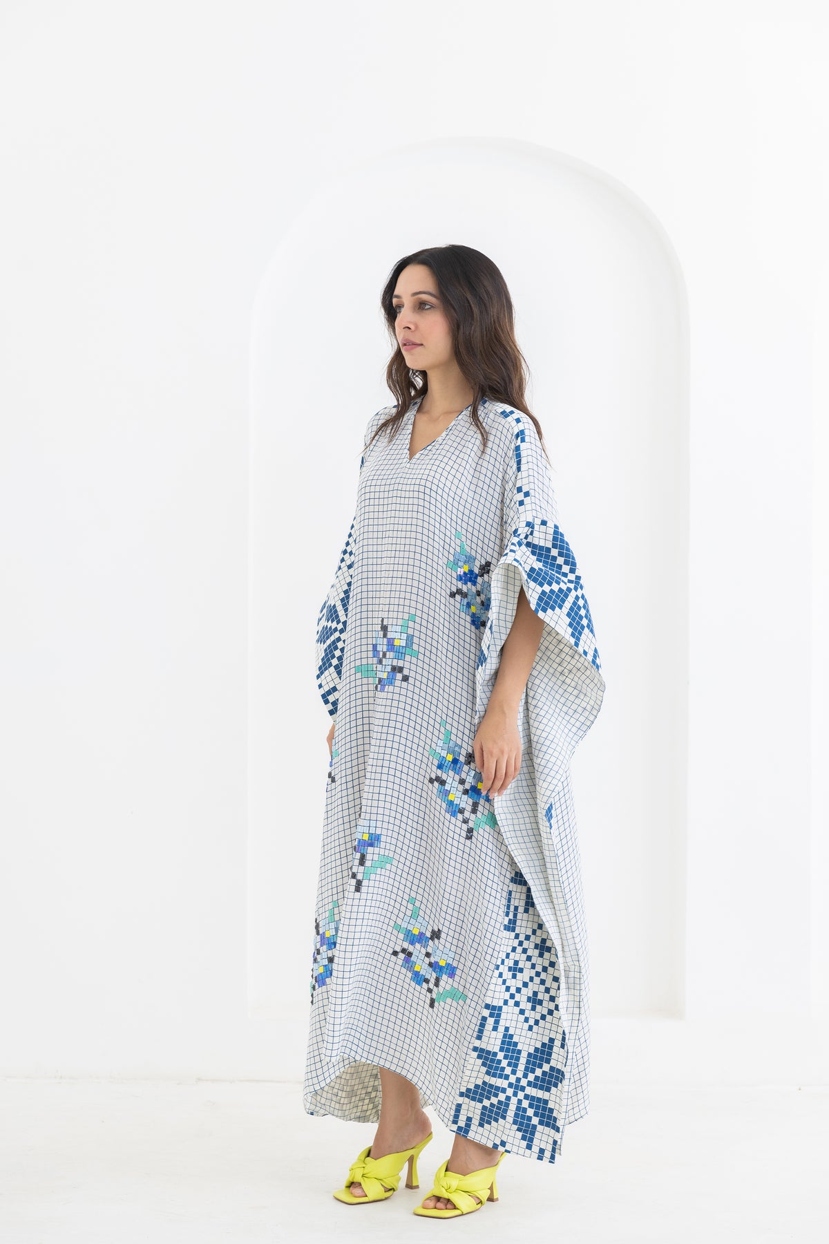 This chique kaftaan has floating hand embroidered flowers on front , detailed by custom print fabric on sides , shoulder and neck