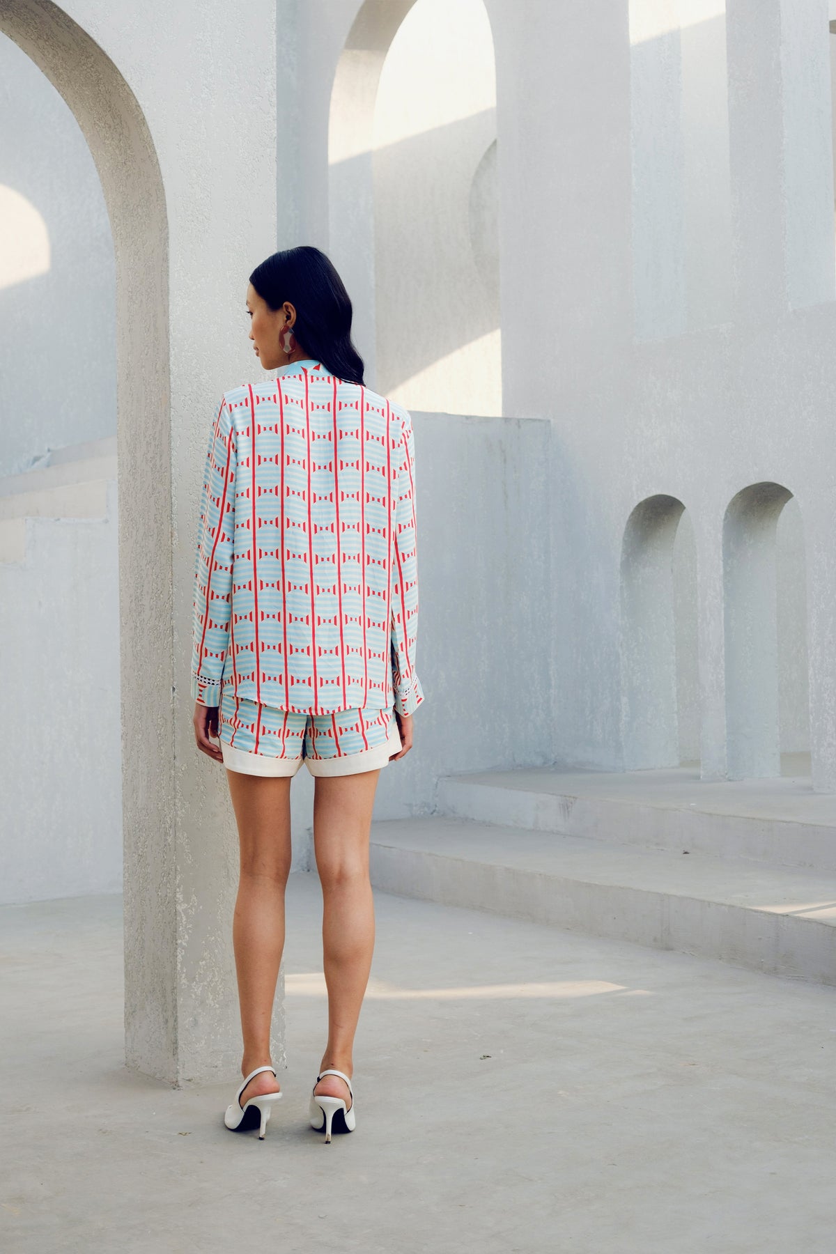The white zip shirt is made of double georgette. It features a mandarin collar and zipper detailing with floral and geometric print play in classic prg style.