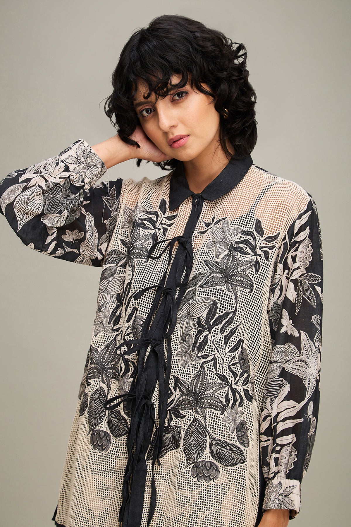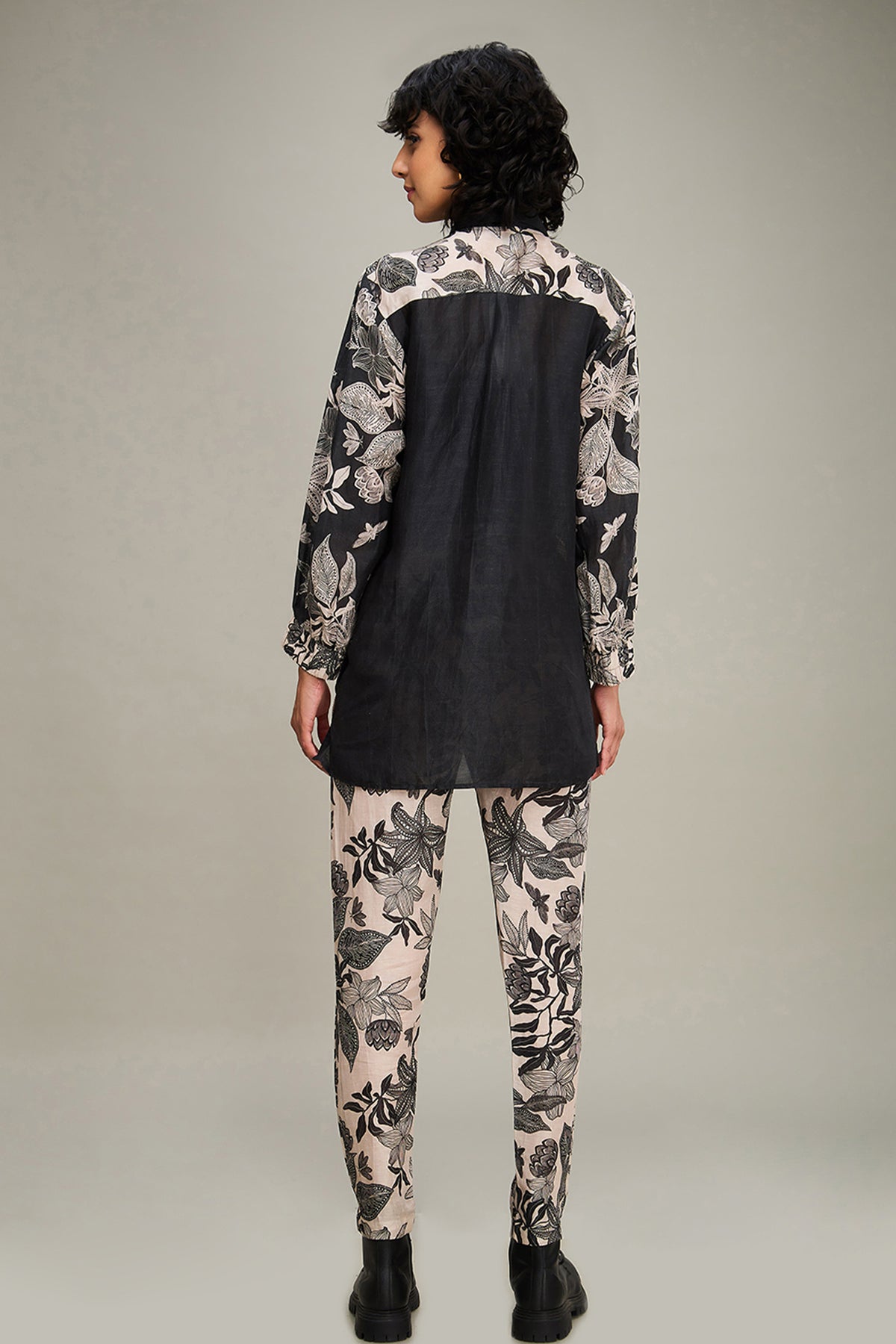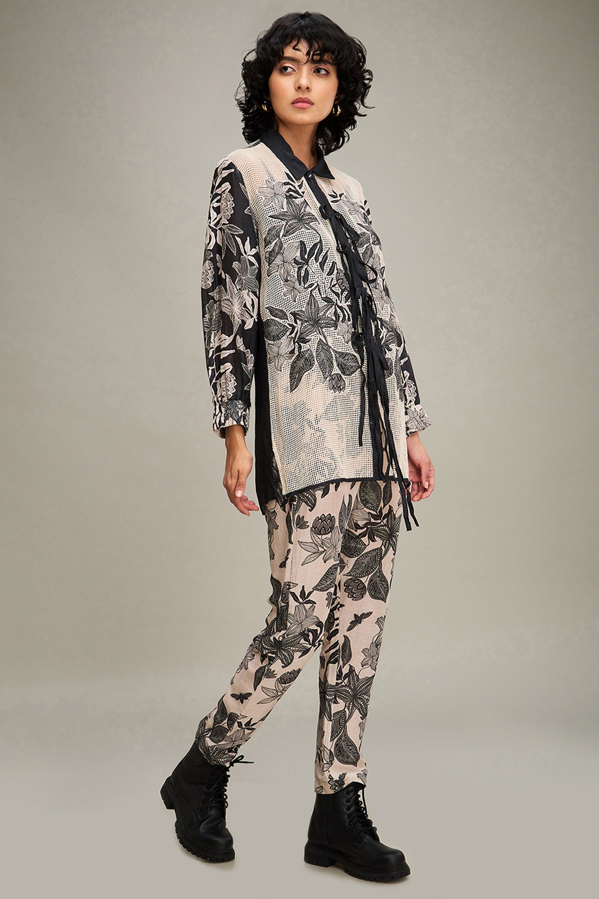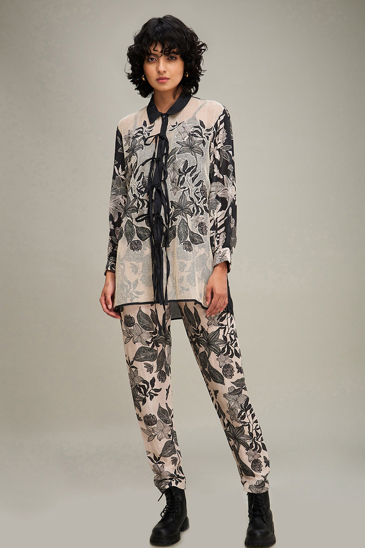 Off-white ahyana appliqued shirt with front drawstrings, paired with printed pants