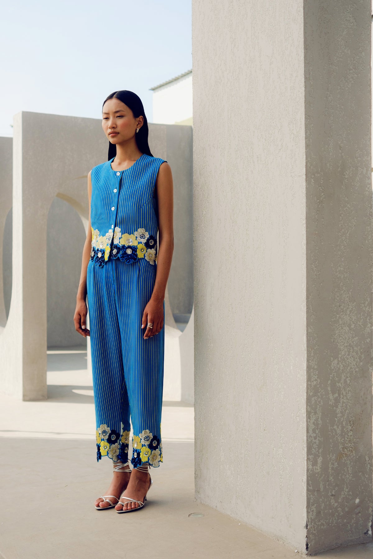 The blue margot waistcoat co-ord set is made of double georgette. It features delicate floral embroidery and sequins detailing at the hemline of the shirt and trousers.