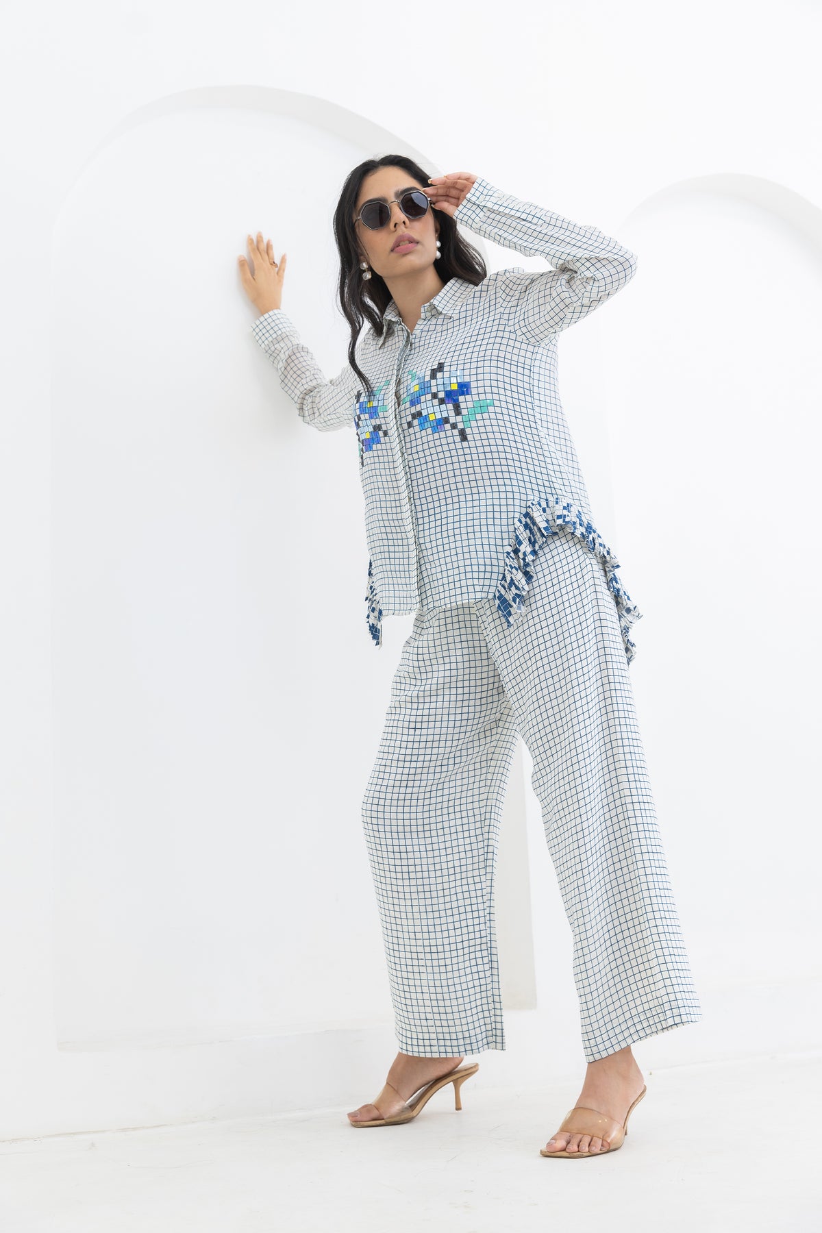 This chique co-ord set consistes of a shirt with hand embroidered flower motif in front + trousers . Its made in crepe and checks are custom printed