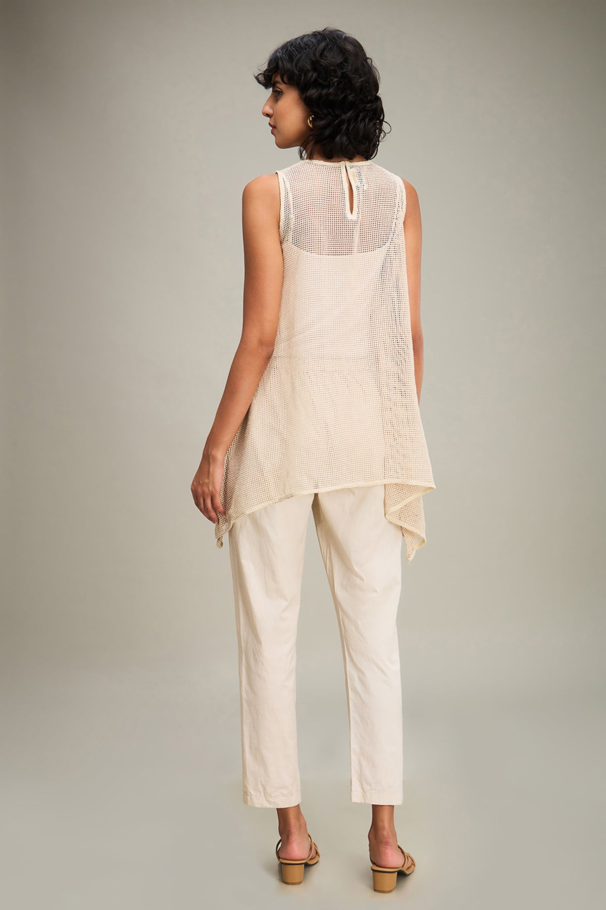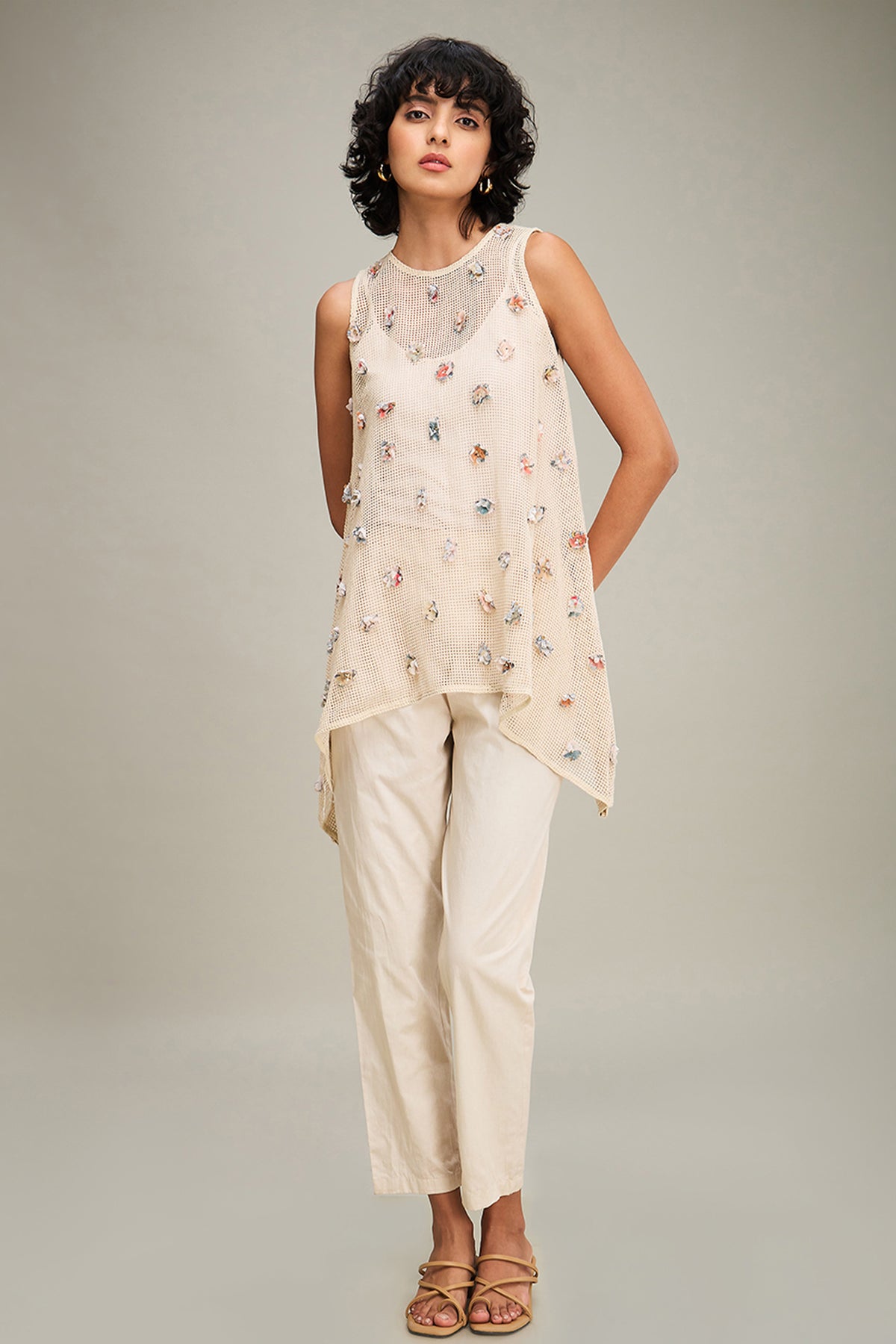 Off white conversational top in handloom net comes with a slip, paired with pants in muslin slub. Fit: Relaxed