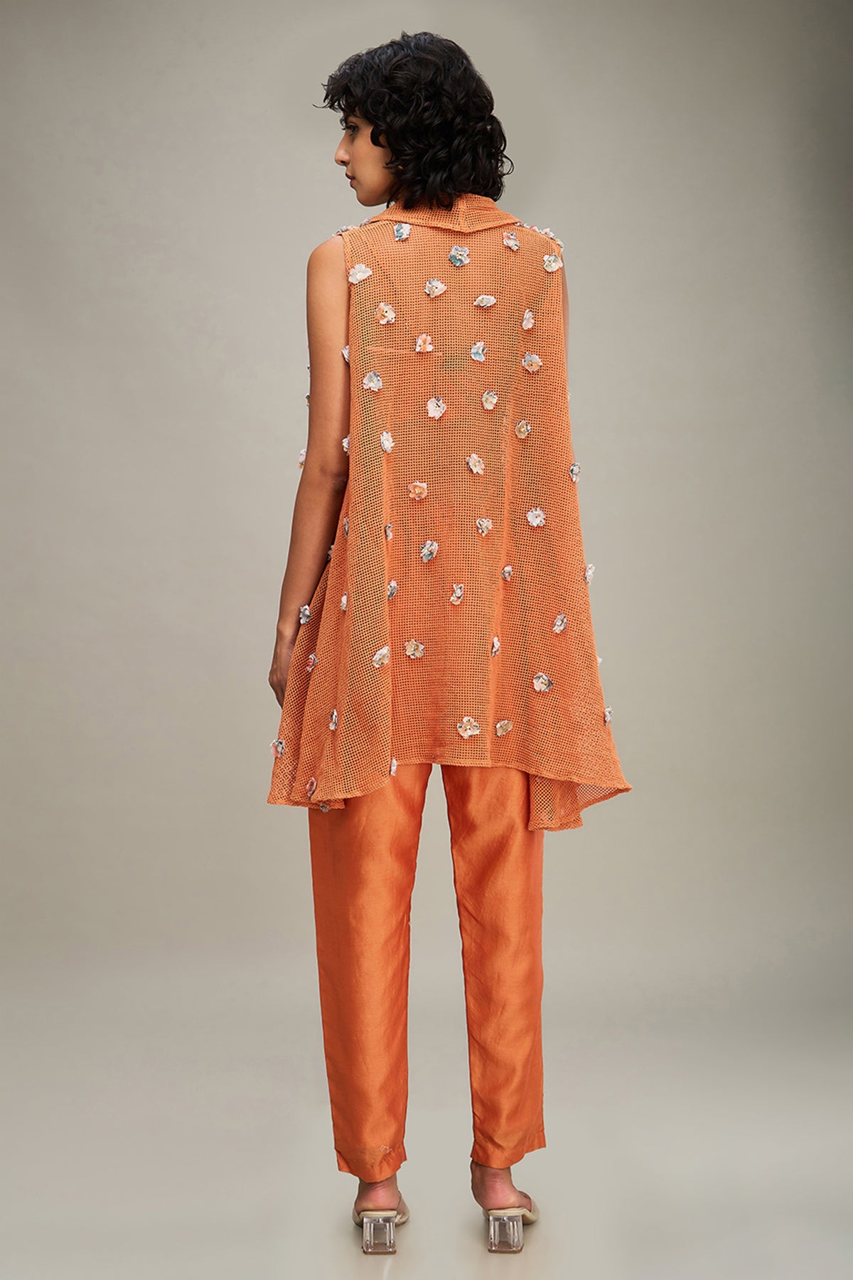 Orange conversational embellished bustier and pants in chanderi paired with high-low hem cape in handloom net