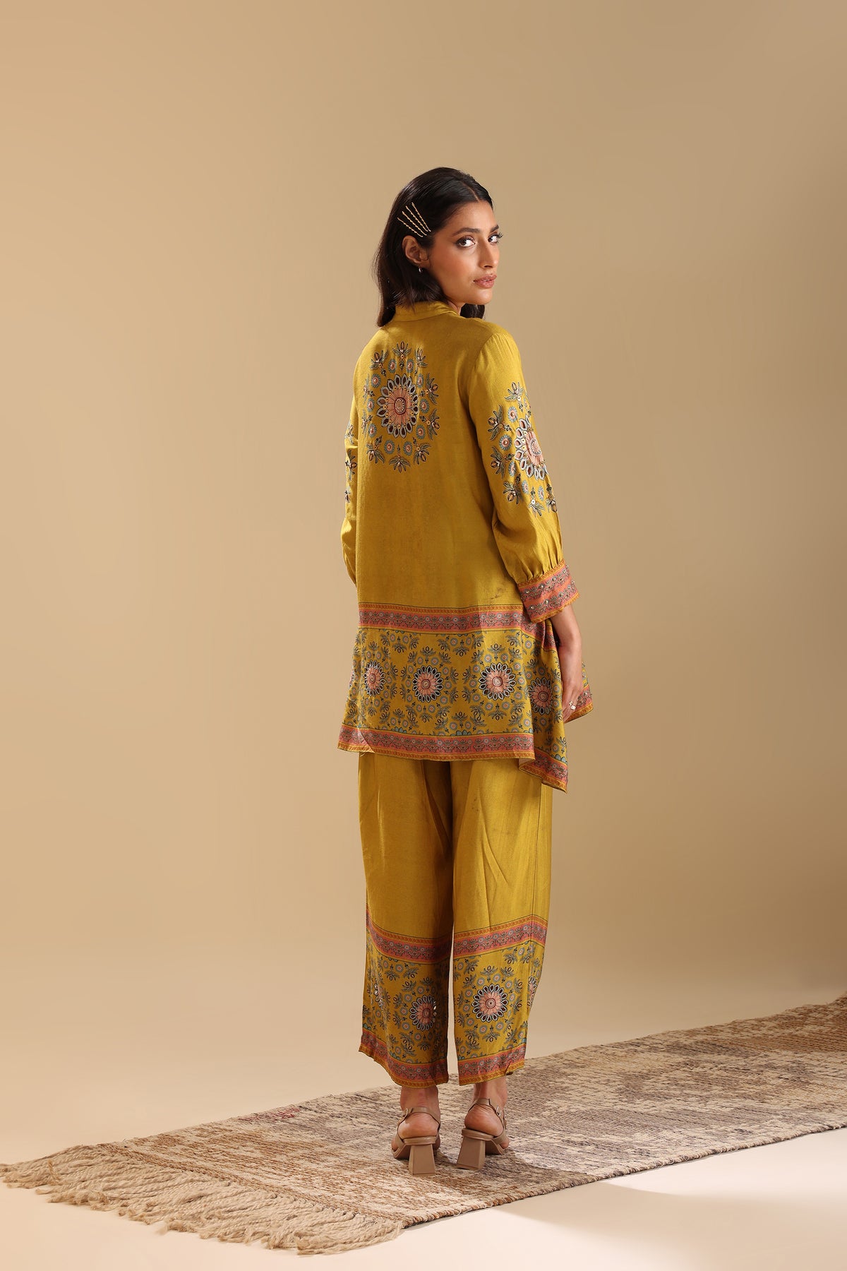 Yellow Eraya embellished shirt with gathered sleeves paired with pants in cotton silk