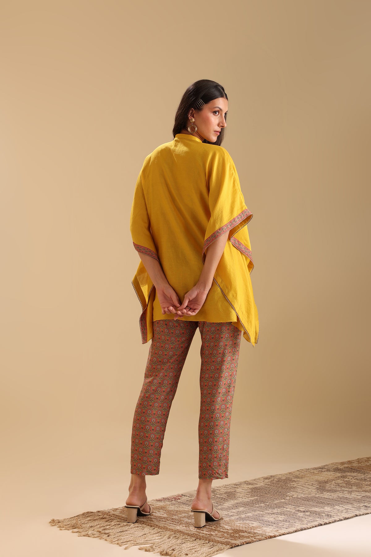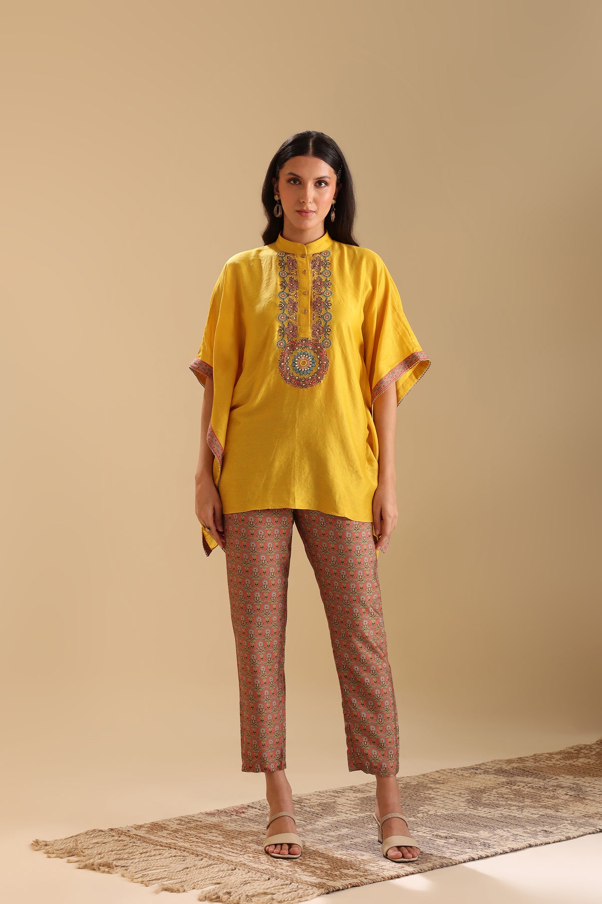 Yellow eraya embellished chanderi short kaftan shirt with chanderi pants.