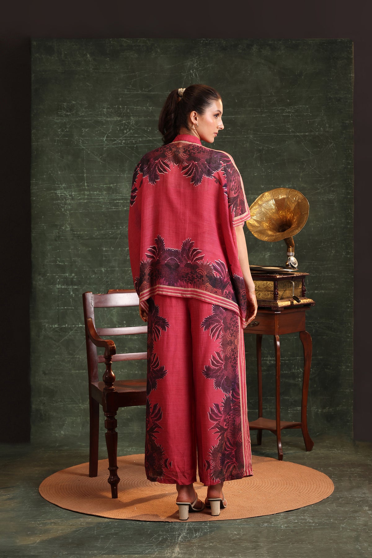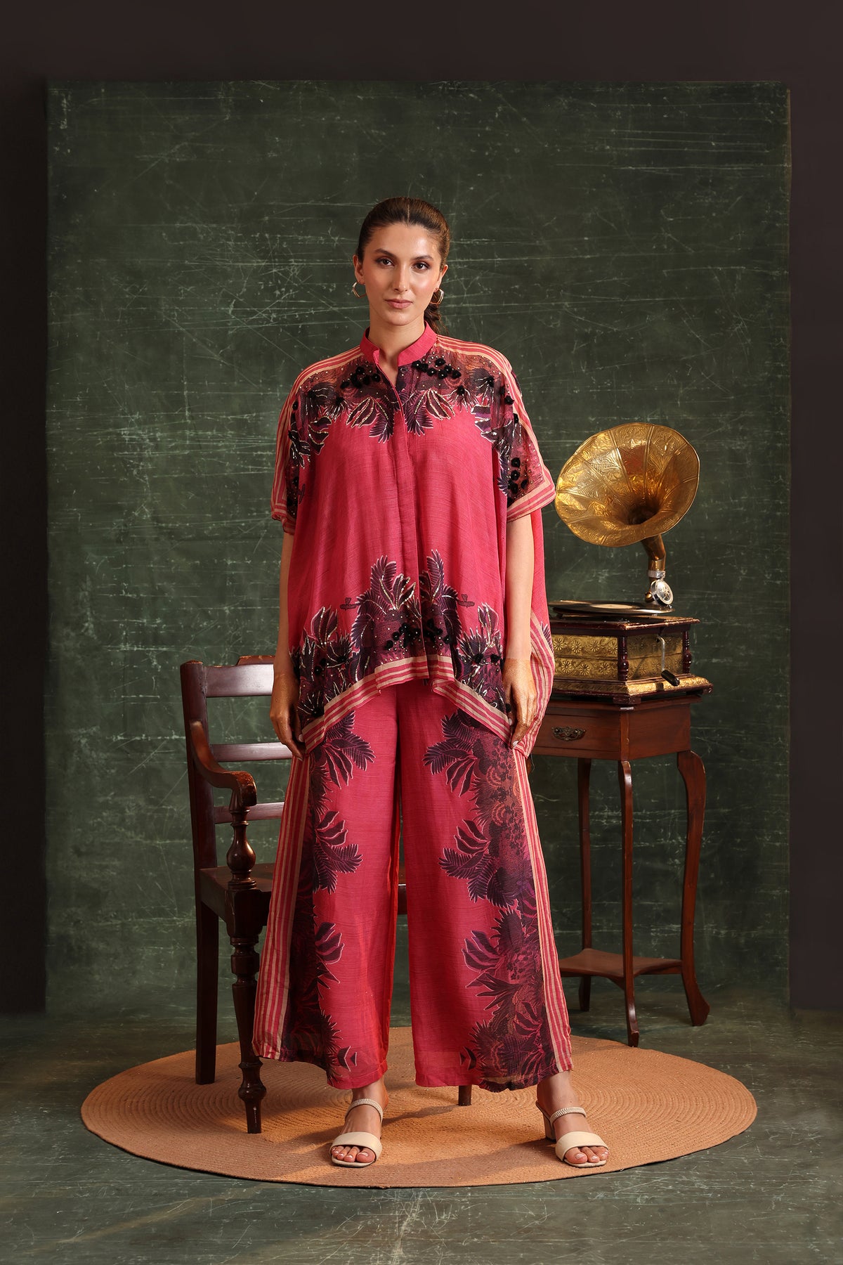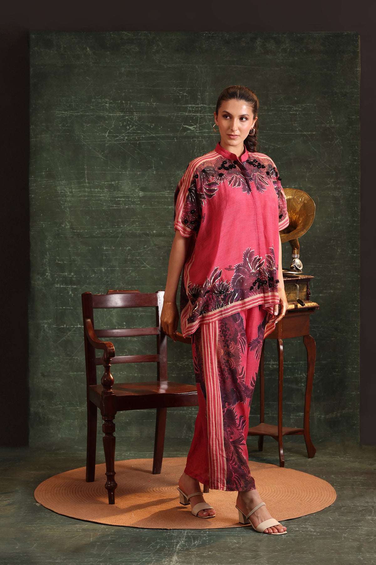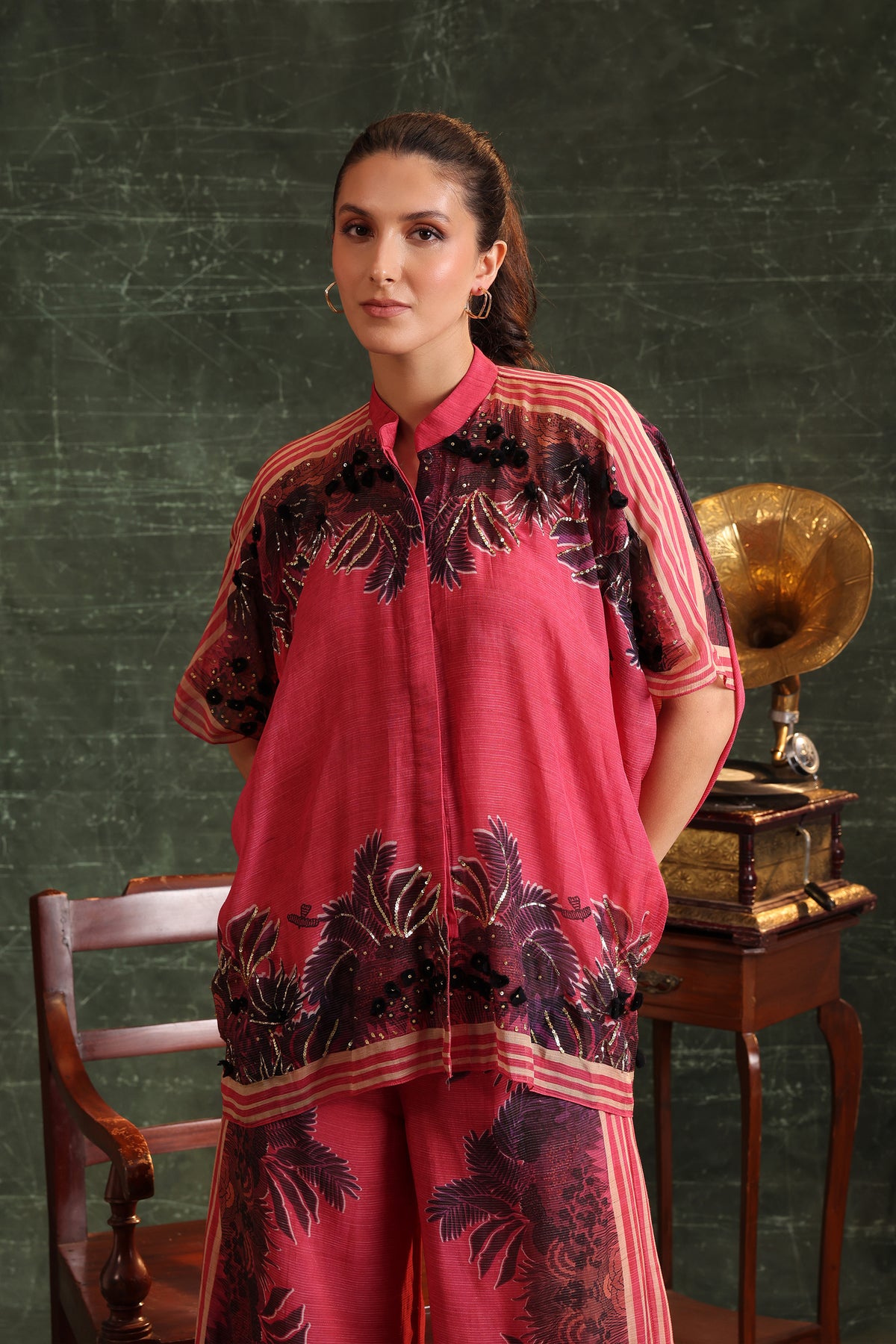 Pink kaira embellished kaftan shirt paired with straight pants in organza