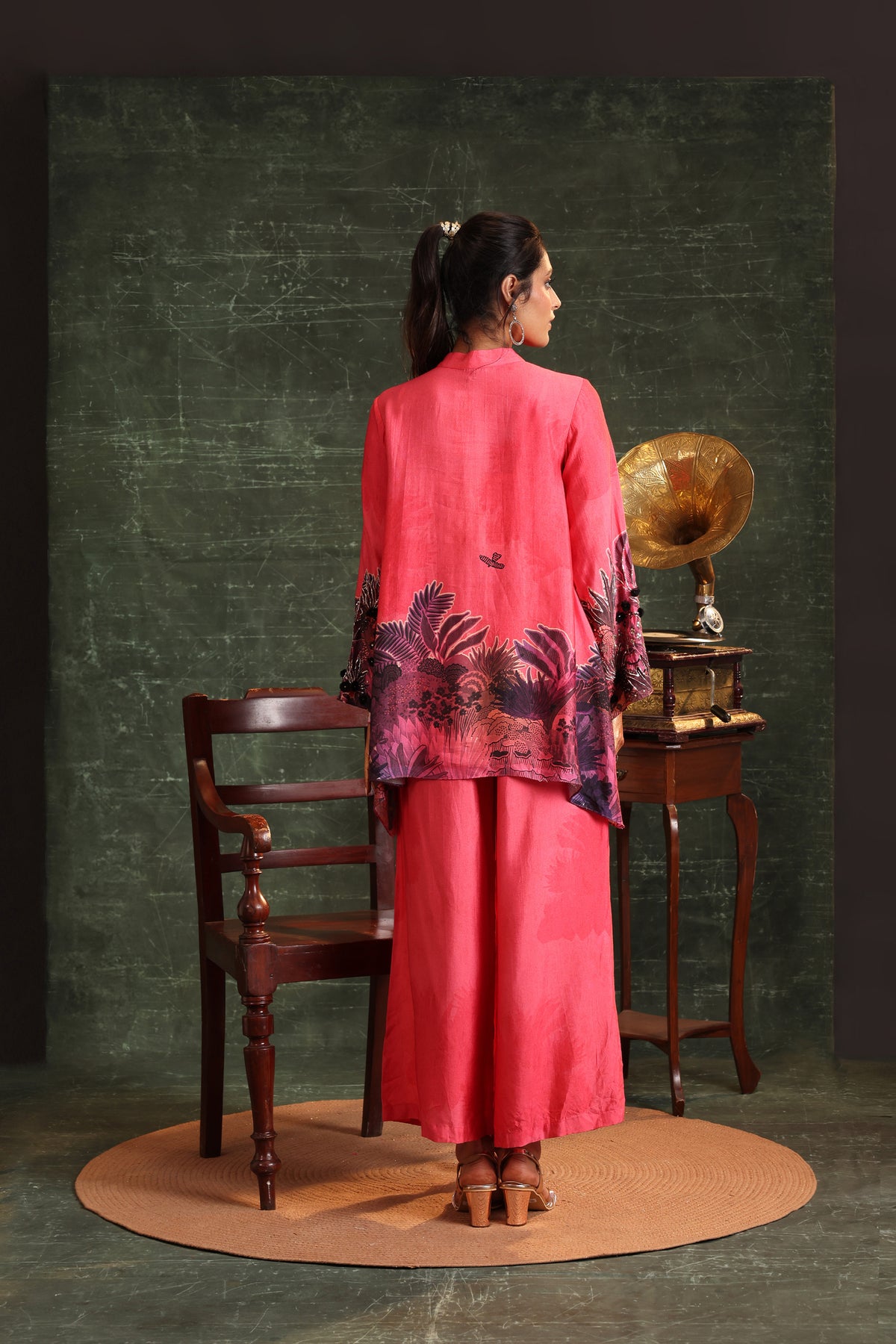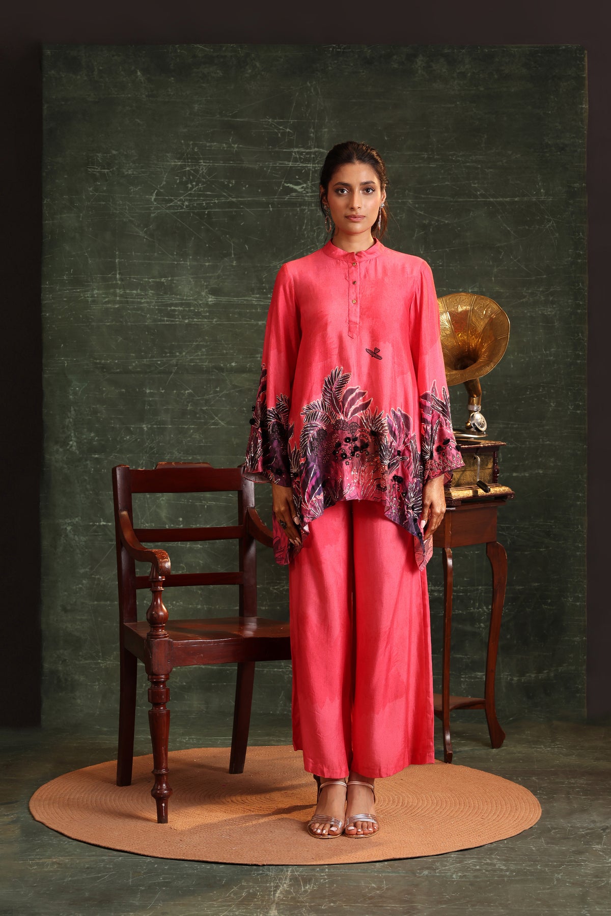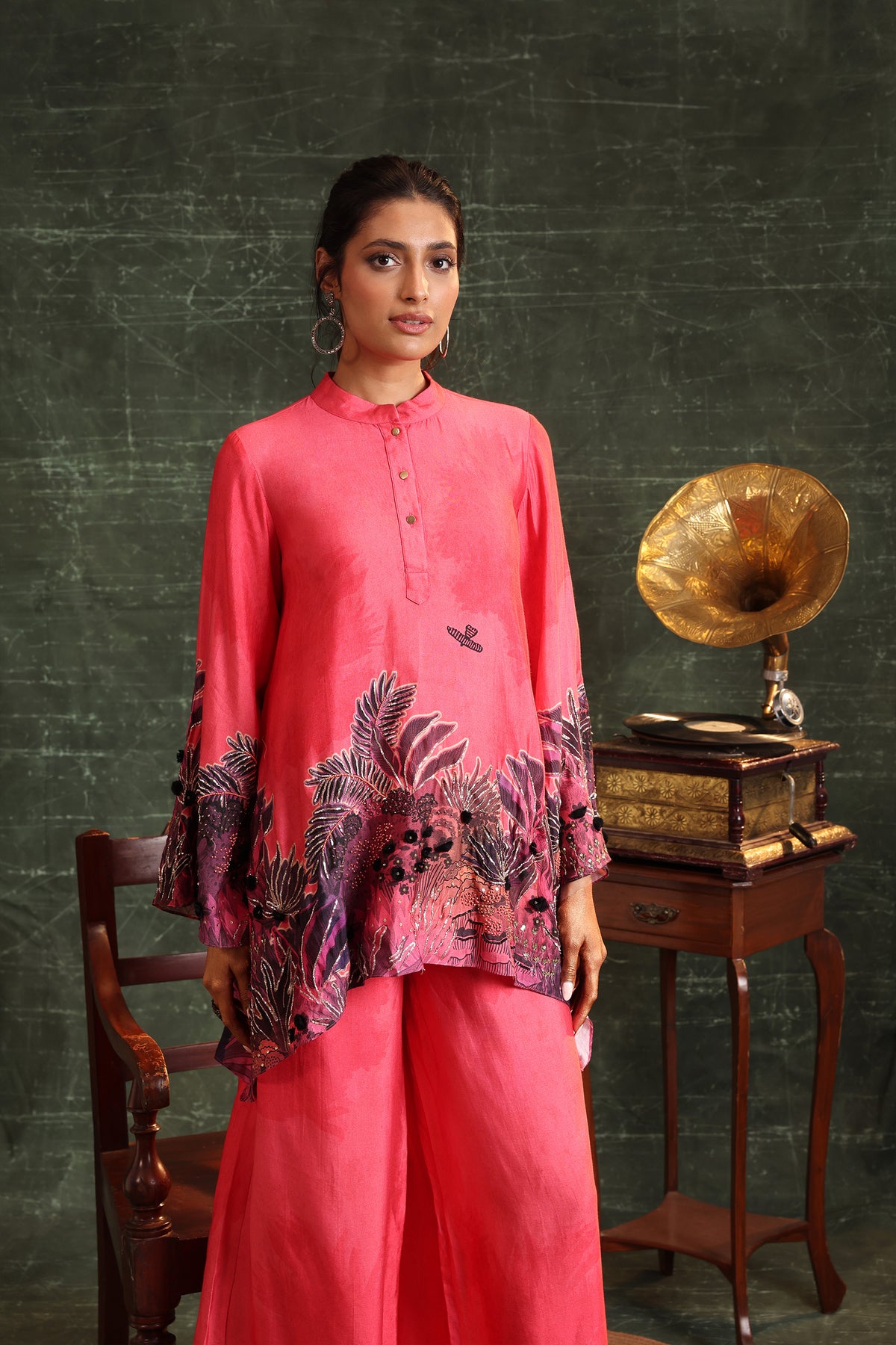 Pink kaira embellished asymmetric shirt with flared sleeves paired with pants in chanderi silk