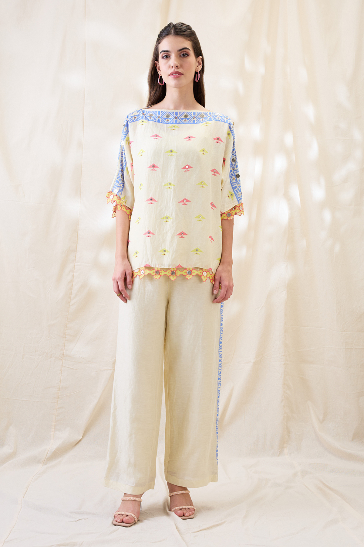 Beige kitchra embellished kimono top, paired with pants in linen.