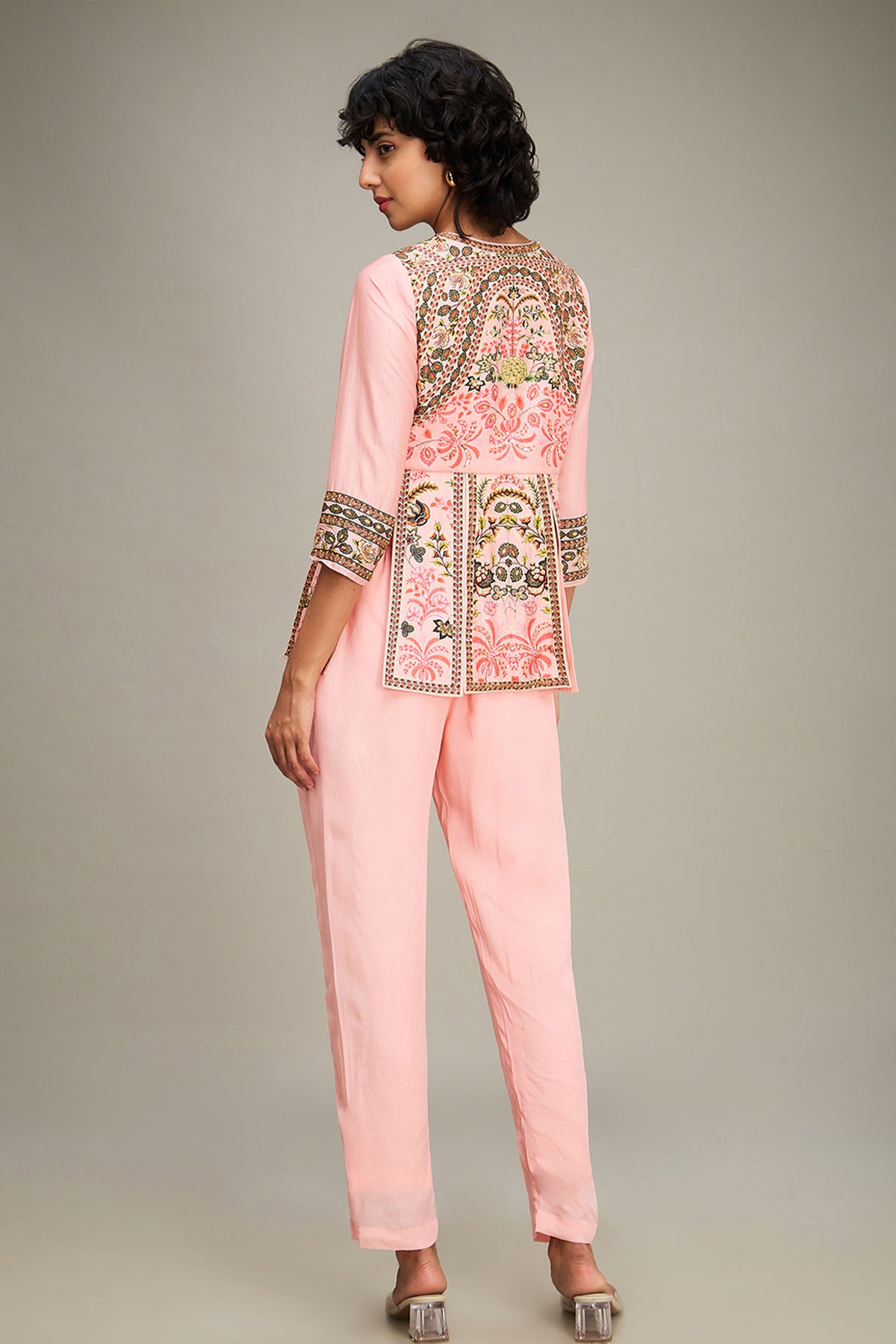 Pink mehr embroidered peplum top with panels in chanderi, paired with multicolour printed pants in crepe.