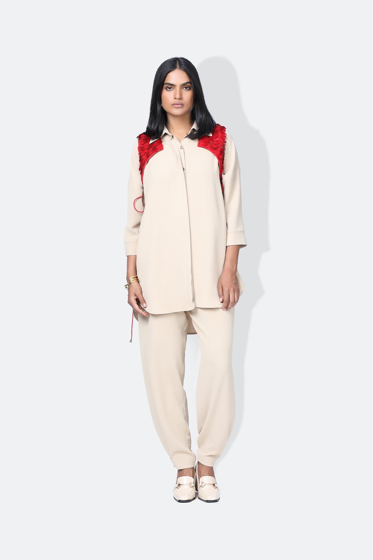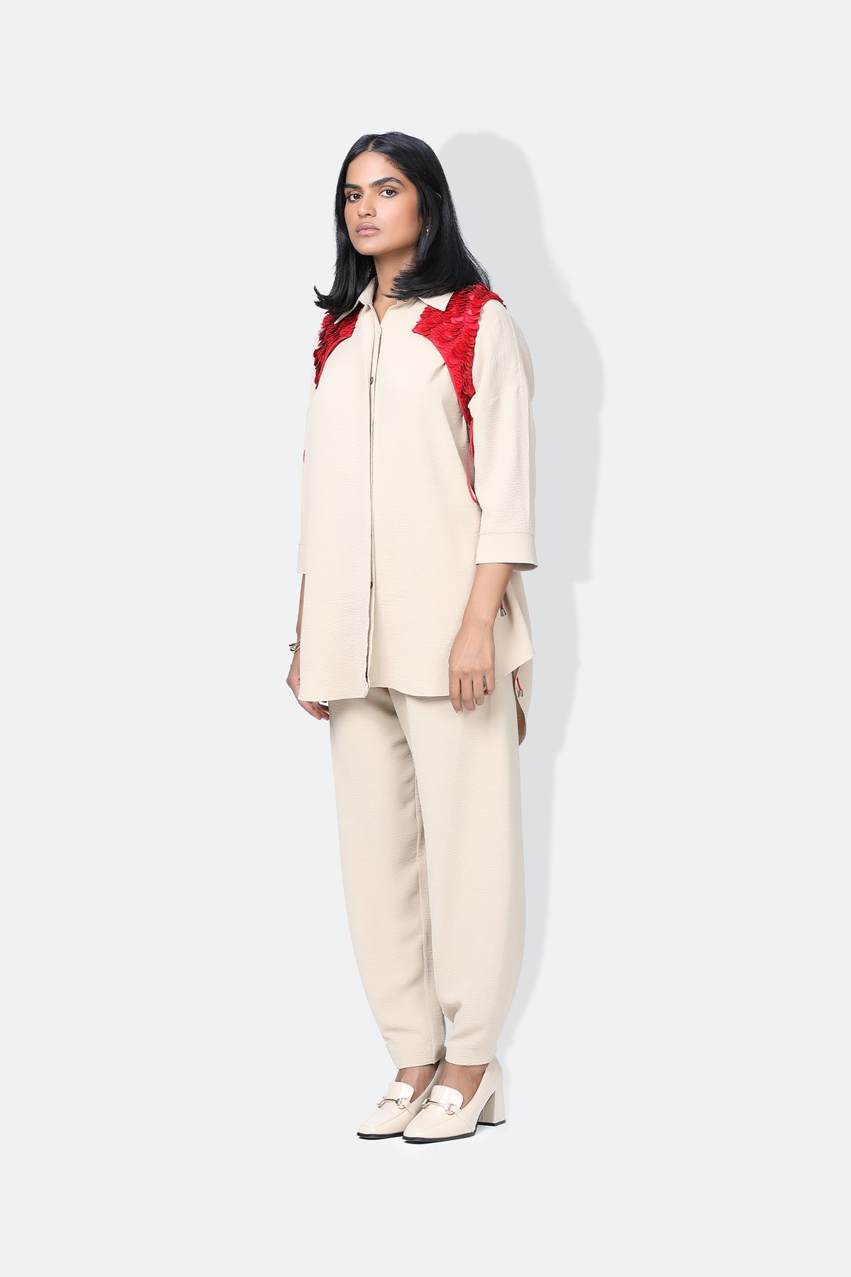Daily crepe essentials. The moka set features a relaxed fit solid shirt with draped bottoms that has an overlap panel on the side that creates an interesting shape.This set is made in light weight crepe. Comes with a detachable embroidered overlay that sits on your shoulders. The overlay can also be styled as a separate..