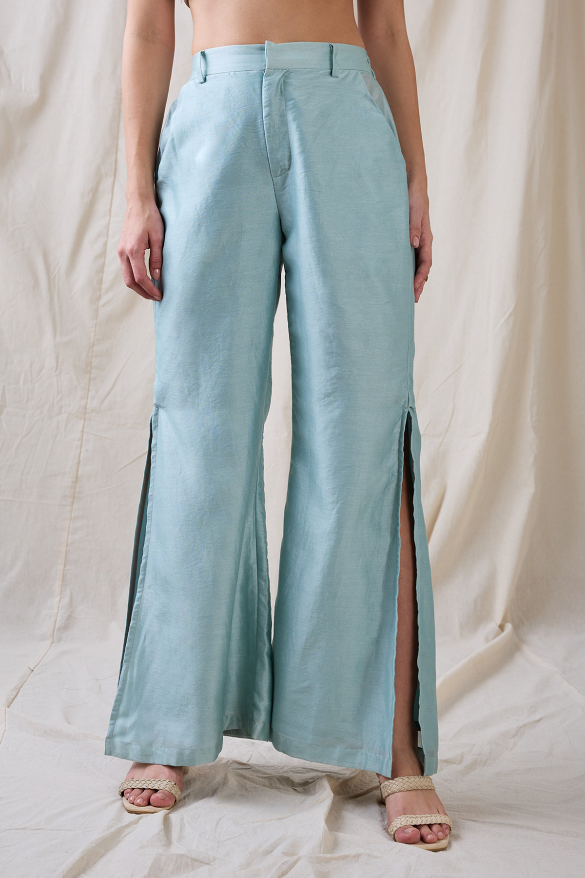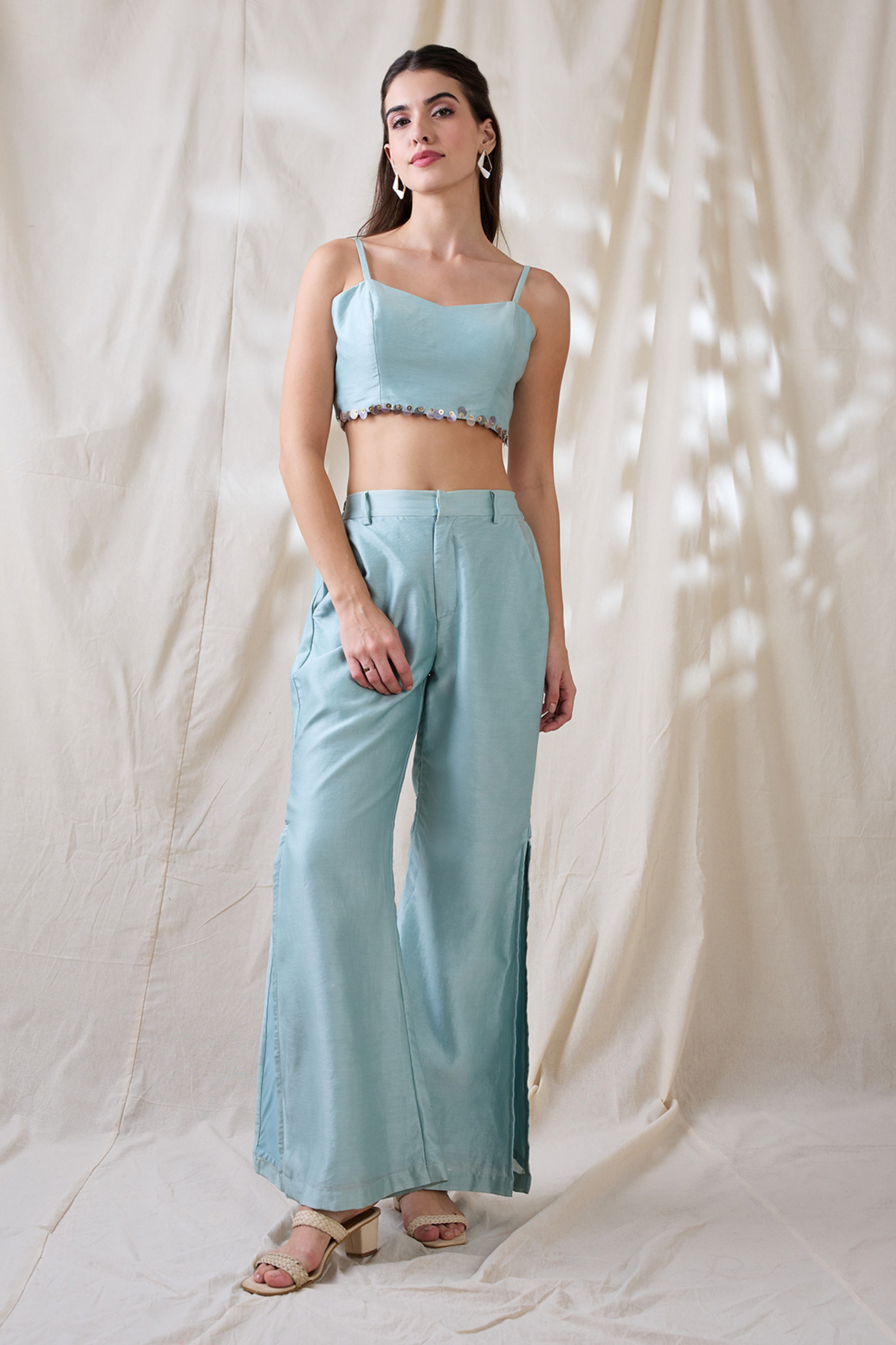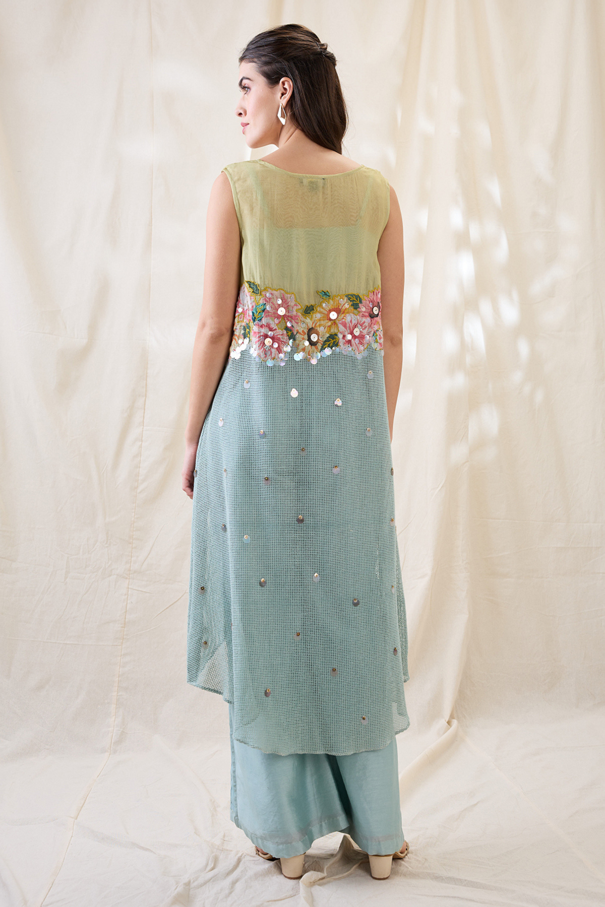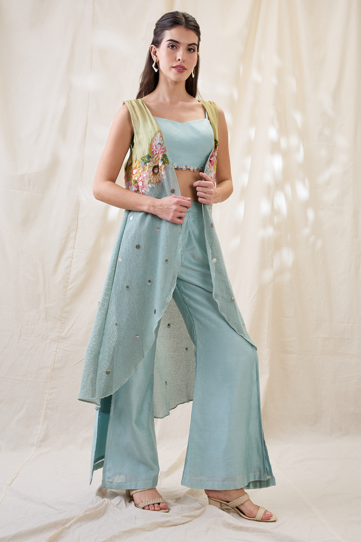 Sea green ravya solid bustier and pants paired with embroidered sleeveless jacket in cotton net.