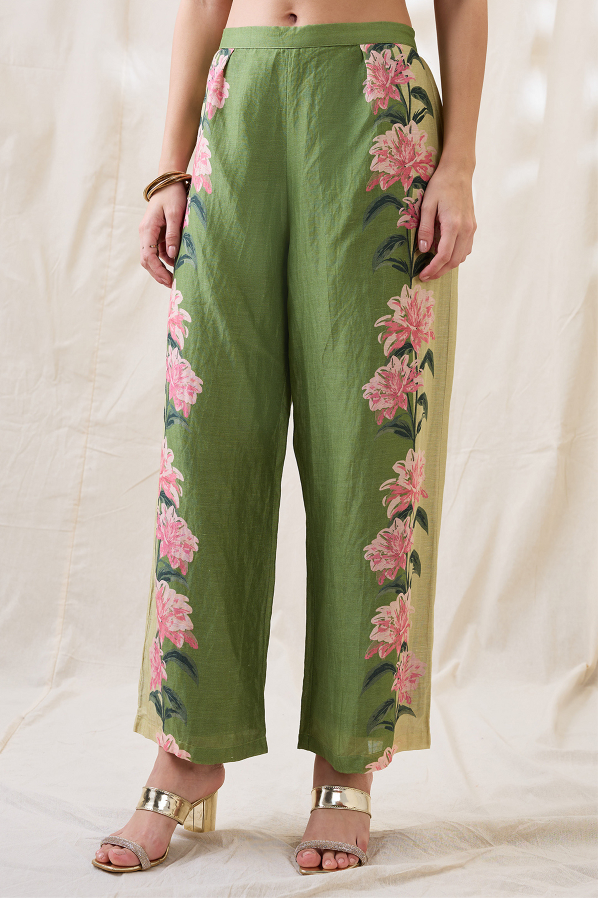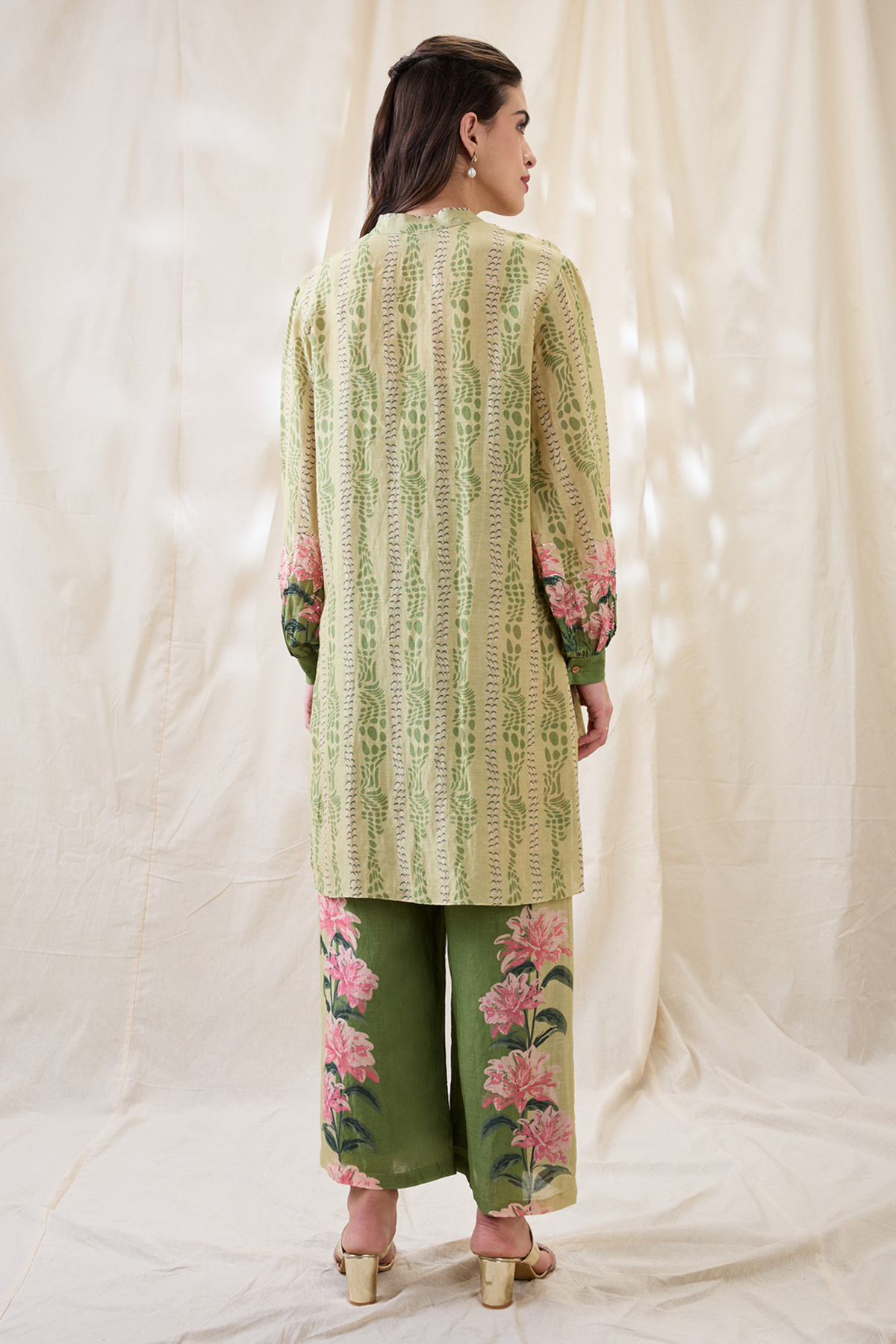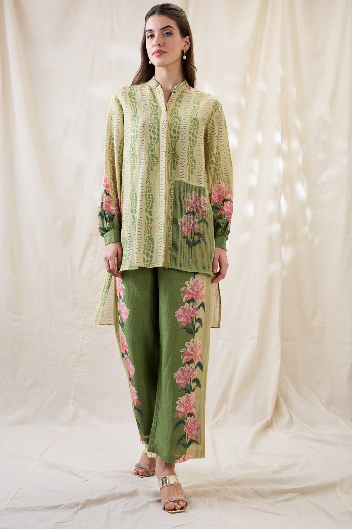 Green ravya embellished high-low shirt with full sleeves, paired with straight pants in linen..