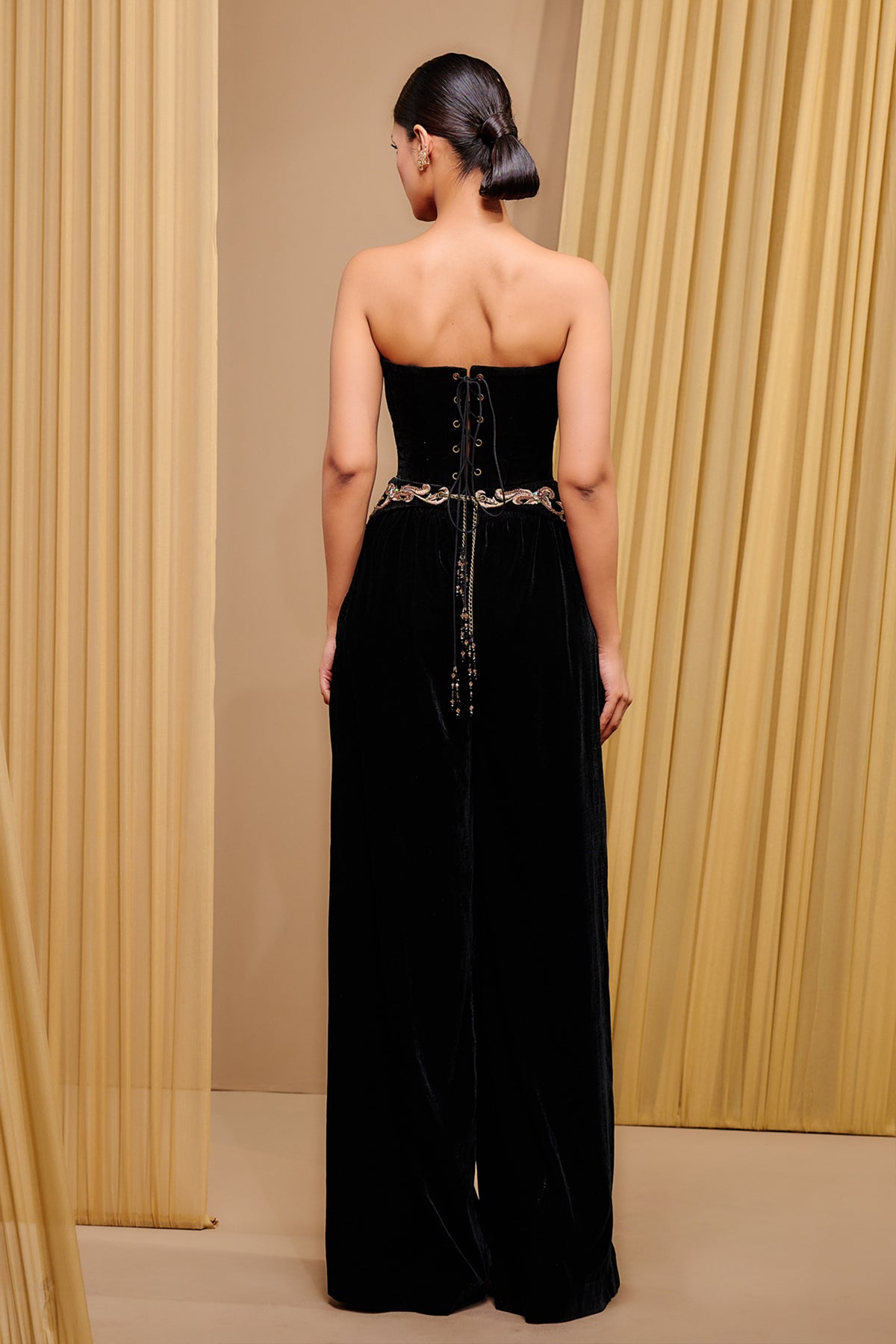 Velvet wide-leg trousers, paired with a crystal-embroidered corset