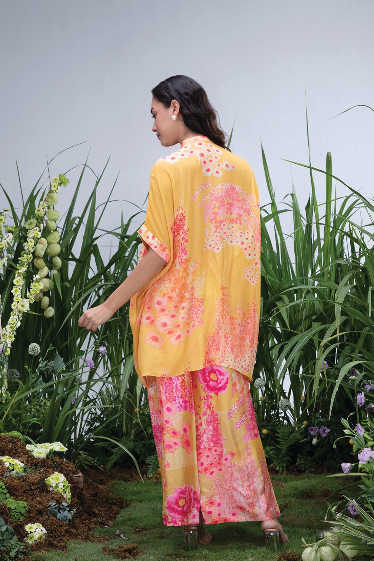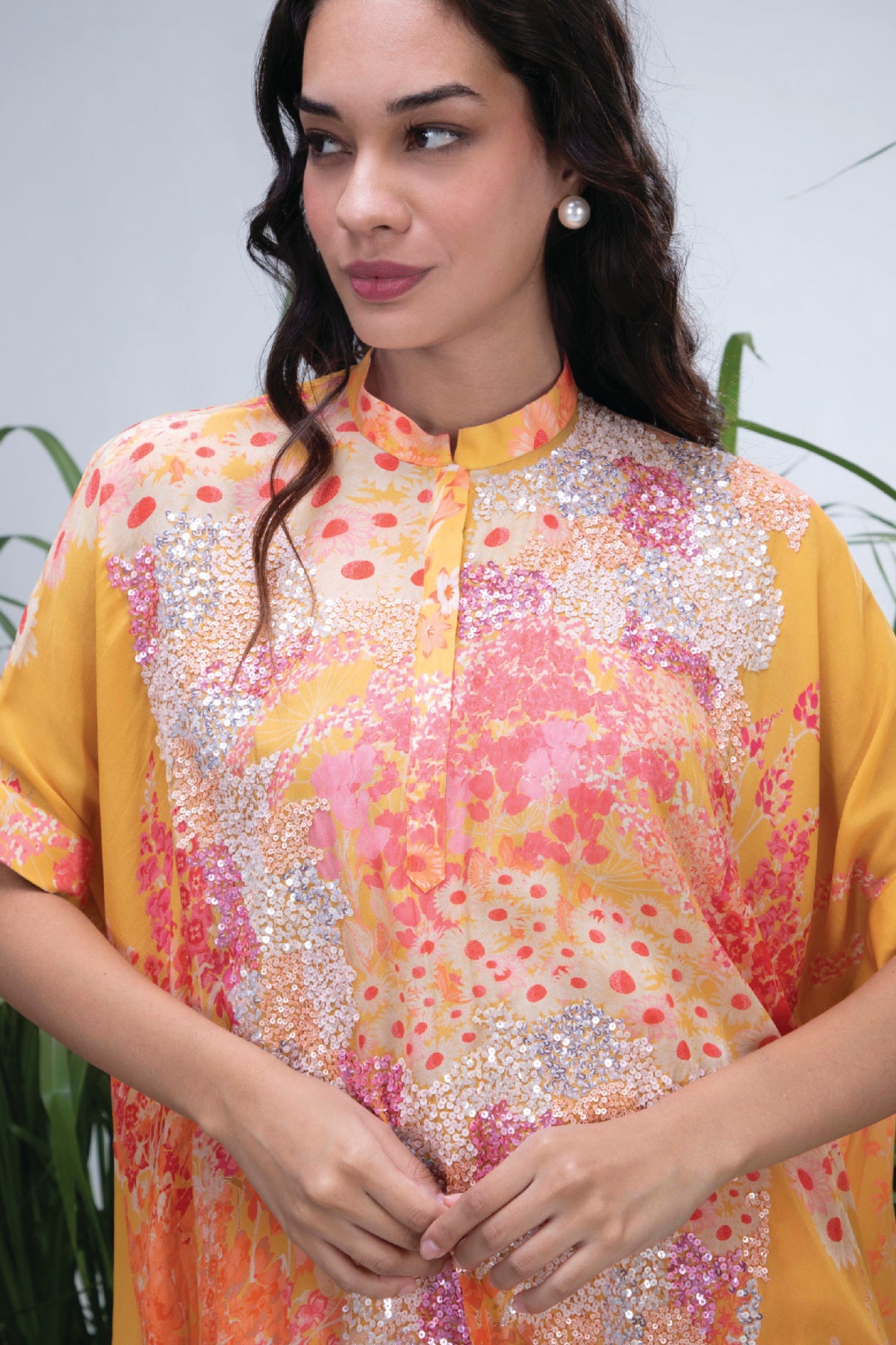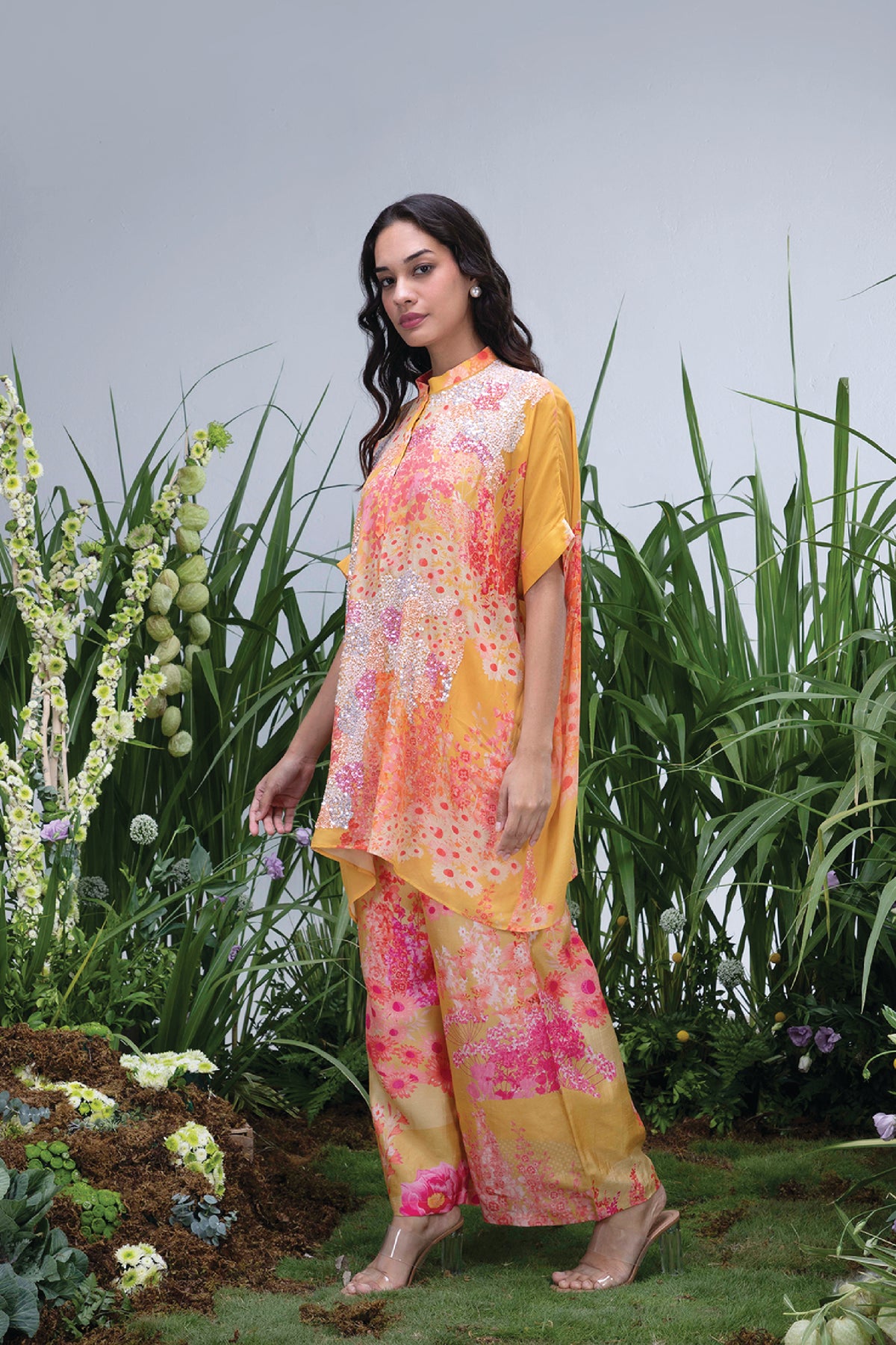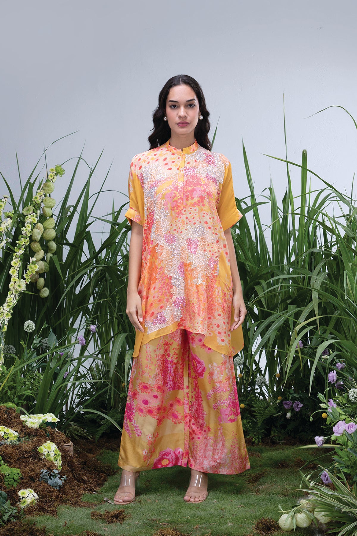 Our cardinal sets will be your go to outfits for comfort luxury made of natural bemberg crepe top with scattered sequence embroidery paired with printed silk bottoms.