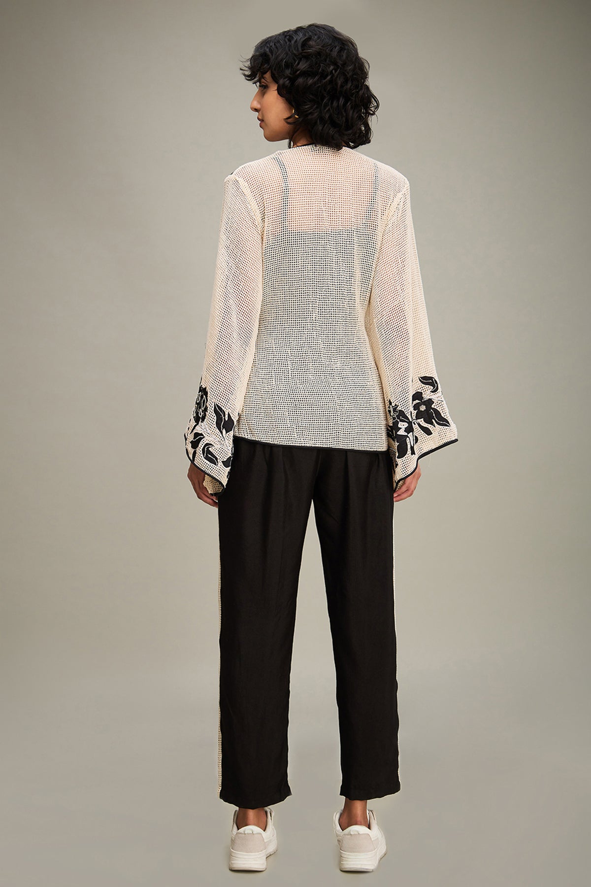 Off white applique short angarkha top in handloom cotton comes with a slip and black flared pants in linen slub cotton.