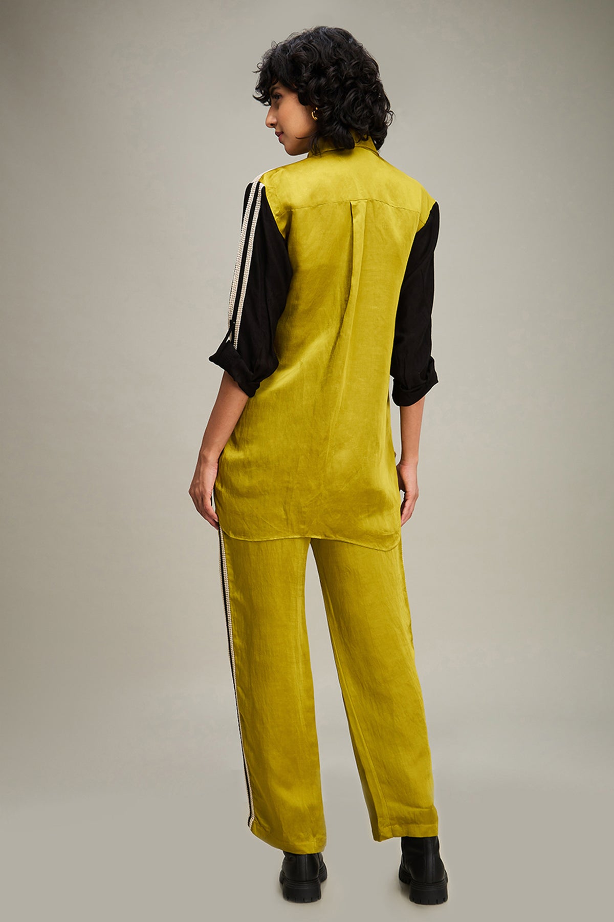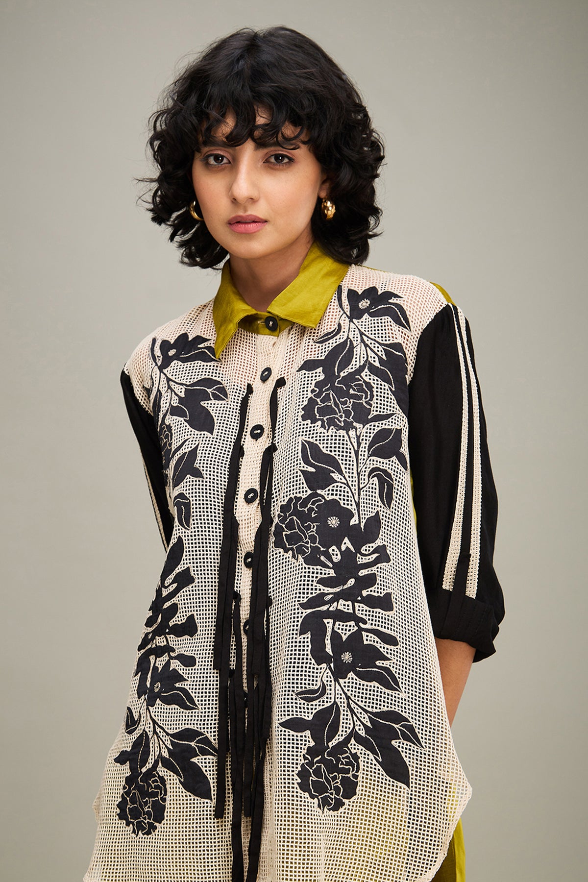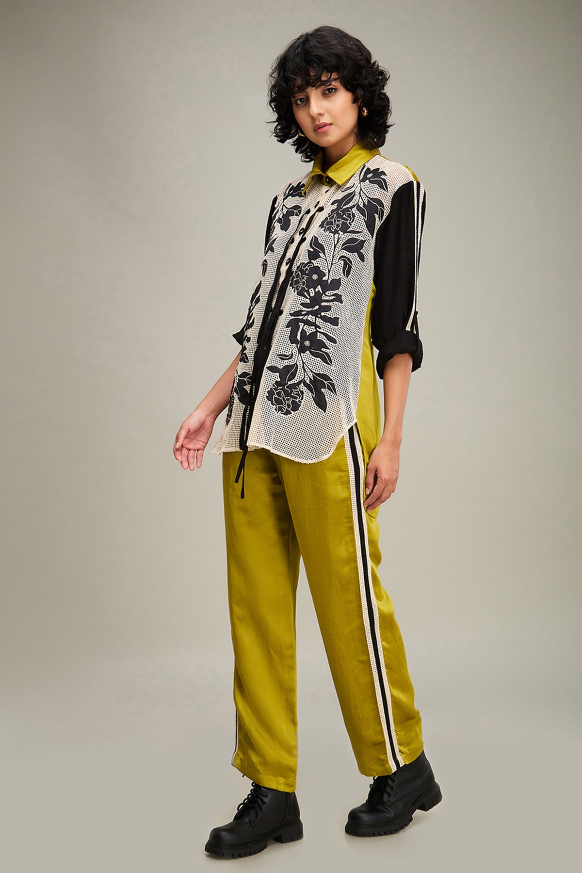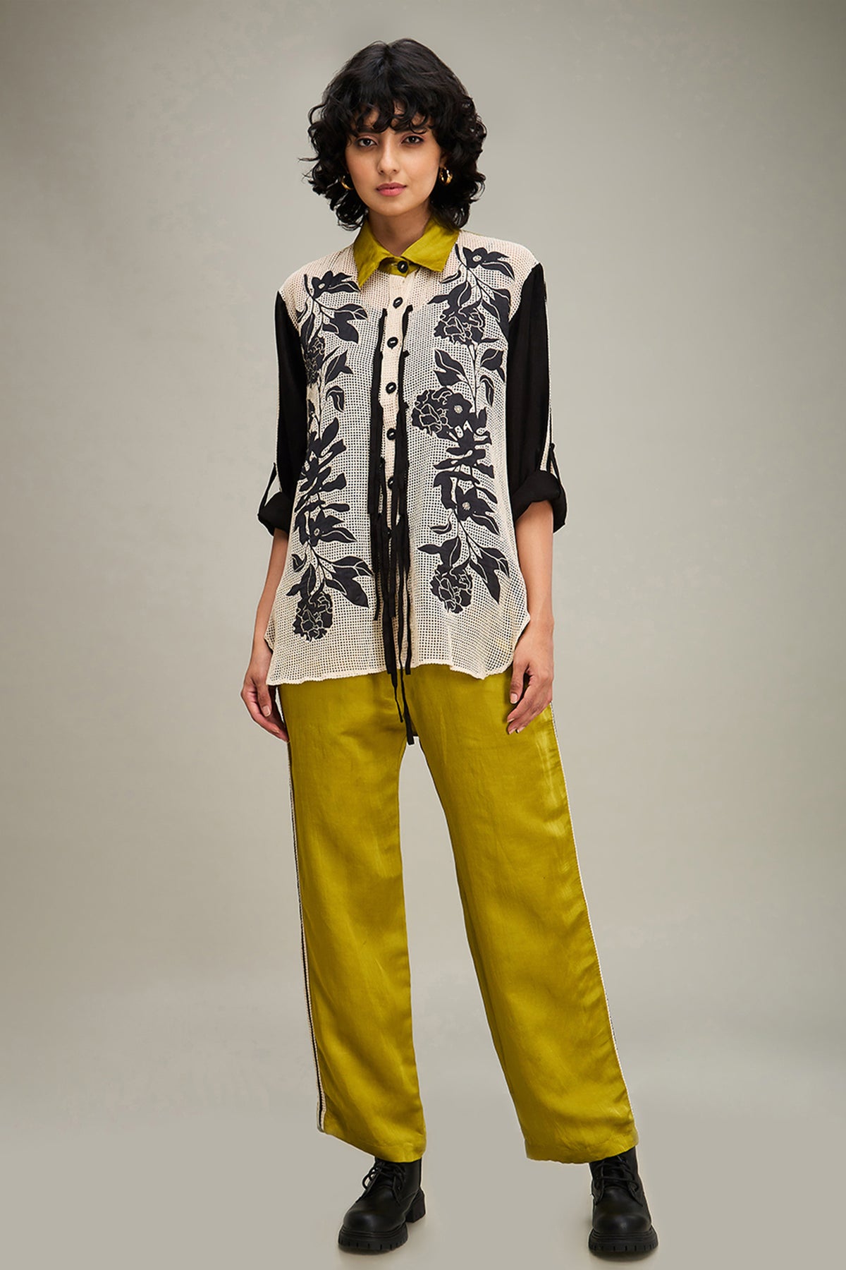 Black zinnia appliqued shirt with front strings, paired with solid green pants in satin.