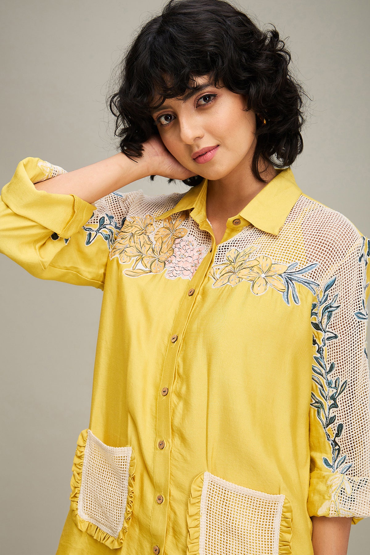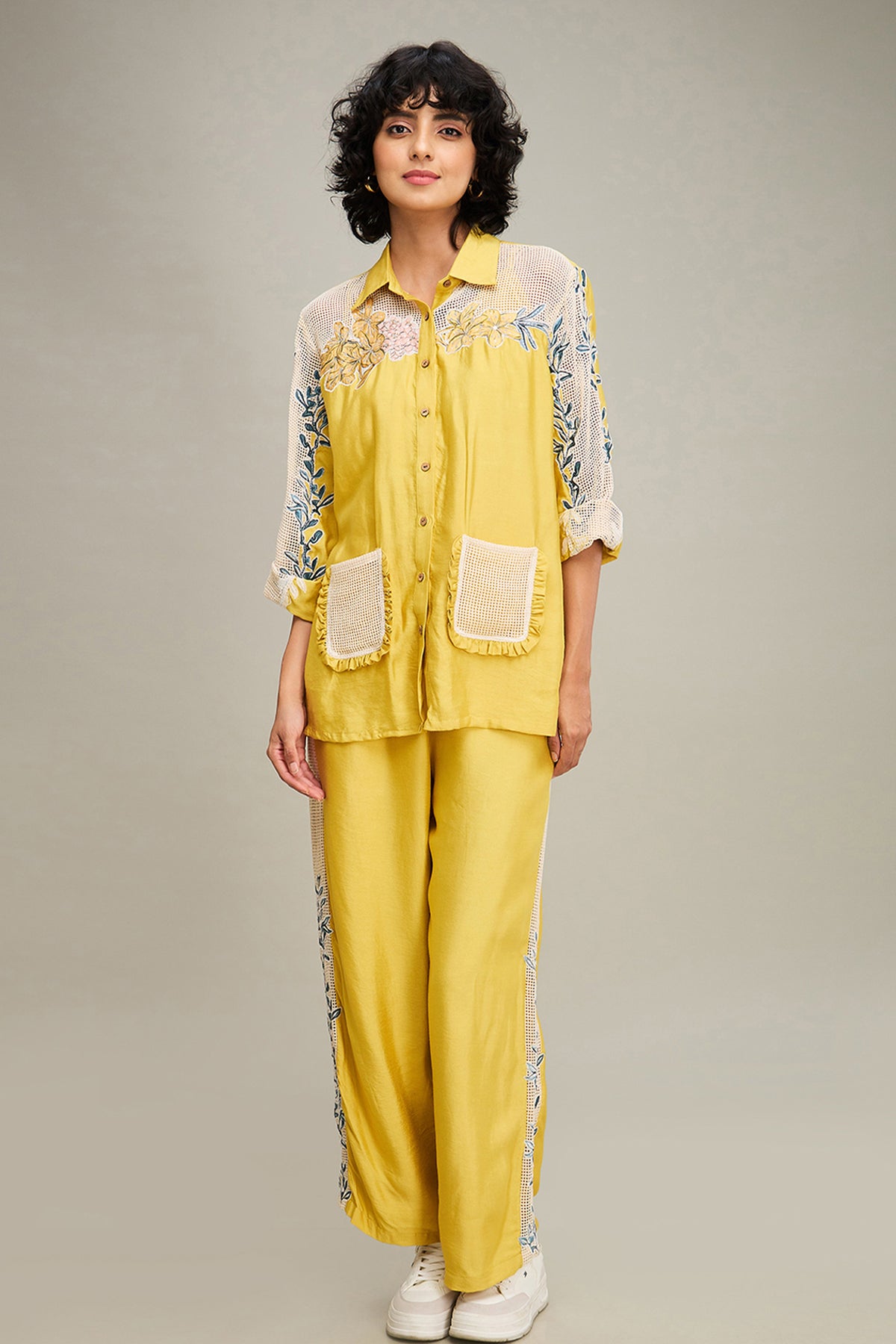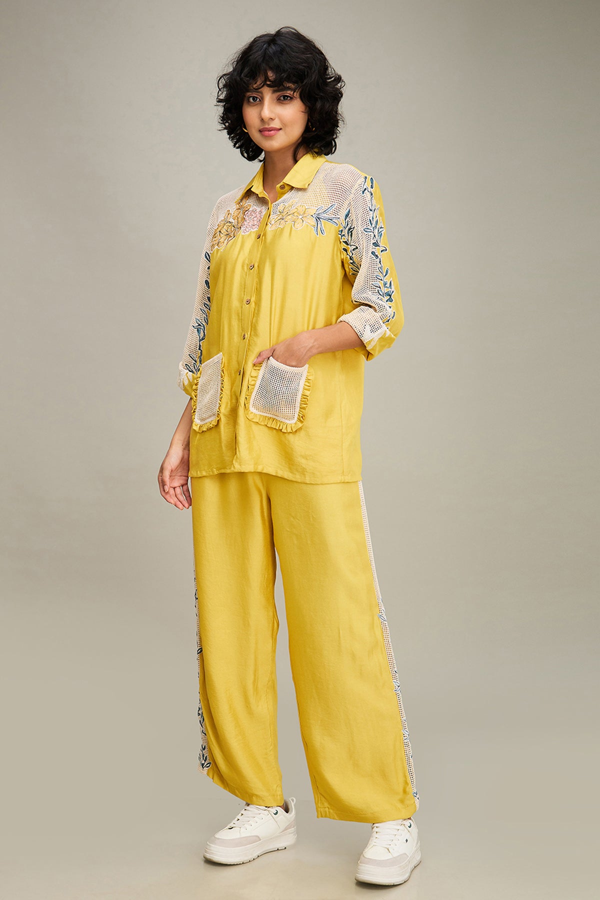 Yellow zinnia applique shirt with full sleeves paired with pants in handloom cotton and chanderi.