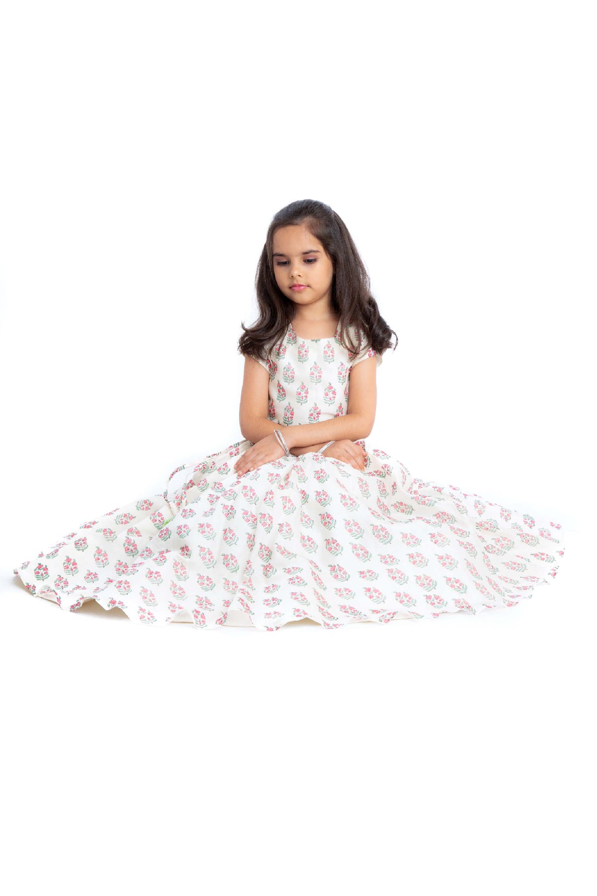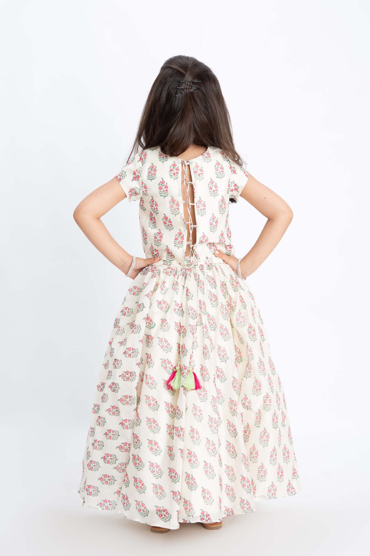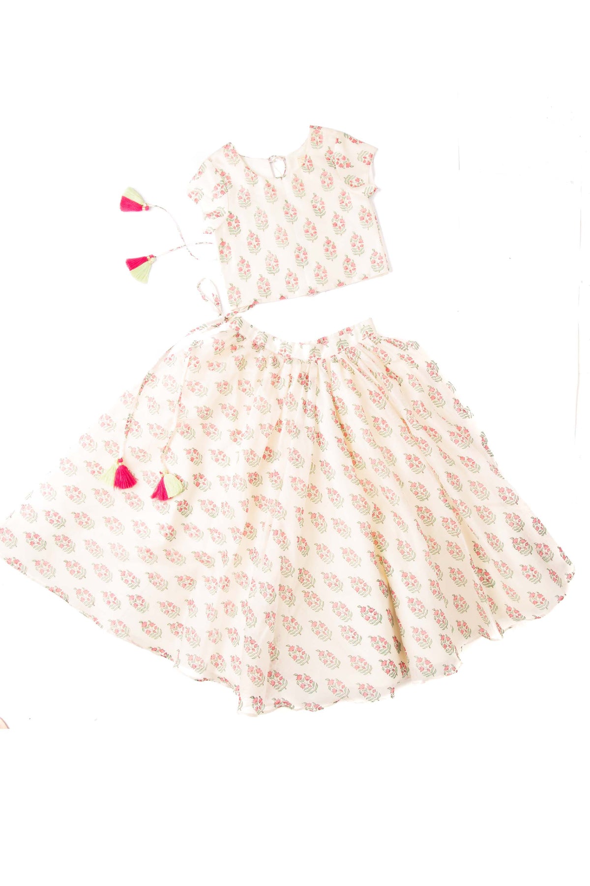 White chanderi printed blouse with back knot opening is paired with a pure soft cotton printed chanderi ghagra skirt with green pink tassels and gold piping hemfinish making it a perfect festive outfit.