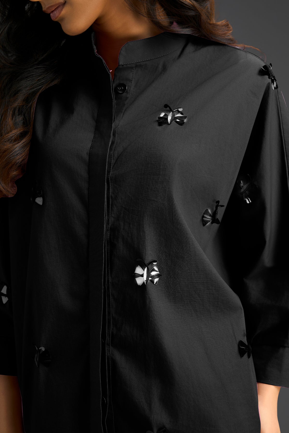 Black cotton co-ord set featuring a pleated cuff shirt and relaxed shorts, detailed with embellished butterflies