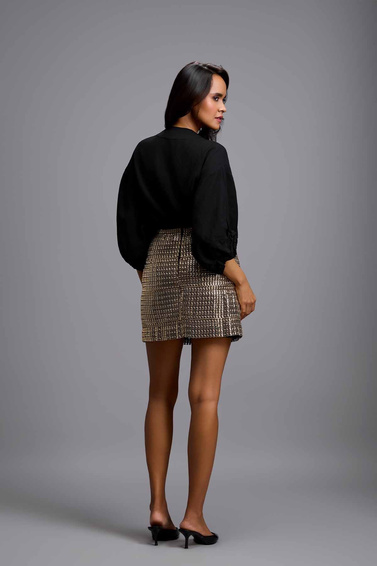 Black oversized shirt paired with a metallic gold textured mini skirt