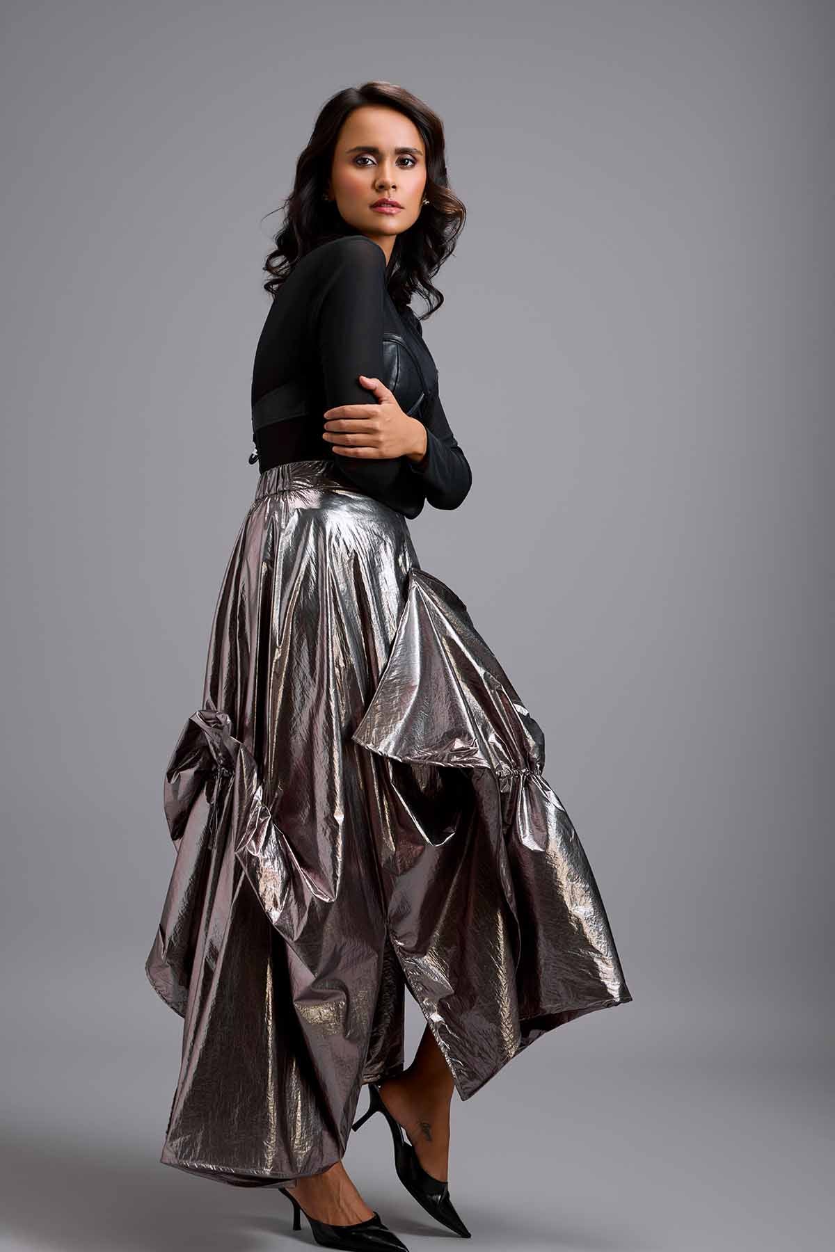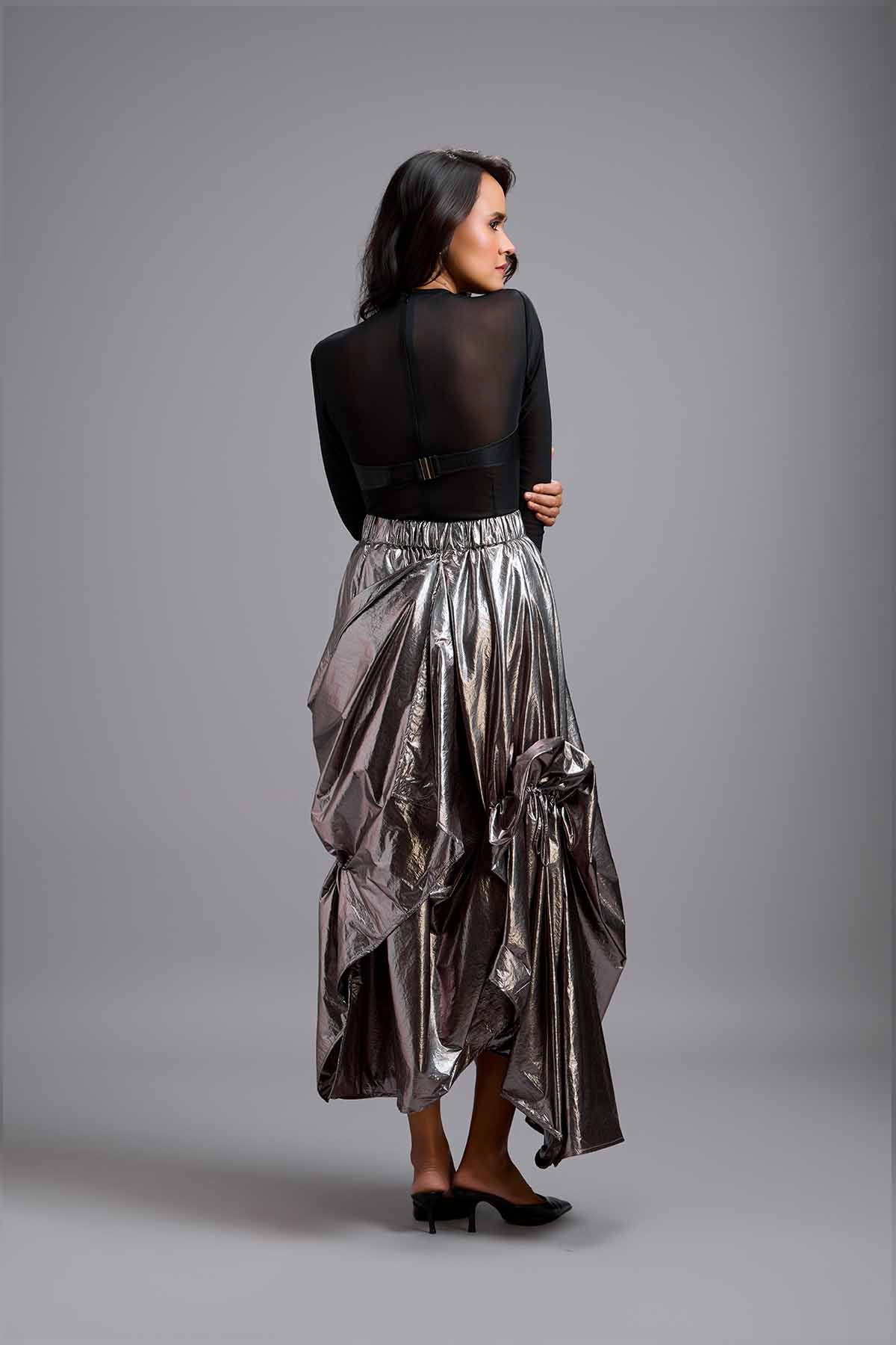 Black sheer mesh corset top paired with gunmetal draped maxi skirt.
