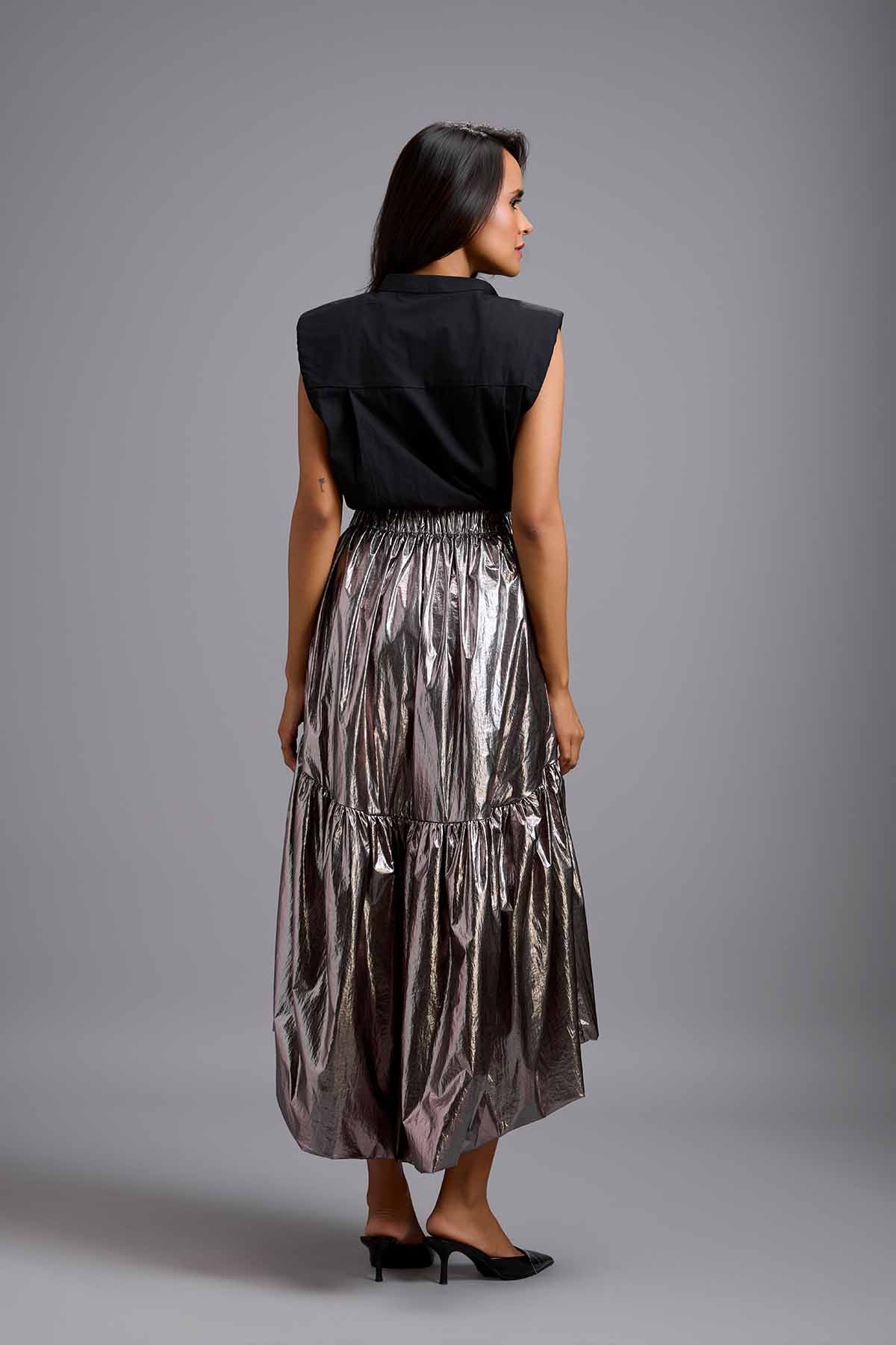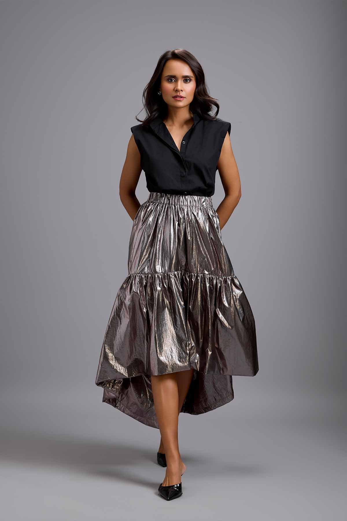 Black sleeveless shirt paired with a dramatic metallic gunmetal high-low skirt