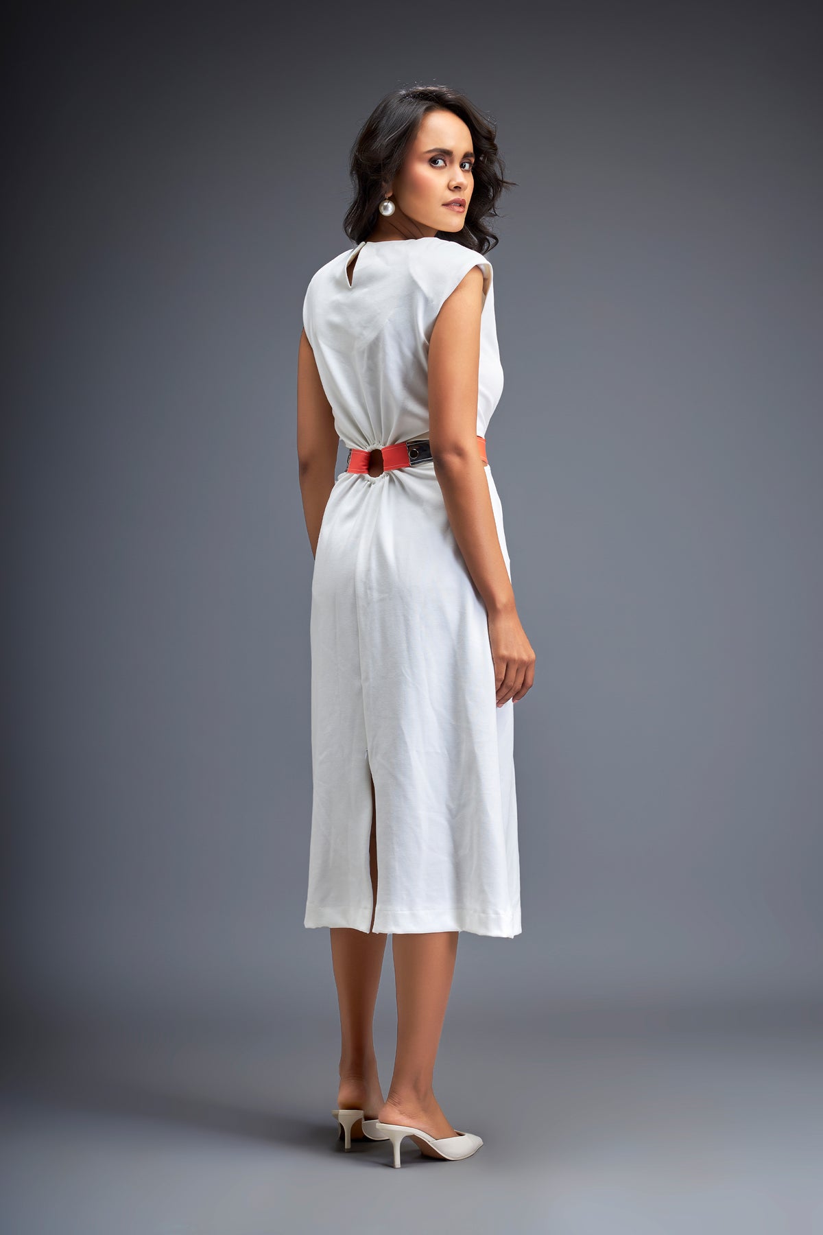 Gathered waist dress with structured sleeves, bold contrast accentuating belt.