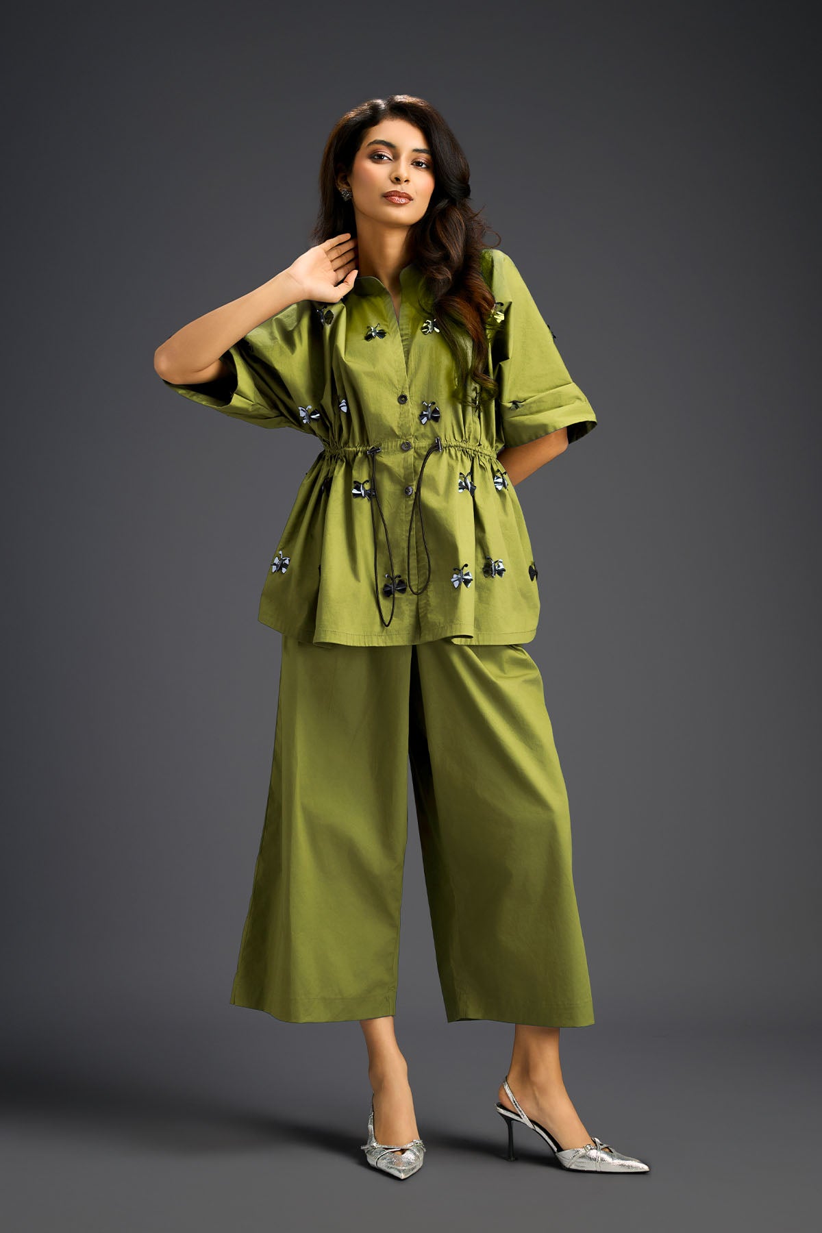 Green cotton co-ord set with a drawstring-waist shirt and wide-leg pants, detailed with delicate hand-embellished butterfly motifs