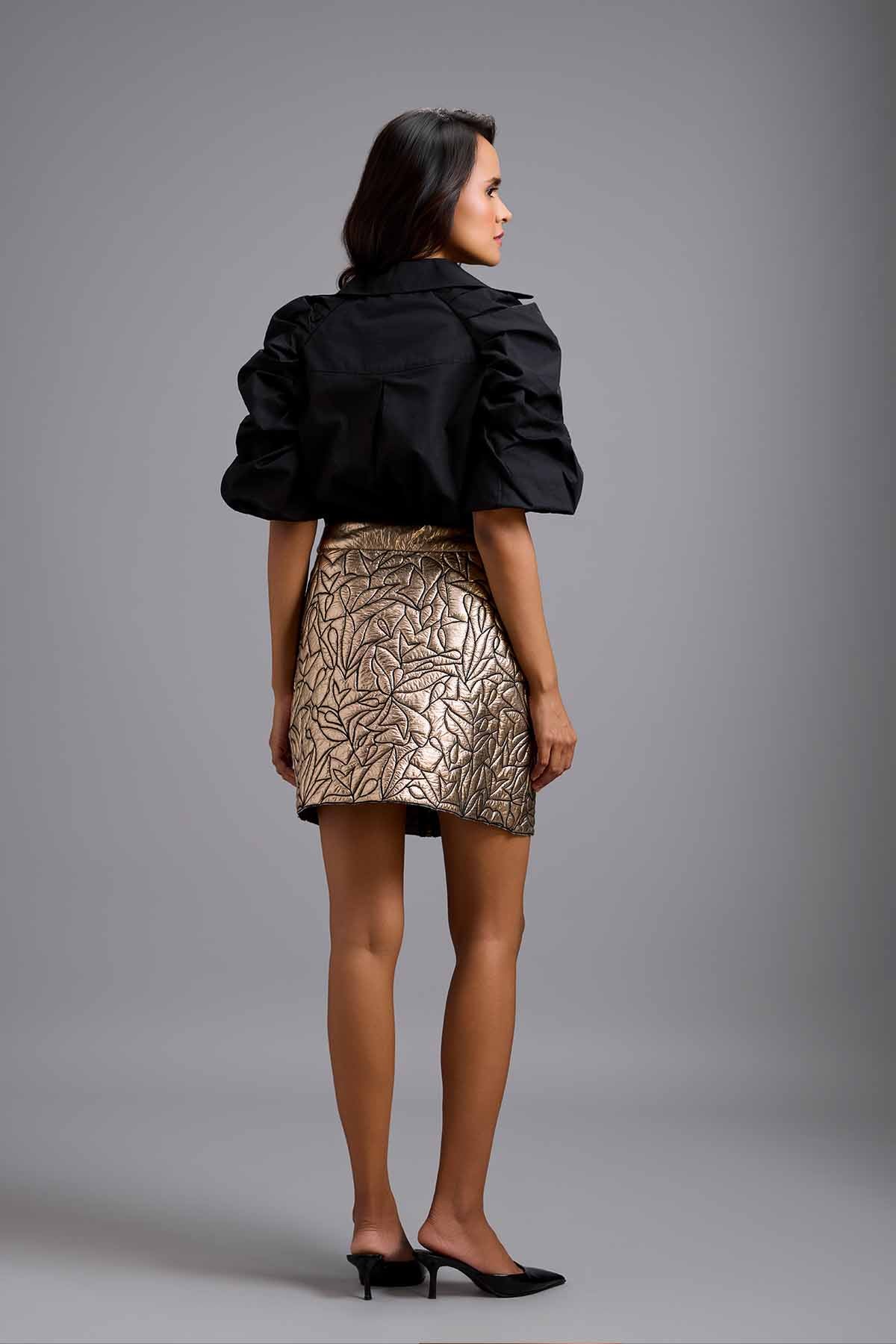Metallic gold button-down mini skirt featuring leaf pattern