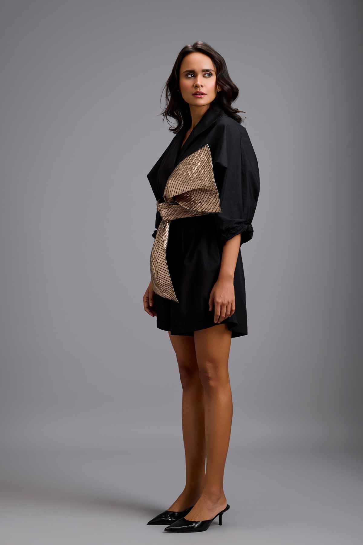 Play suit with a wide notched lapel collar and cinched at the waist with a large, oversized gold bow.