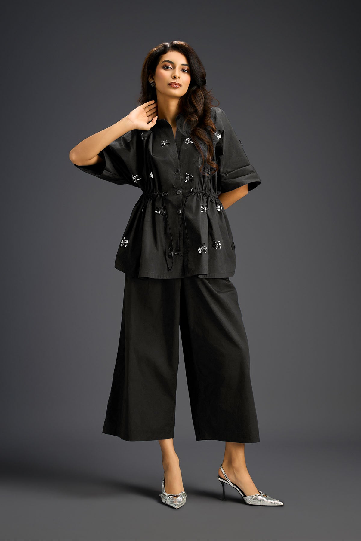 Black cotton co-ord set with a drawstring-waist shirt and wide-leg pants, detailed with delicate hand-embellished butterfly motifs