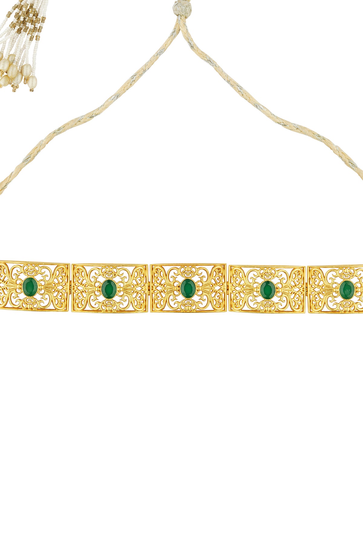 Tapping on our love for timeless motifs and our eternal obsession for gold is this glorious 22kt gold plated choker necklace abundant with intricate filigree motifs. The necklace is a fine example of the time honoured filigree craft which uses bent wires to create a lightweight, graceful and lace like patterns as in this necklace. Look closely to find chatham emeralds studded at the center of each motif to enhance the divine grace of the necklace.Ā