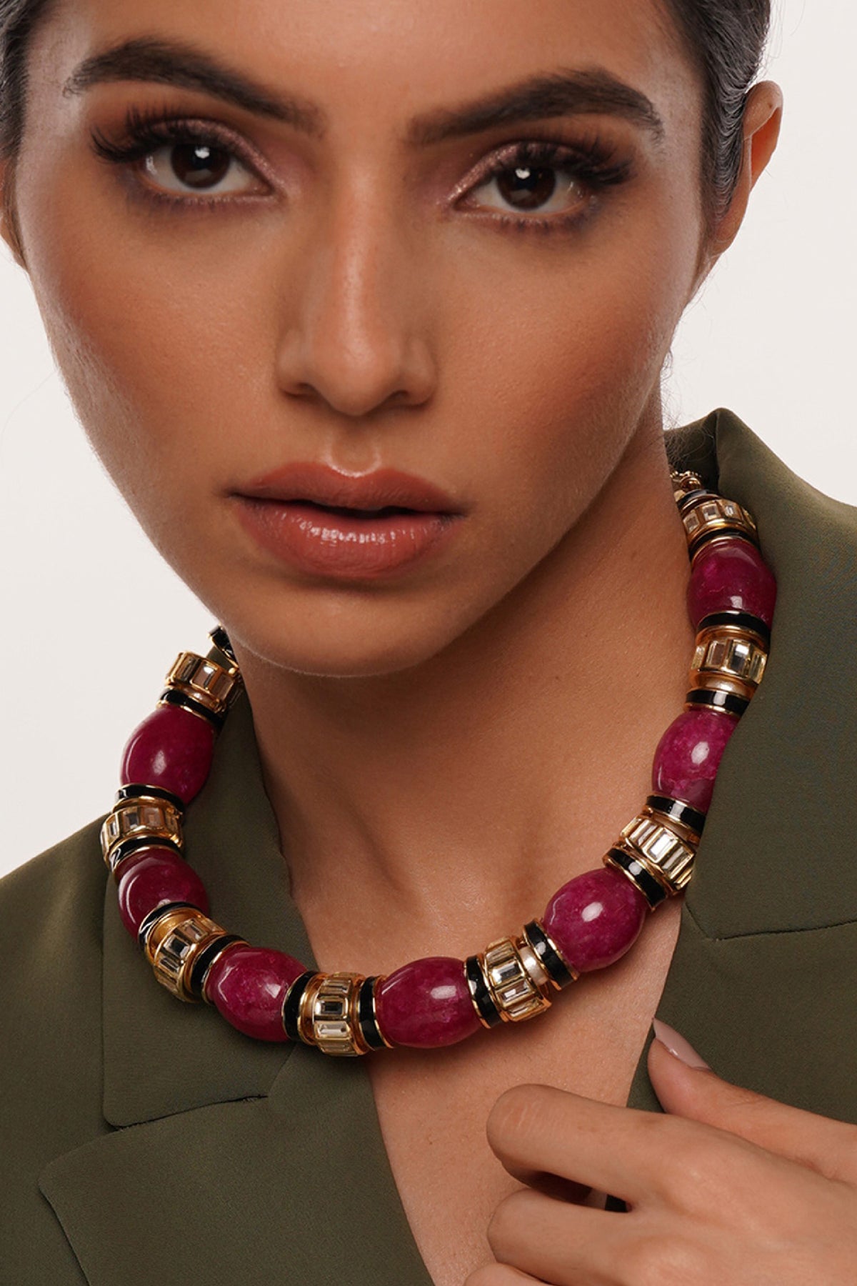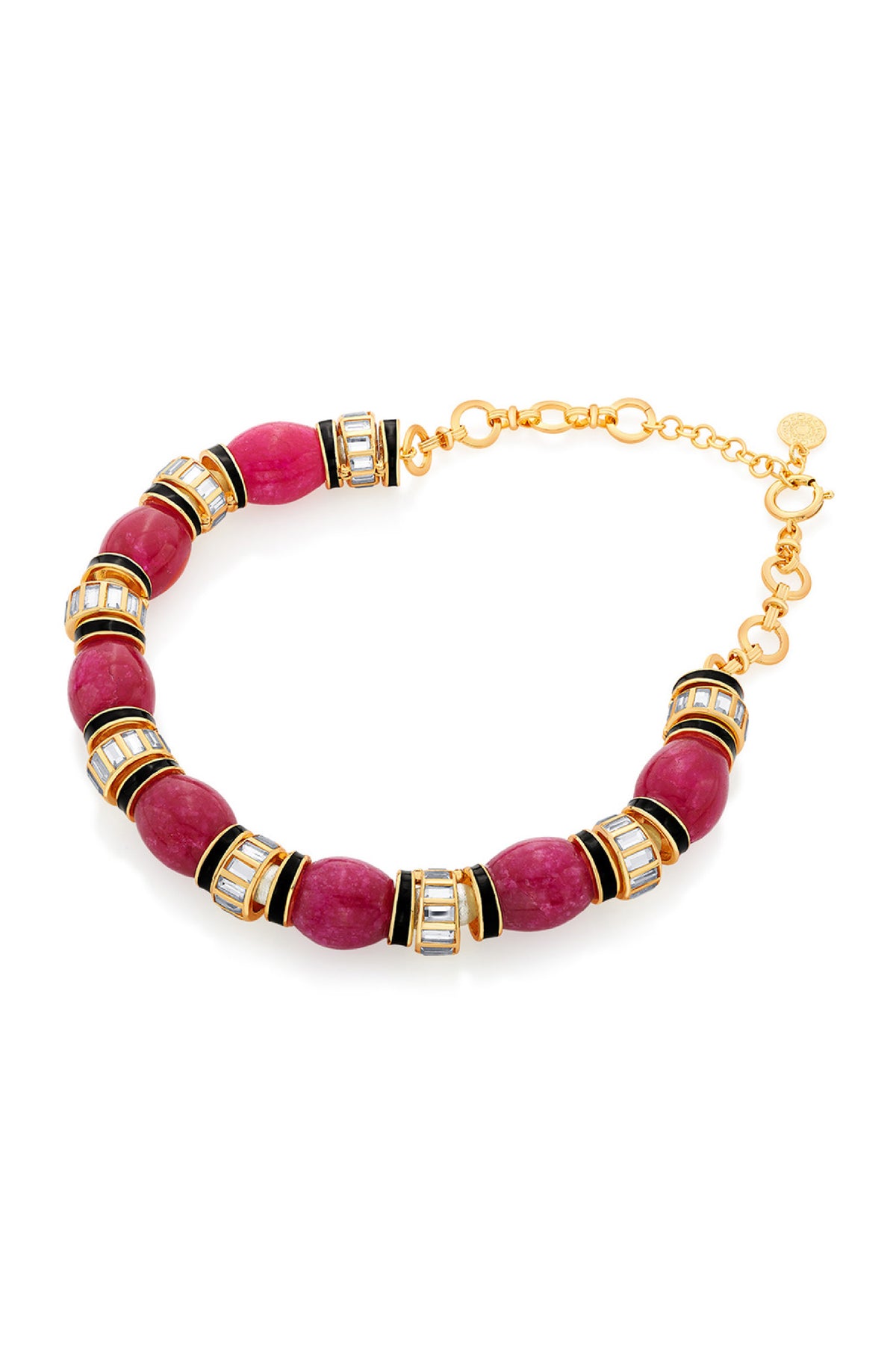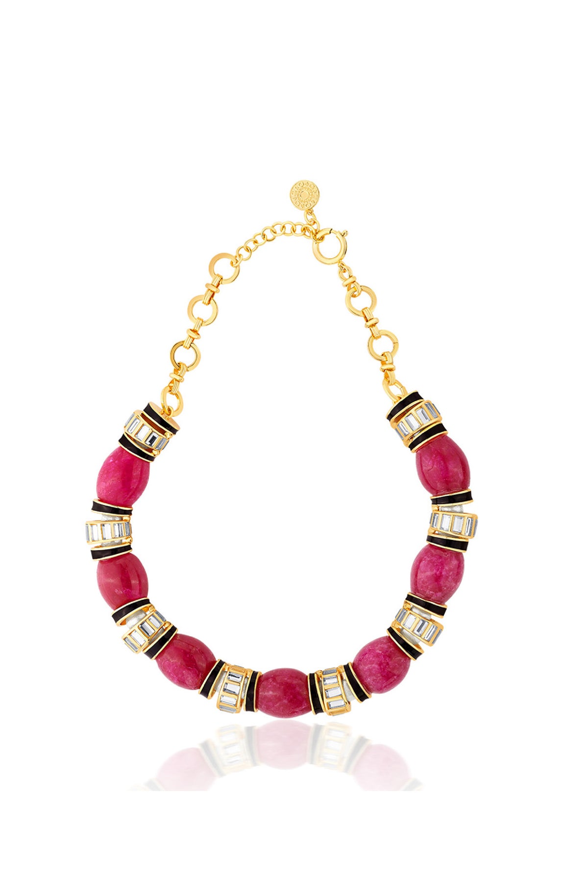 This statement choker features hand-cut mirrors, green quartz stones and is plated in 18-karat gold. Pair this with matching earrings for maximum impact.