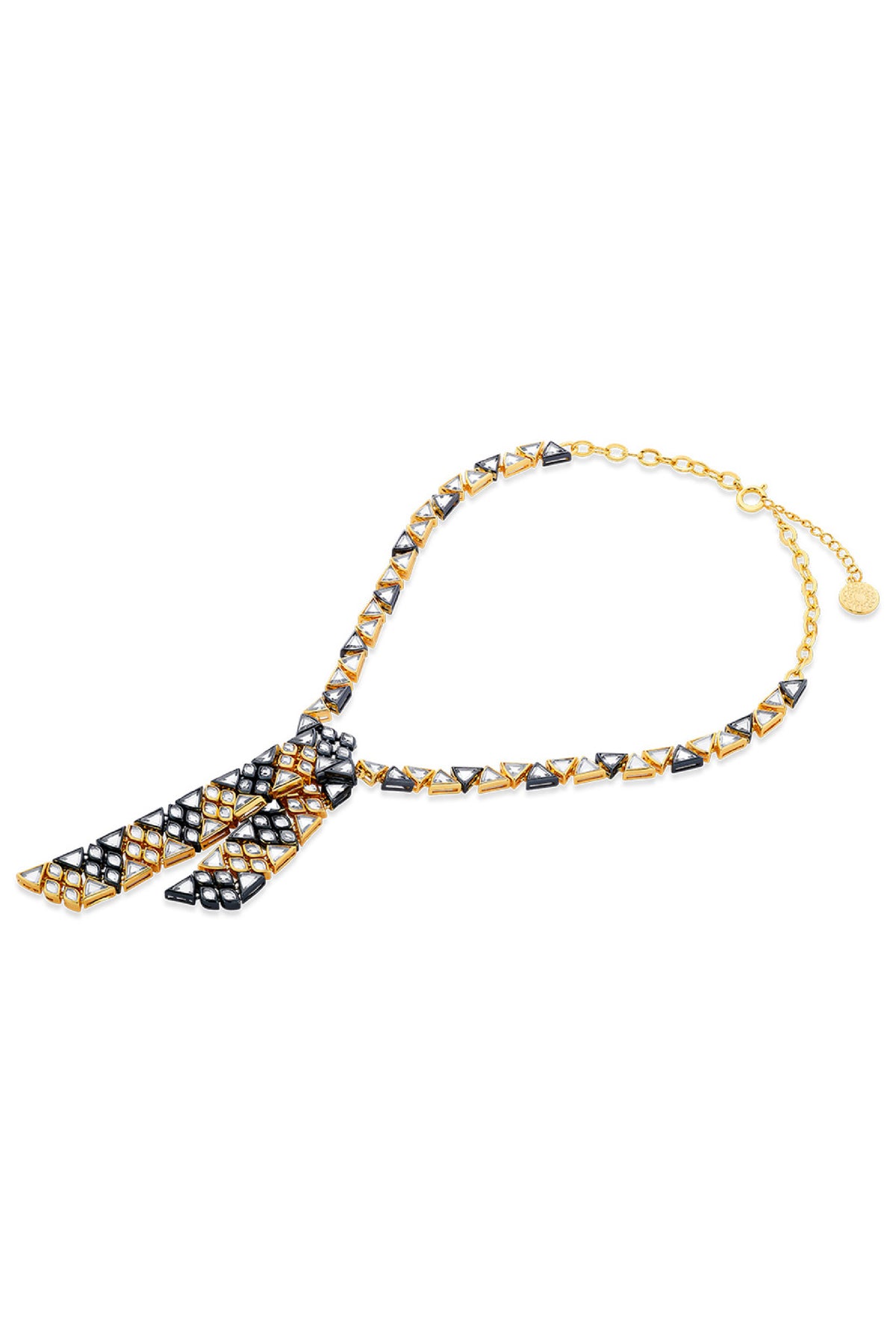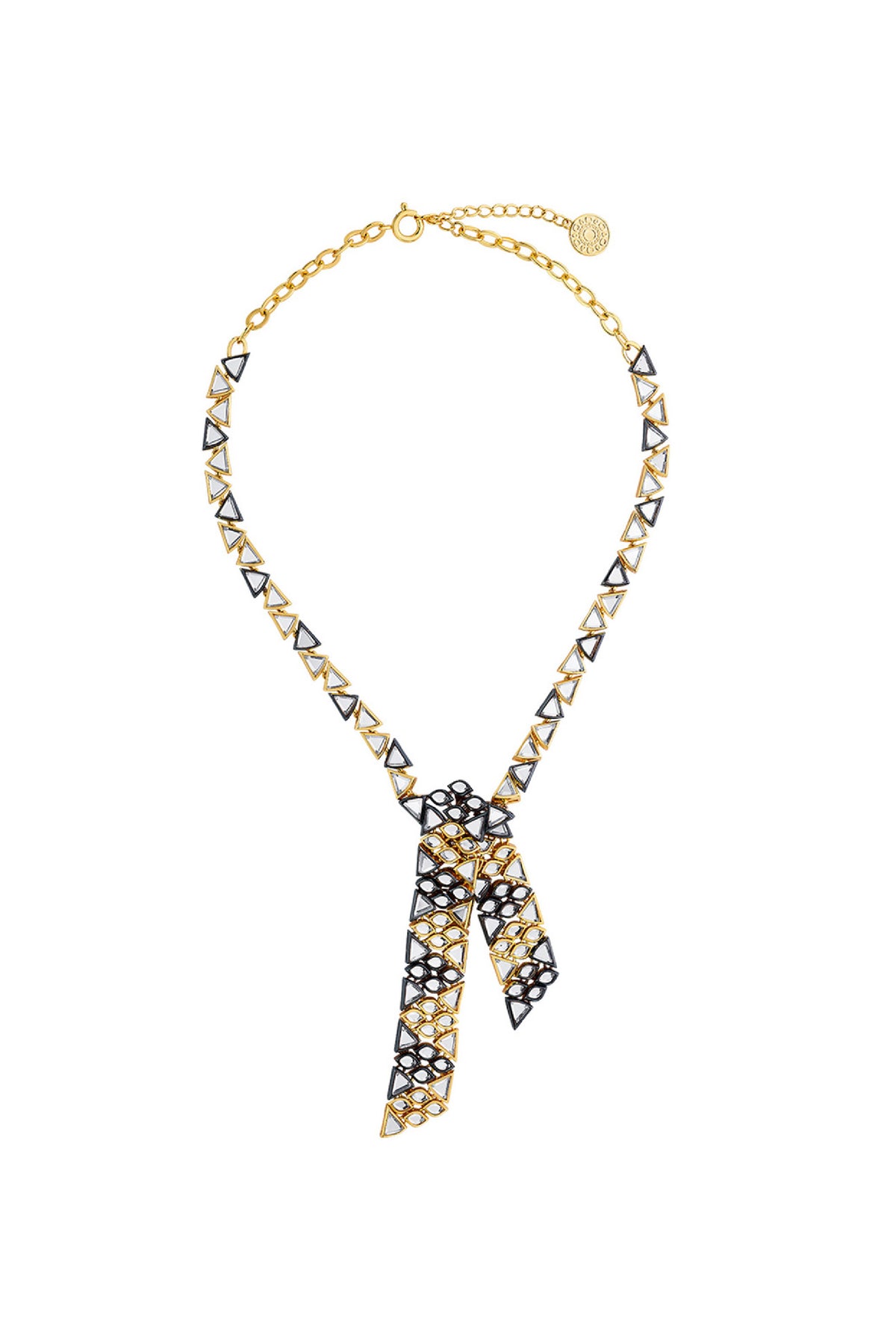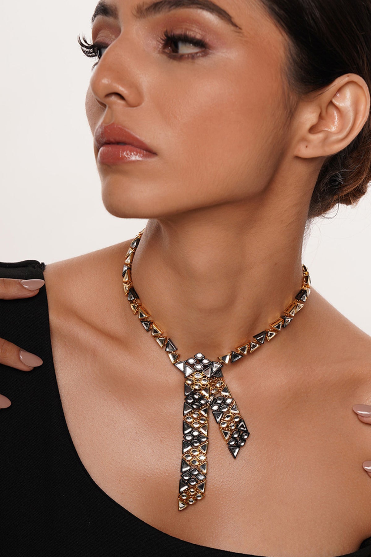 This statement necklace features an asymmetrical shape alongside two-tone plating in black and 18-karat gold. The best thing about this piece? It works well for a classic shirt as it does for a glamorous sari.